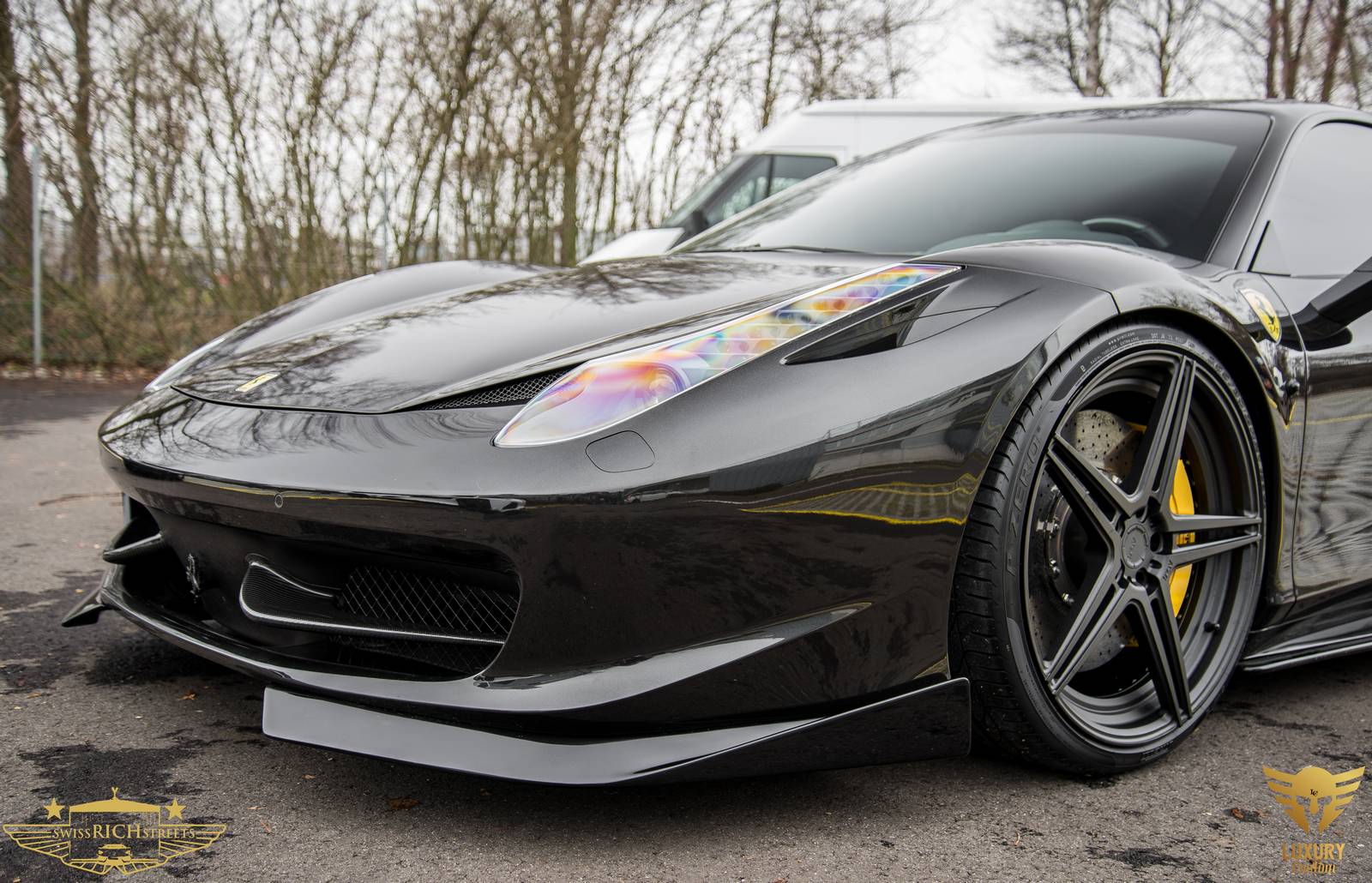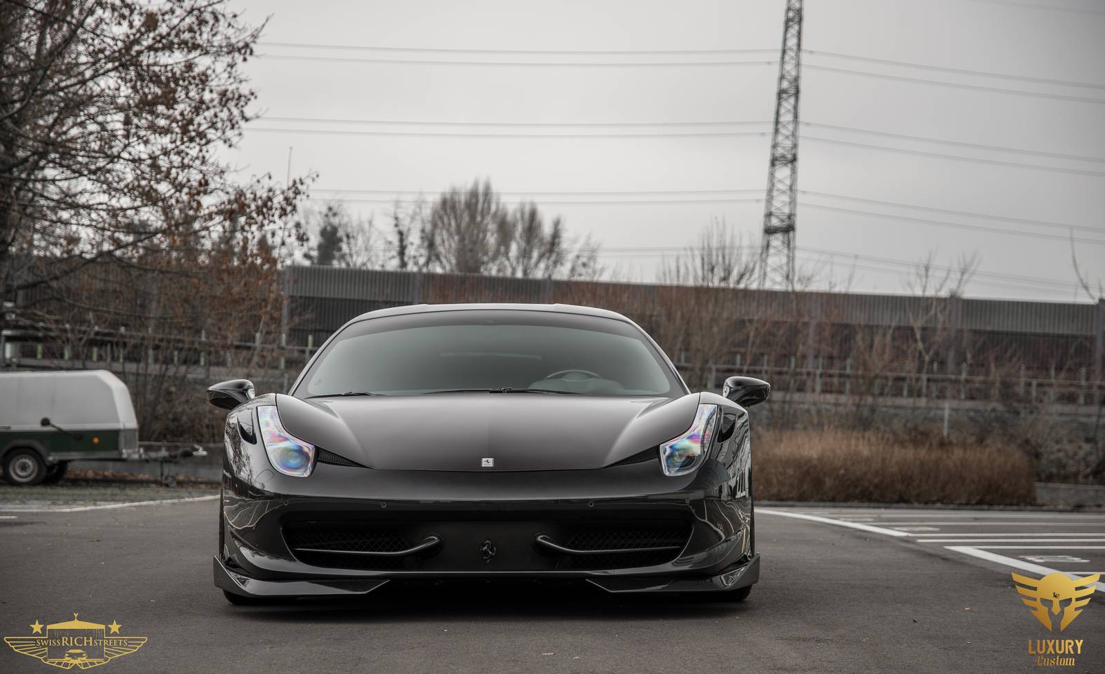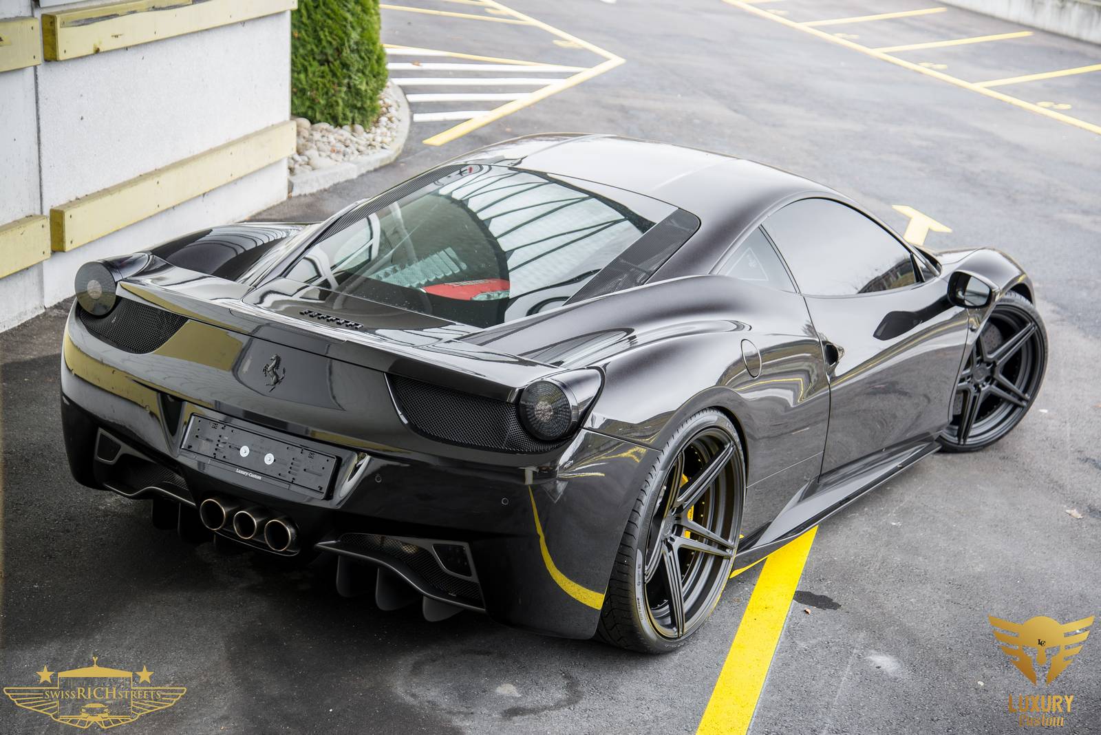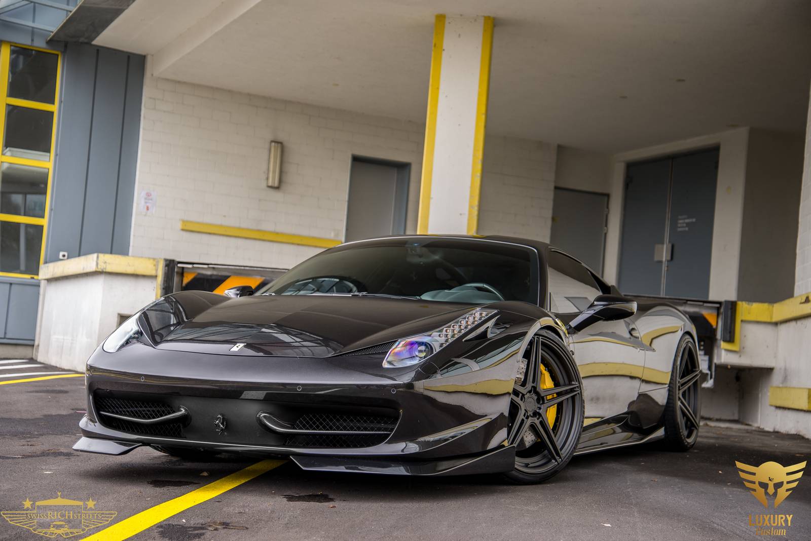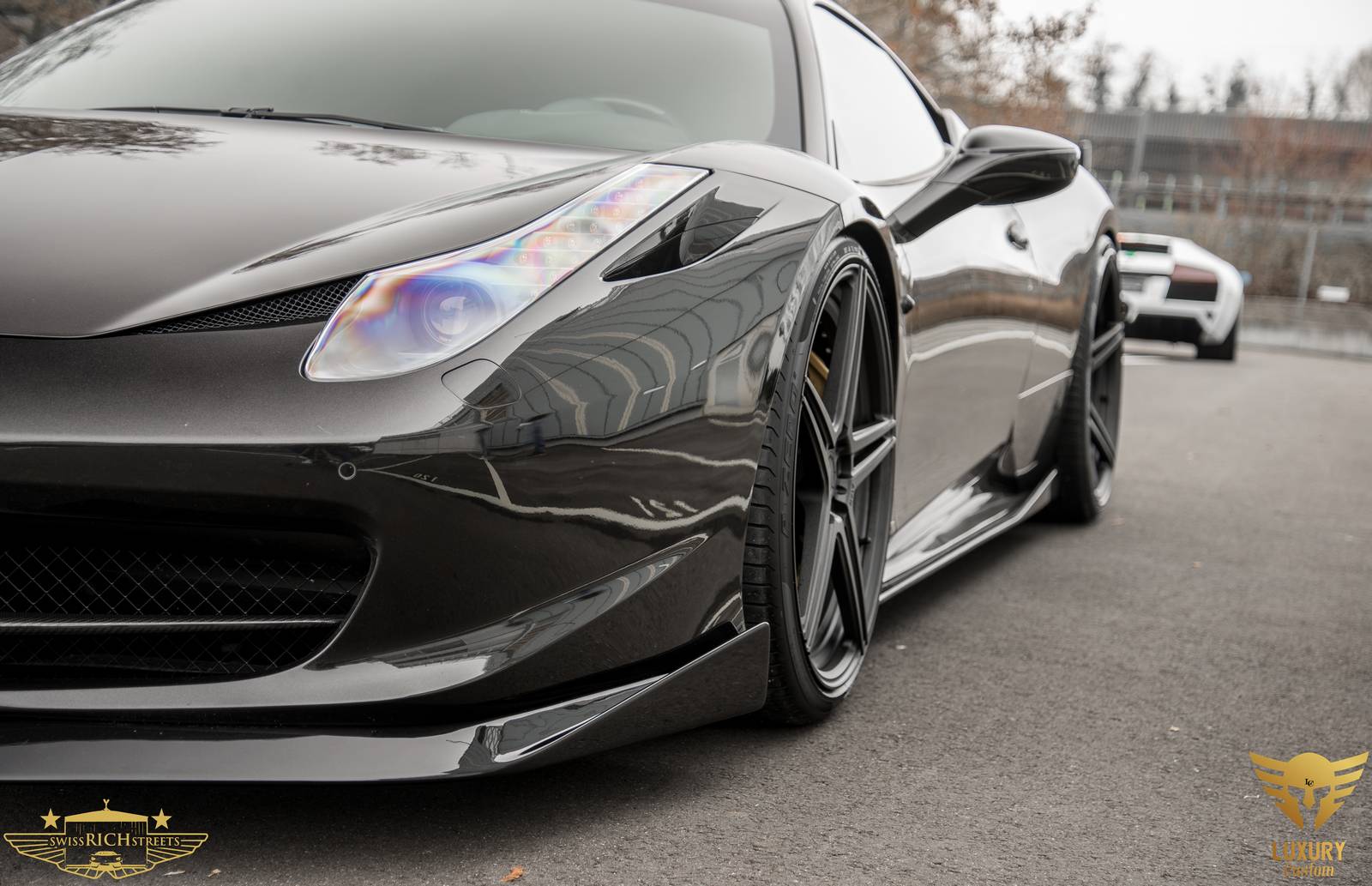 我們來欣賞一下眼前這部執行black on black計畫相當徹底的Ferrari 458 Italia,由瑞士(Switzerland)改裝廠Luxury Custom所操刀,首先將鍍鉻Ferrari銘板與尾燈施以燻黑處理並選用暗黑色系隔熱紙,另外換裝知名品牌ADV.1 Wheels的黑色輪圈、加裝前下巴、碳纖維氣壩定風翼與側裙組,再透過高低軟硬可調式避震器將車身降低,唯獨將煞車卡鉗保留著黃色塗裝,呼應葉子板上的Ferrari車隊金屬盾牌徽飾,這樣簡單塑造之後,讓這部Ferrari 458 Italia呈現出迷人無比的高質感。