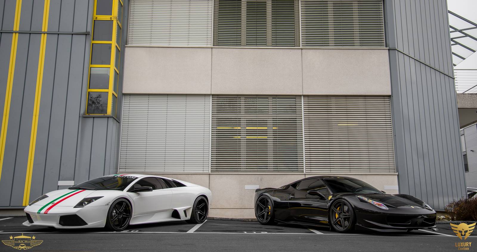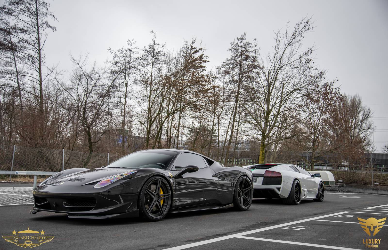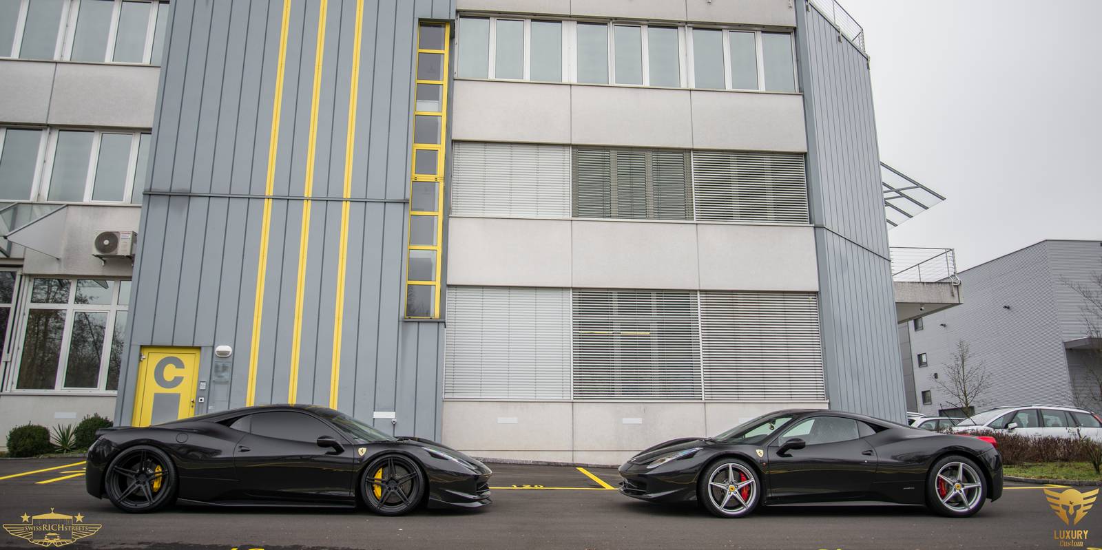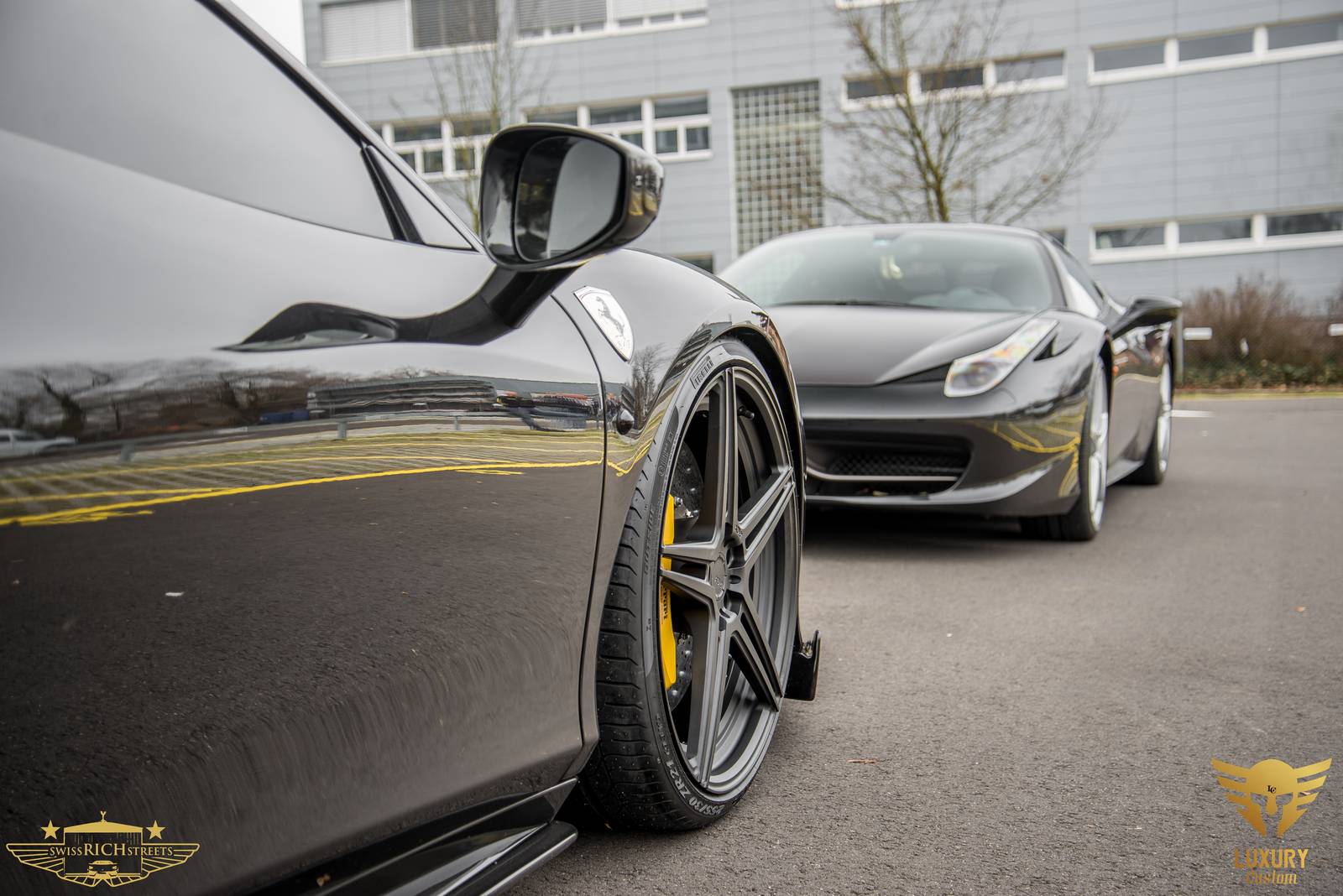 我們來欣賞一下眼前這部執行black on black計畫相當徹底的Ferrari 458 Italia,由瑞士(Switzerland)改裝廠Luxury Custom所操刀,首先將鍍鉻Ferrari銘板與尾燈施以燻黑處理並選用暗黑色系隔熱紙,另外換裝知名品牌ADV.1 Wheels的黑色輪圈、加裝前下巴、碳纖維氣壩定風翼與側裙組,再透過高低軟硬可調式避震器將車身降低,唯獨將煞車卡鉗保留著黃色塗裝,呼應葉子板上的Ferrari車隊金屬盾牌徽飾,這樣簡單塑造之後,讓這部Ferrari 458 Italia呈現出迷人無比的高質感。