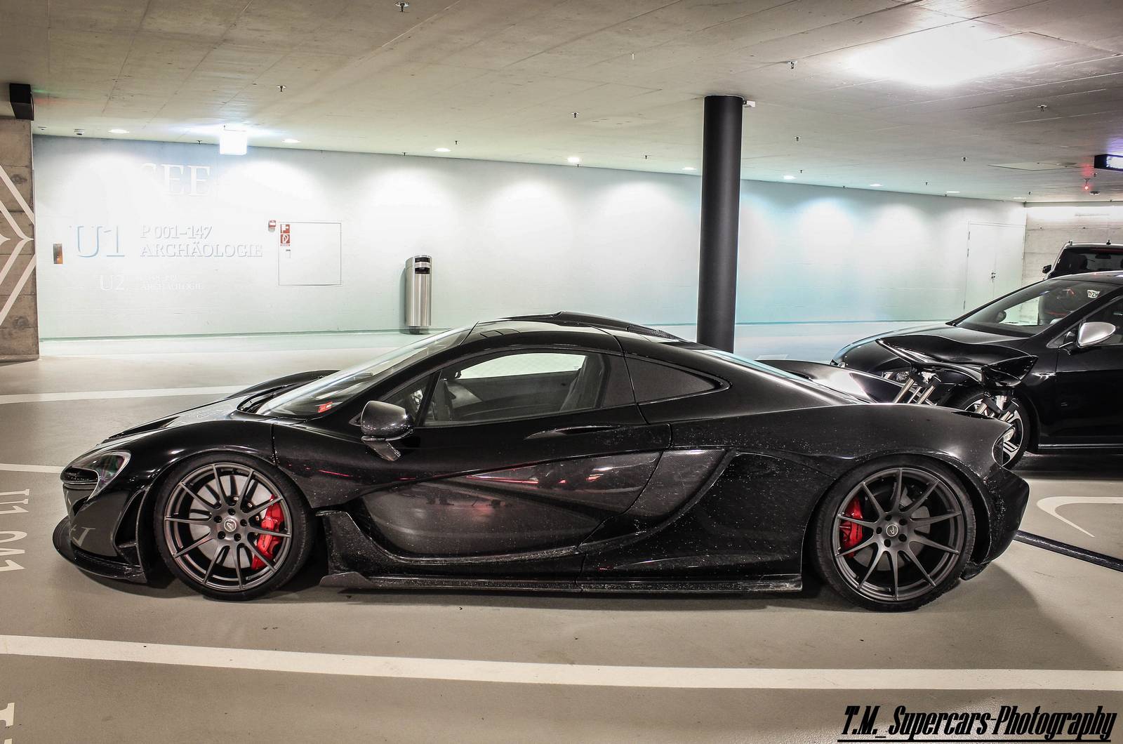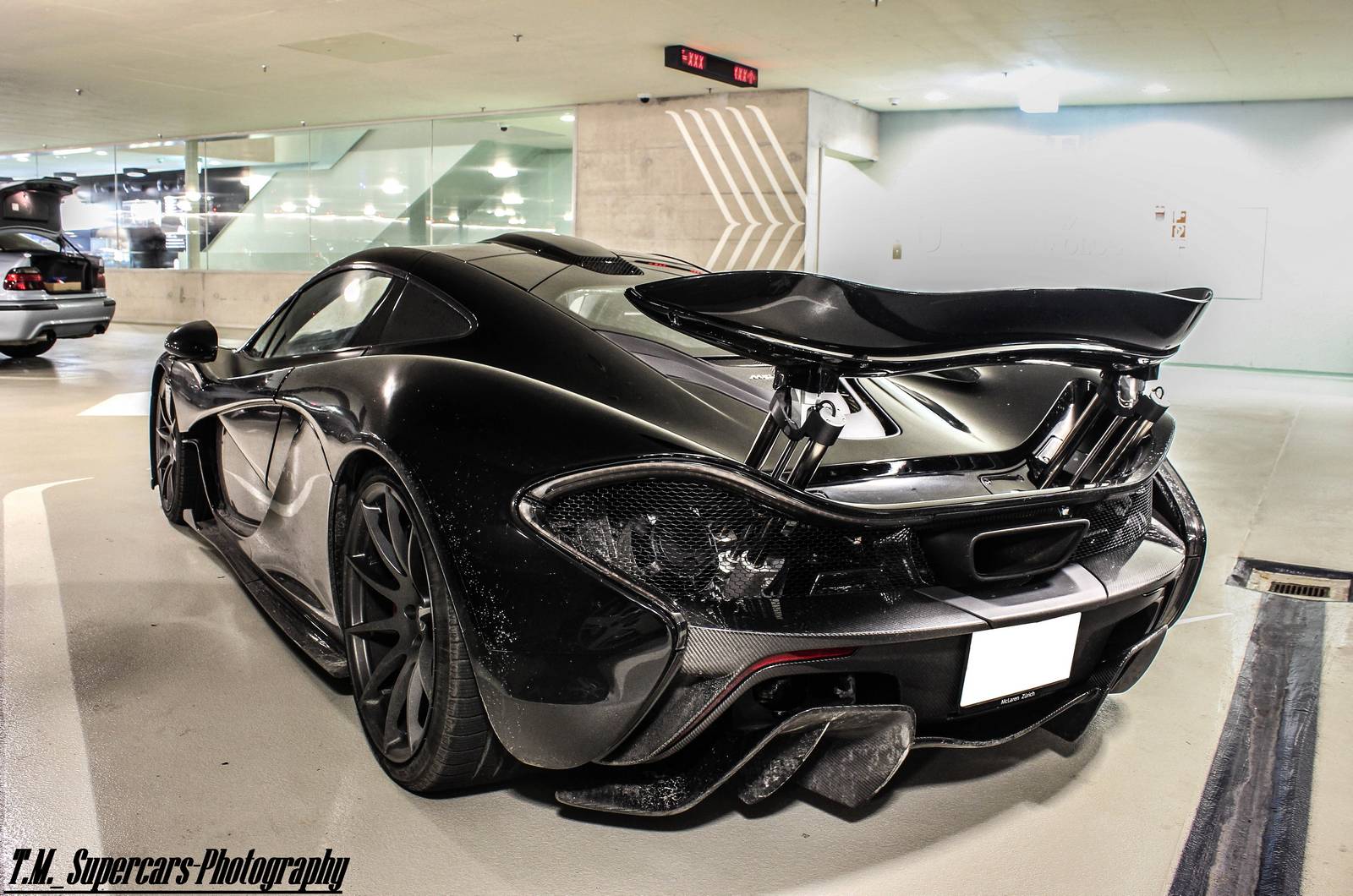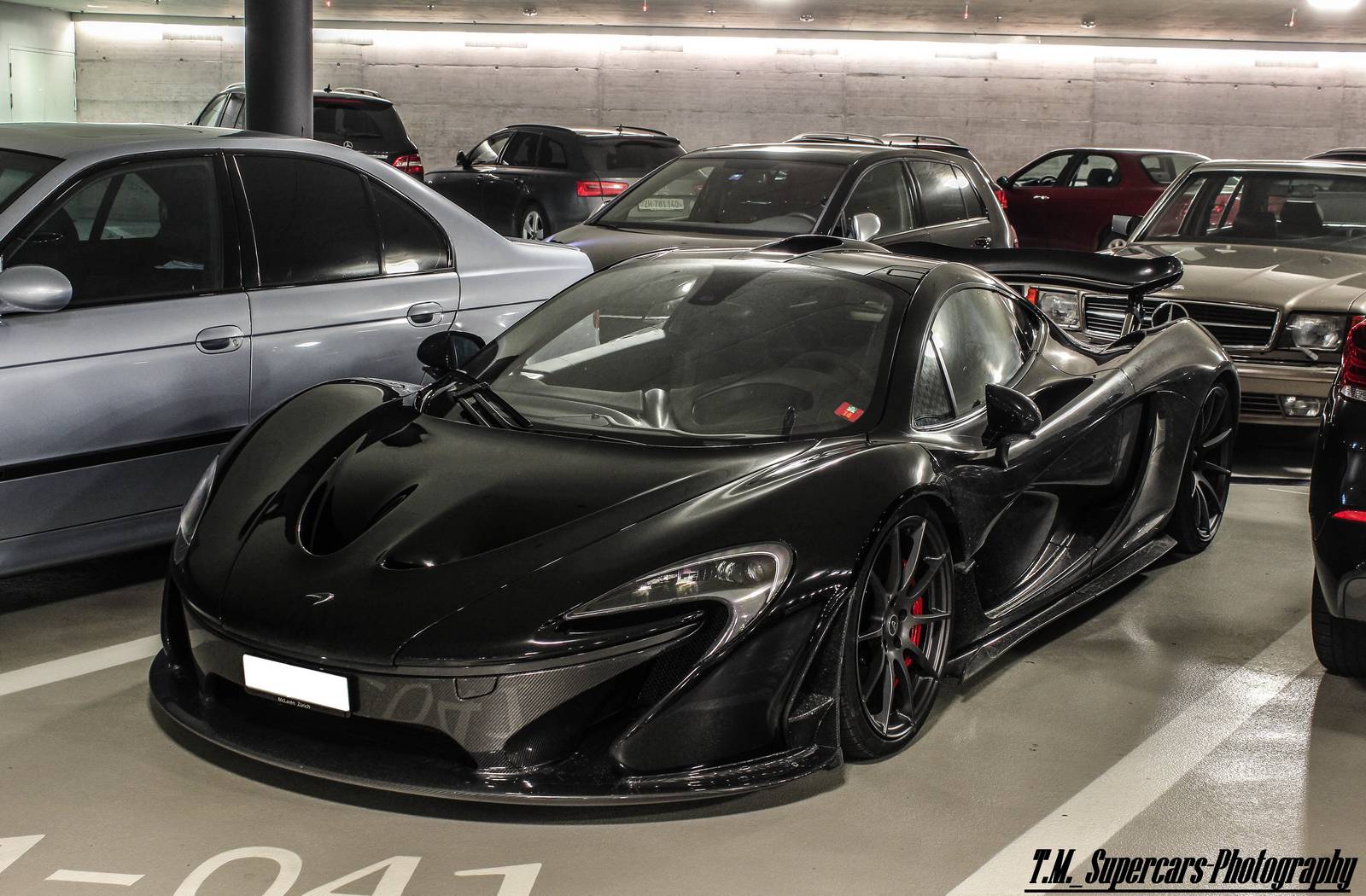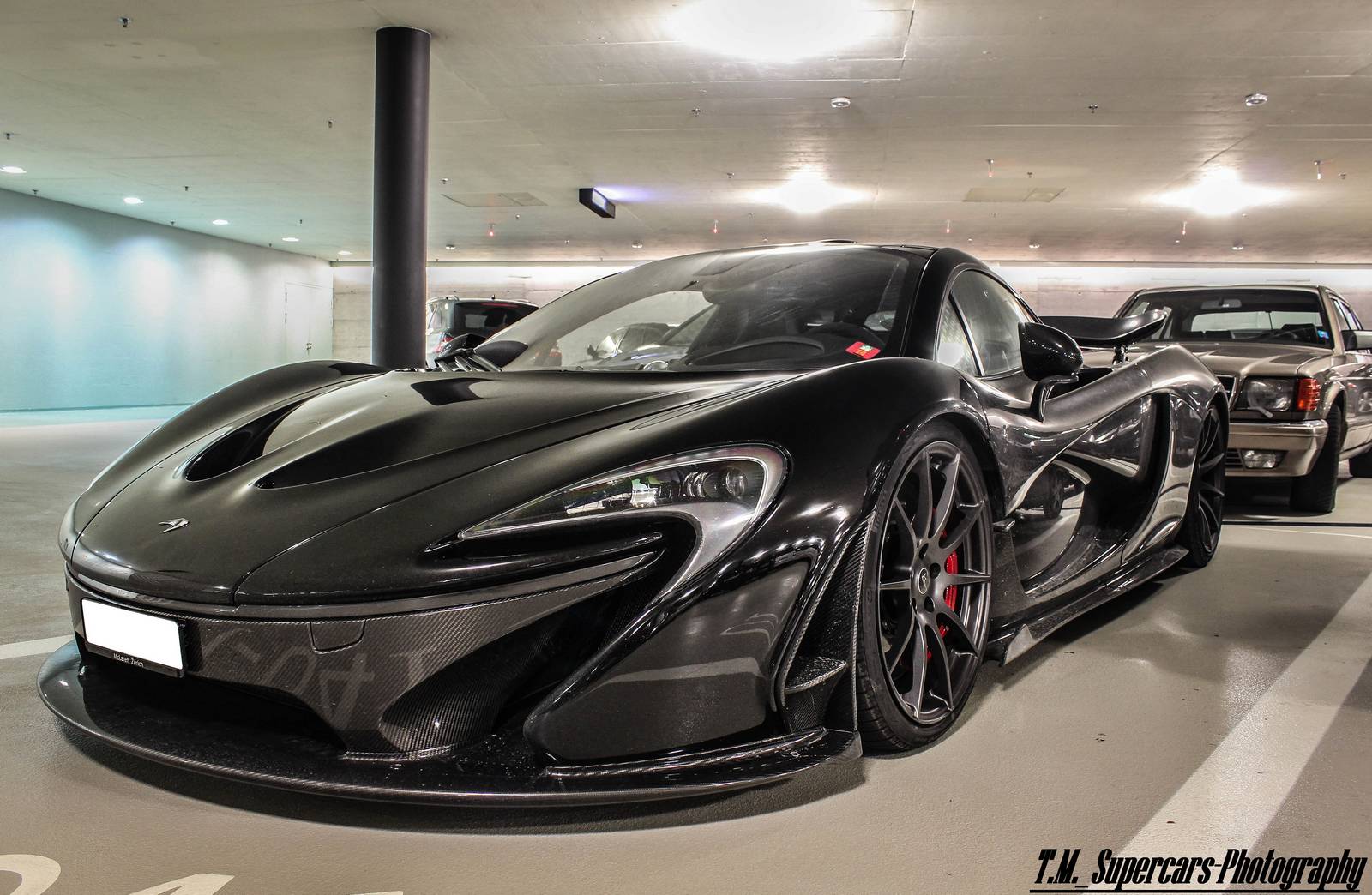 這幾天有經過本地McLaren展示間的朋友們應該都有注意到,現在擺著的是部黑色車身、暗色輪圈配色的McLaren 12C,恰好有點類似本文主角。眼前這部黑色塗裝McLaren P1由攝影專家TM Supercars Photography於瑞士蘇黎世(Zurich, Switzerland)商場地下室停車場中擄獲,與常見、一塵不染的乾淨展示車不同,略帶濺起之泥巴的低扁車身給人一種暴力視覺感受,而與一般車輛同樣照規矩停在停車格內,似乎也不太過擔心旁邊車輛開門擦傷碰撞,流露出車主輕鬆愜意地氛圍。
