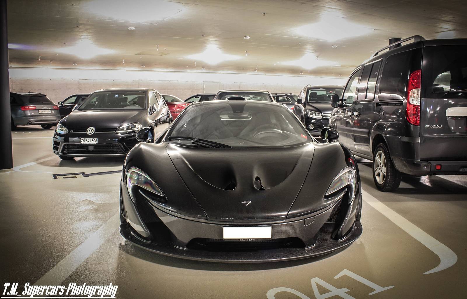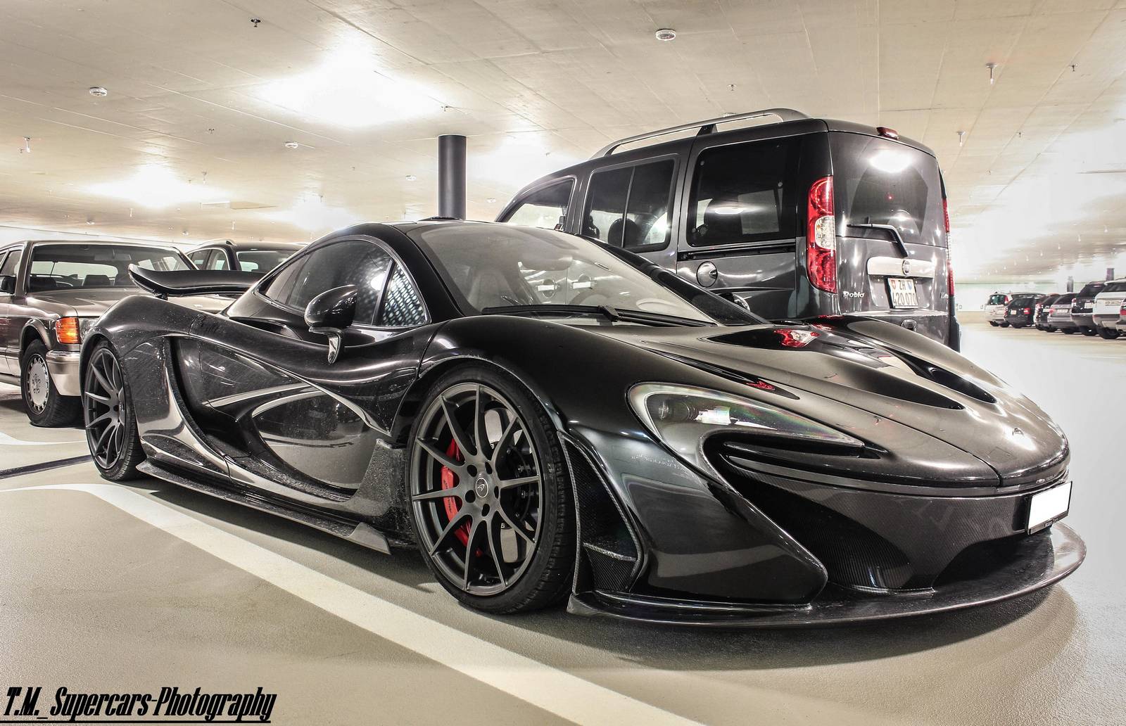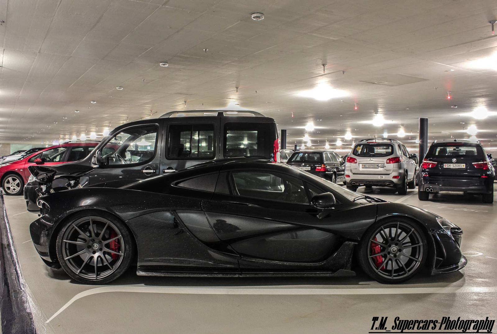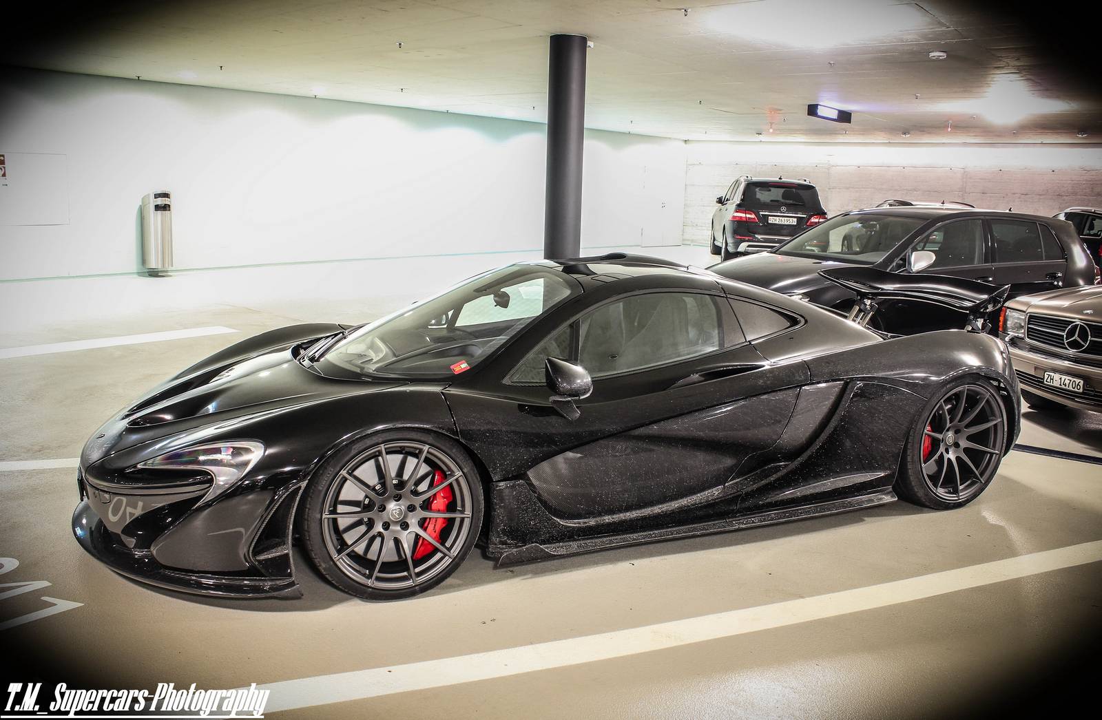 這幾天有經過本地McLaren展示間的朋友們應該都有注意到,現在擺著的是部黑色車身、暗色輪圈配色的McLaren 12C,恰好有點類似本文主角。眼前這部黑色塗裝McLaren P1由攝影專家TM Supercars Photography於瑞士蘇黎世(Zurich, Switzerland)商場地下室停車場中擄獲,與常見、一塵不染的乾淨展示車不同,略帶濺起之泥巴的低扁車身給人一種暴力視覺感受,而與一般車輛同樣照規矩停在停車格內,似乎也不太過擔心旁邊車輛開門擦傷碰撞,流露出車主輕鬆愜意地氛圍。