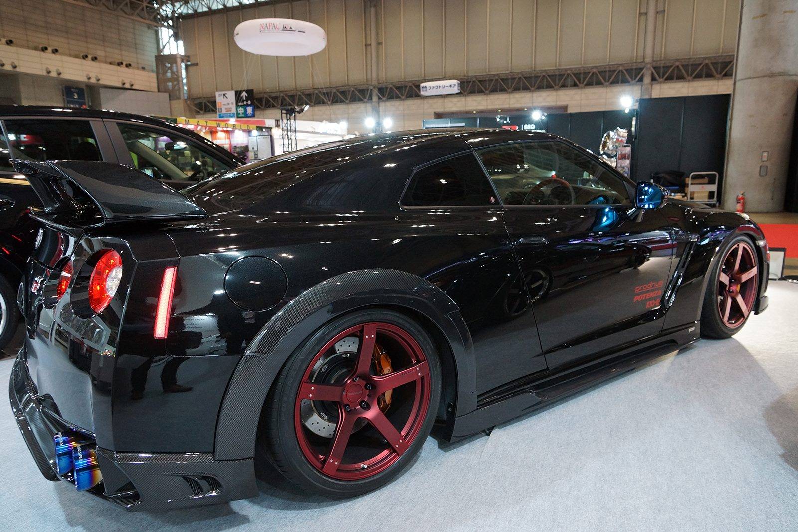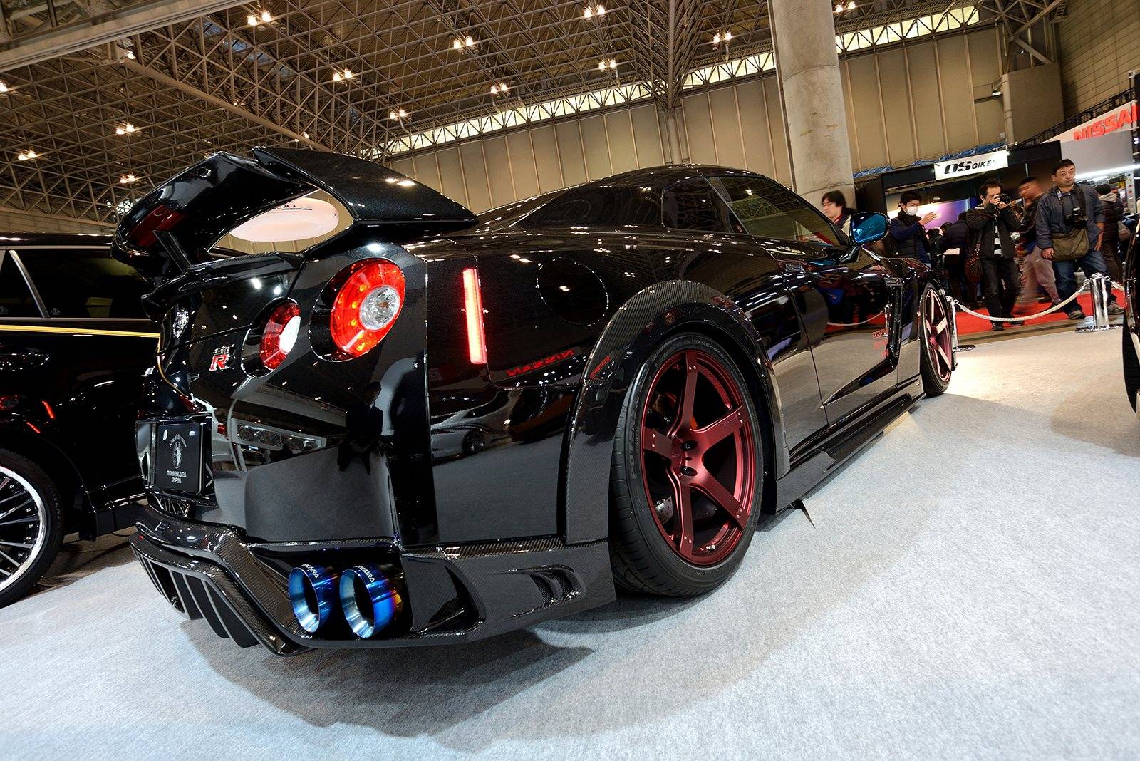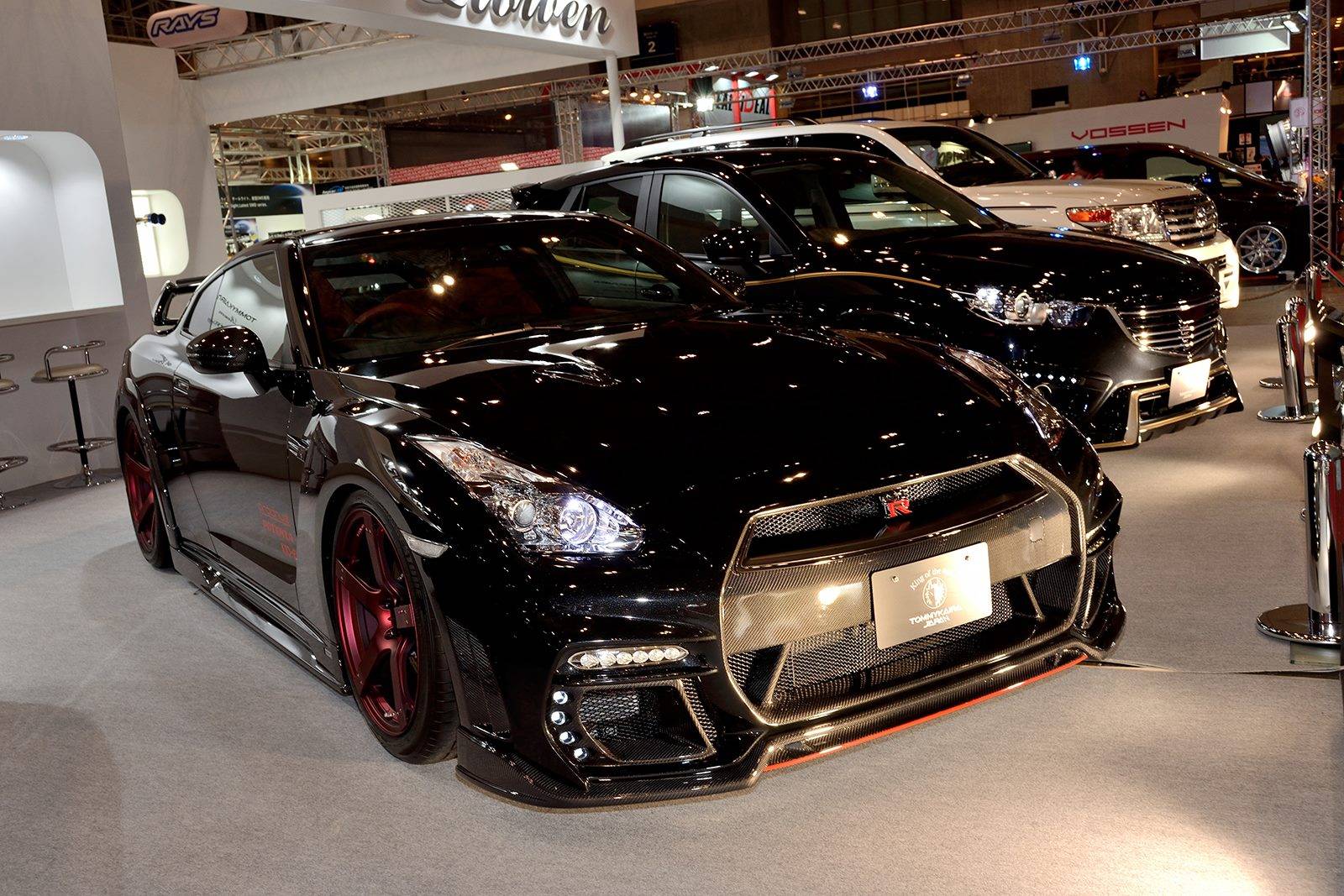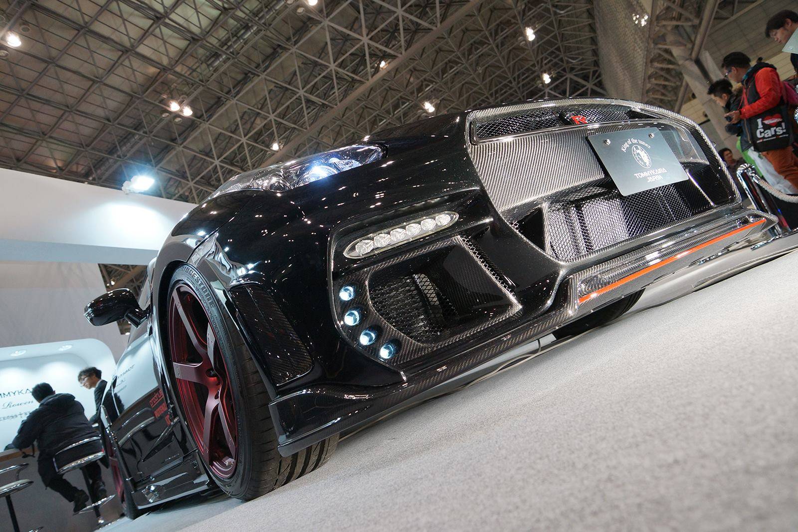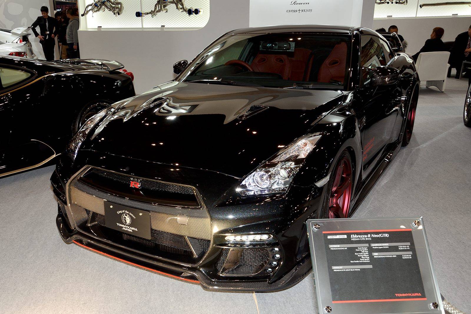 這款新式樣空力套件包含碳纖維前保桿、前下巴、造型獨特的LED日間行車燈組、侵略性十足的氣壩、碳纖維側裙組、全新設計的後上擾流尾翼、後下擾流板與寬車體輪弧。除此之外,眼前這部代表Tommy Kaira出席會場的黑色塗裝、酒紅色內裝Nissan R35 GT-R選用日本知名品牌Prodrive出品、型號GC-05N的五幅式樣輪圈並且施以電鍍暗紅色處理,另外搭配自家開發的鈦合金排氣管,讓祖國引以為傲的GT-R呈現前所未見的高質感跑格。