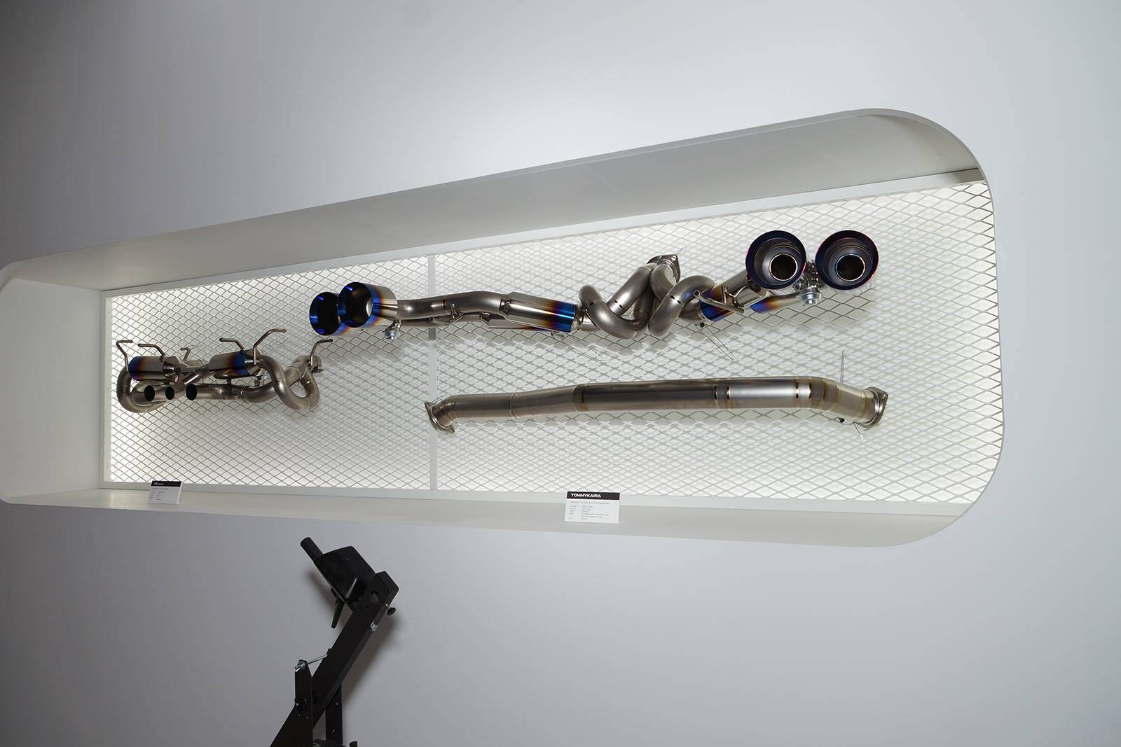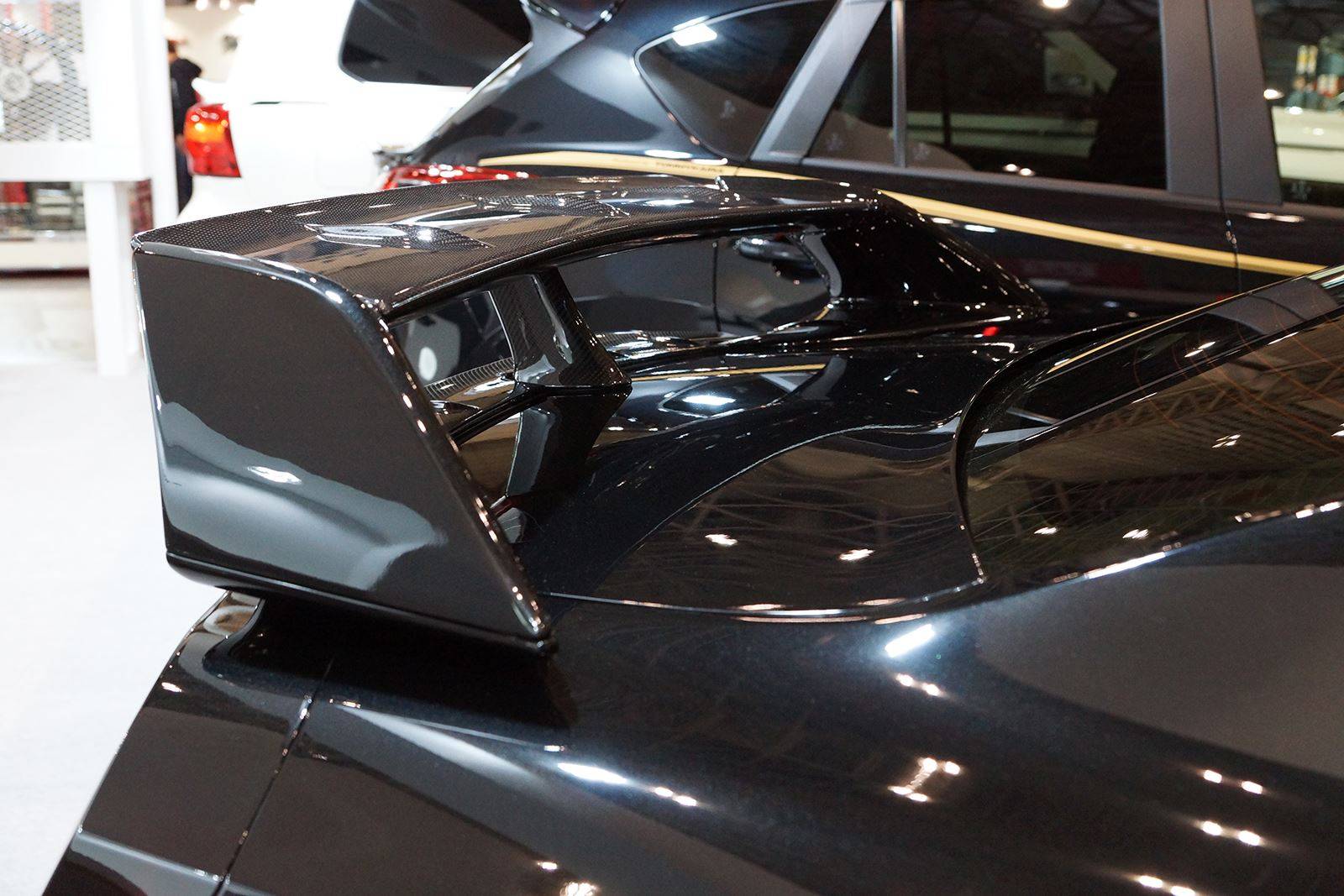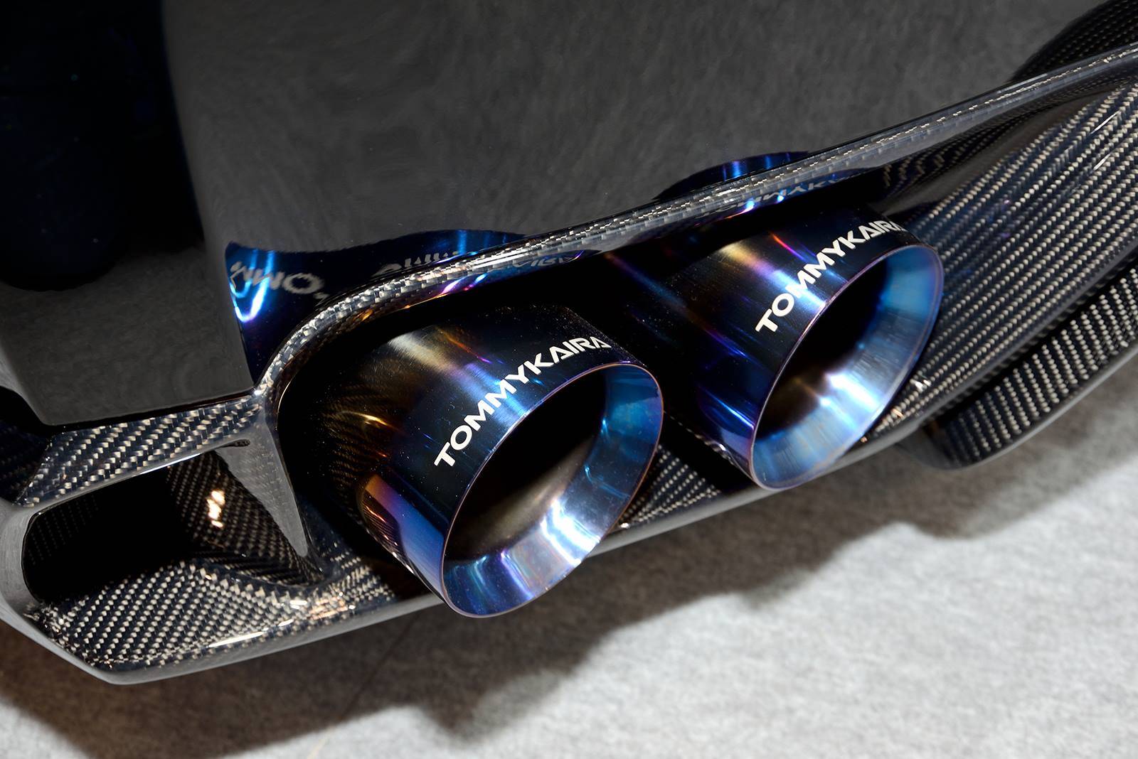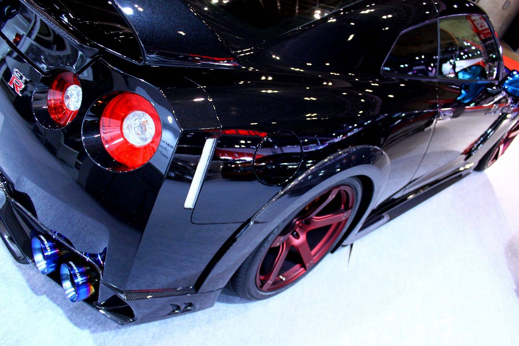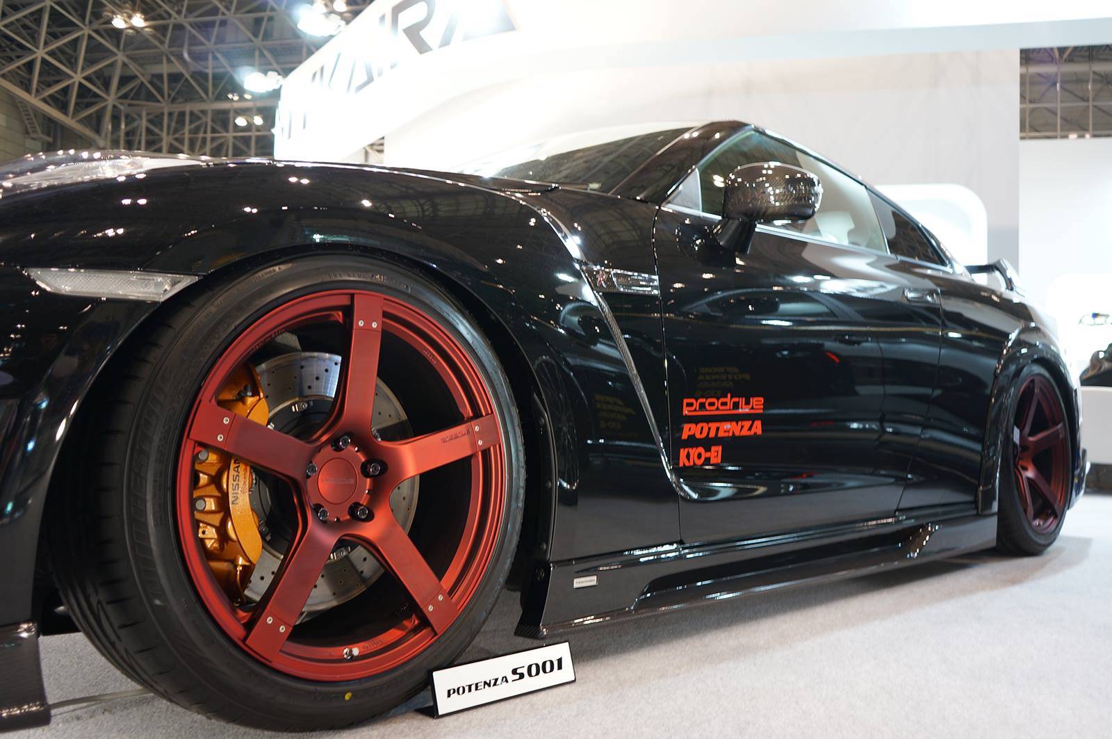 這款新式樣空力套件包含碳纖維前保桿、前下巴、造型獨特的LED日間行車燈組、侵略性十足的氣壩、碳纖維側裙組、全新設計的後上擾流尾翼、後下擾流板與寬車體輪弧。除此之外,眼前這部代表Tommy Kaira出席會場的黑色塗裝、酒紅色內裝Nissan R35 GT-R選用日本知名品牌Prodrive出品、型號GC-05N的五幅式樣輪圈並且施以電鍍暗紅色處理,另外搭配自家開發的鈦合金排氣管,讓祖國引以為傲的GT-R呈現前所未見的高質感跑格。