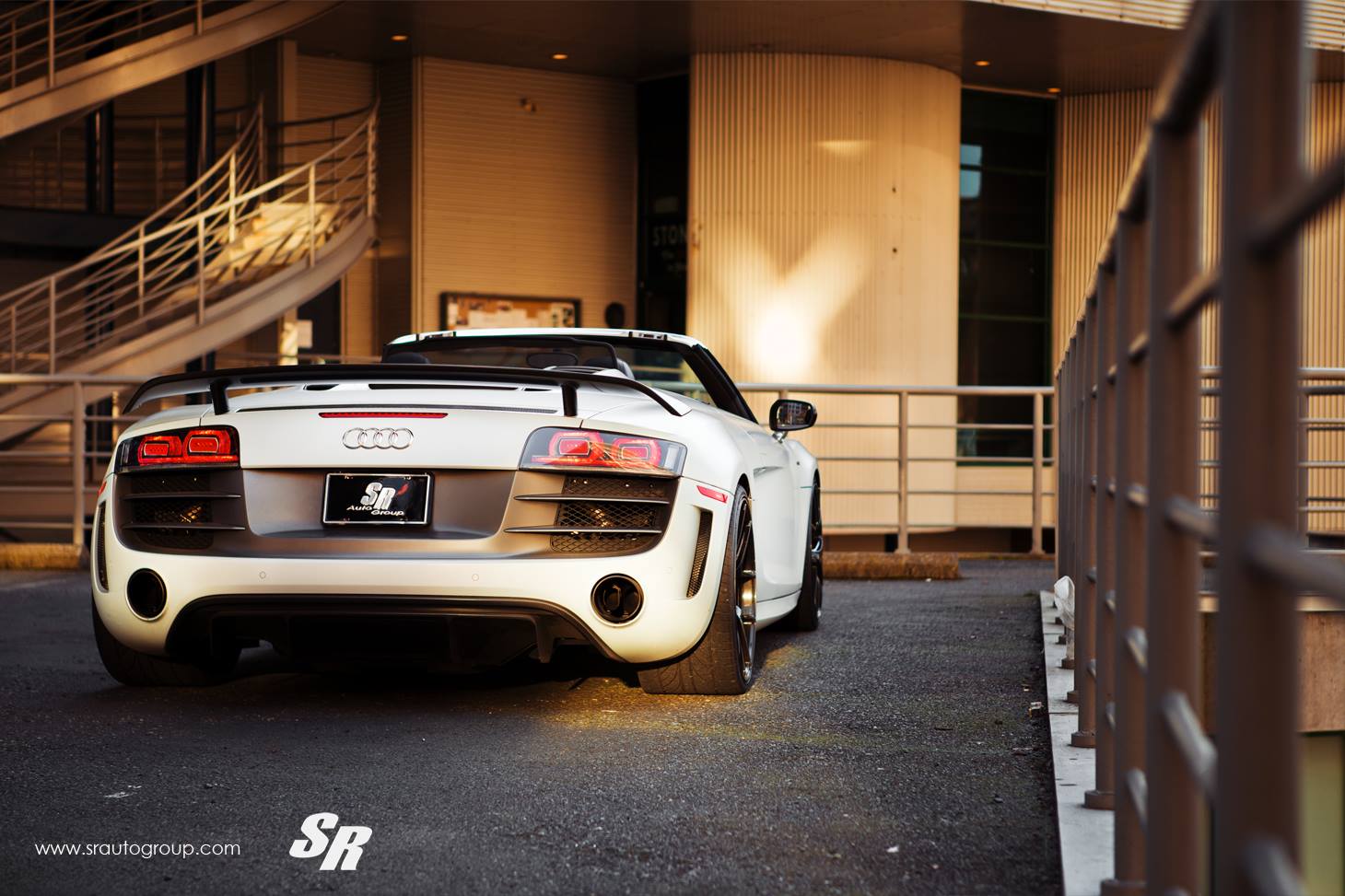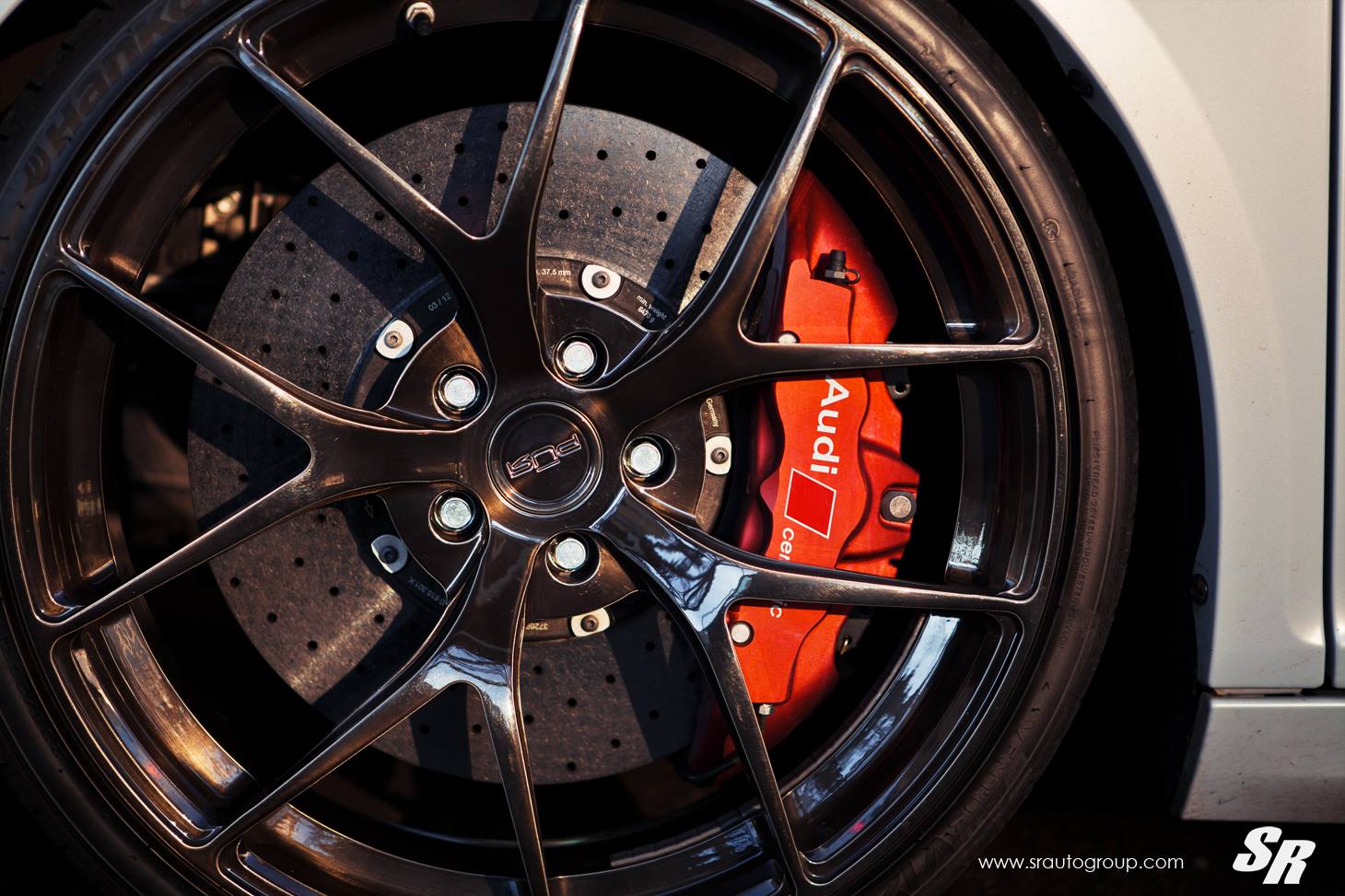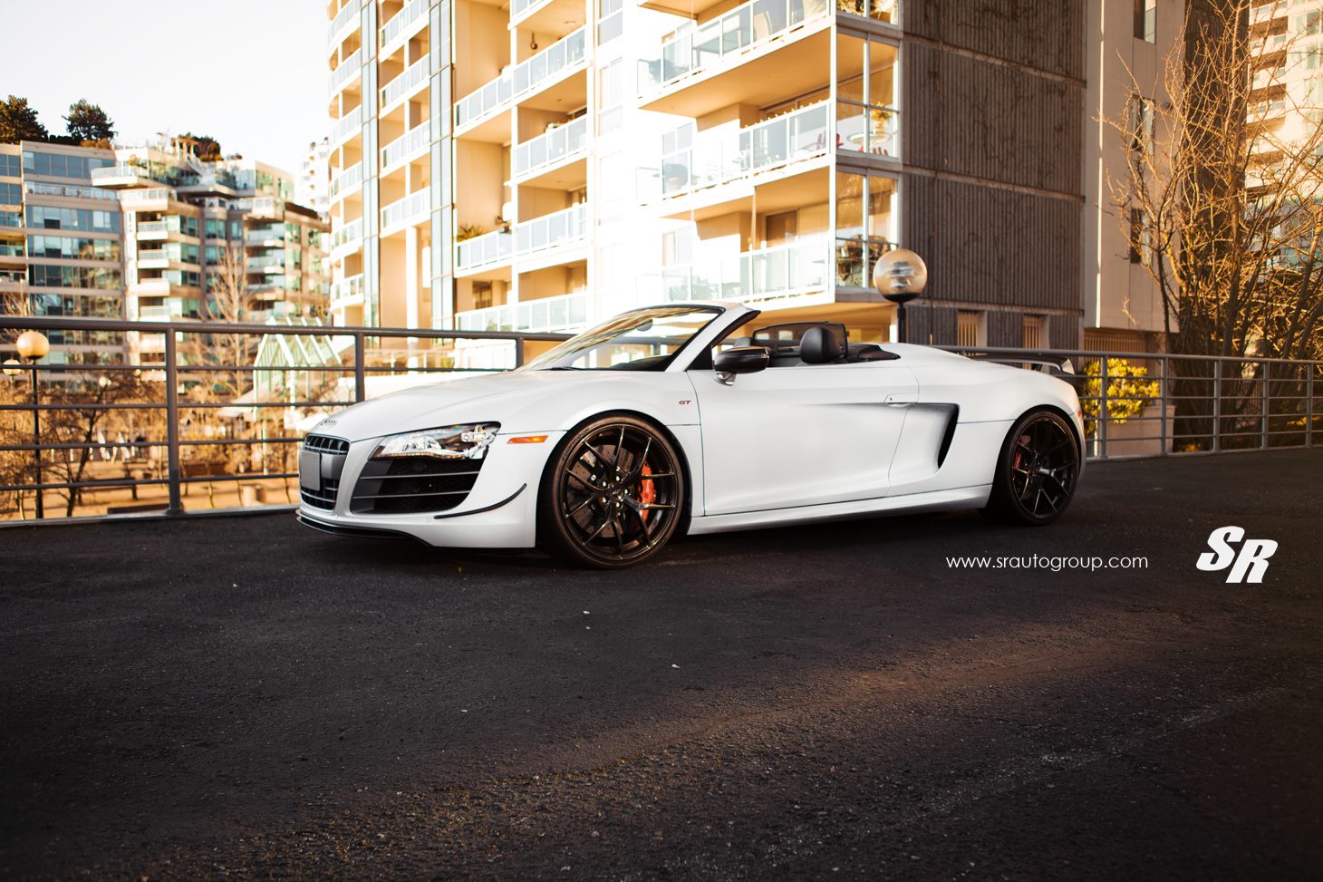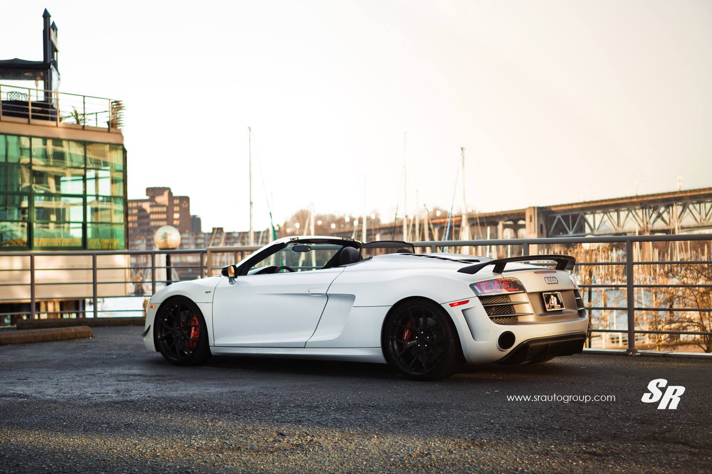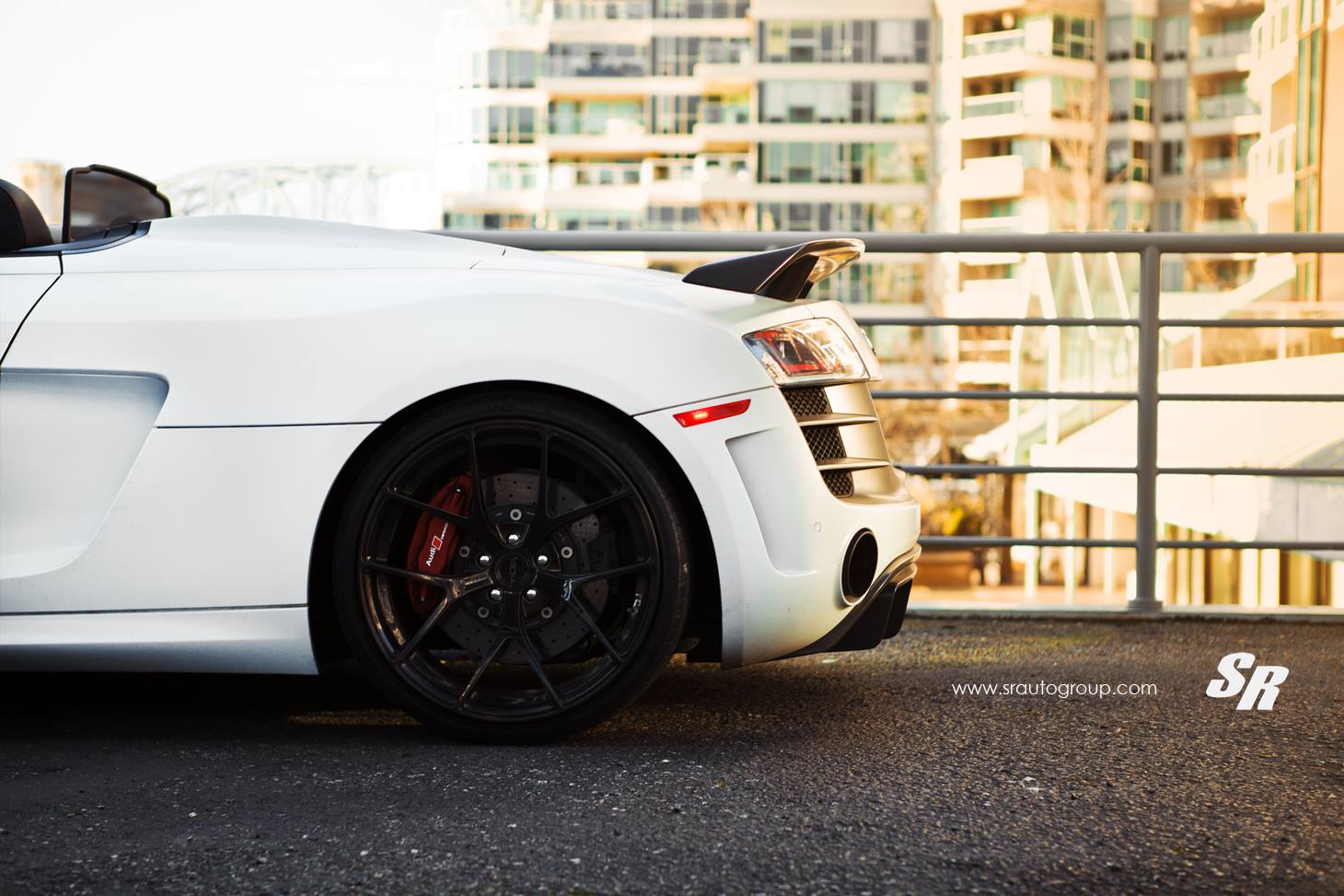 今天帶給各位由改裝廠SR Auto Group所操刀、在加拿大溫哥華(Vancouver, Canada)當地素有"最美R8"之美名的Audi R8 GT Spyder,除了將後視鏡蓋變成黑色塗裝外,同時將陶瓷碳纖維煞車卡鉗以電鍍消光暗紅色處理,另外換裝鑽黑色PUR輪圈與高低軟硬可調式避震器將車身降低,營造出難以左右的極致跑格。