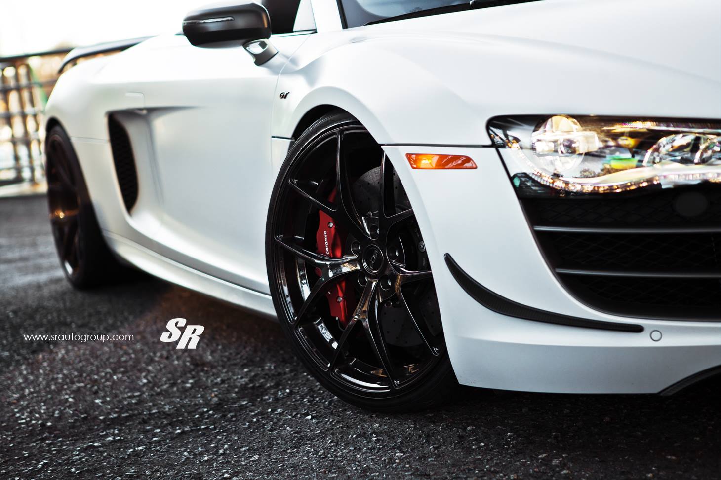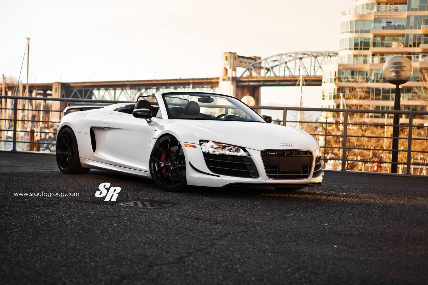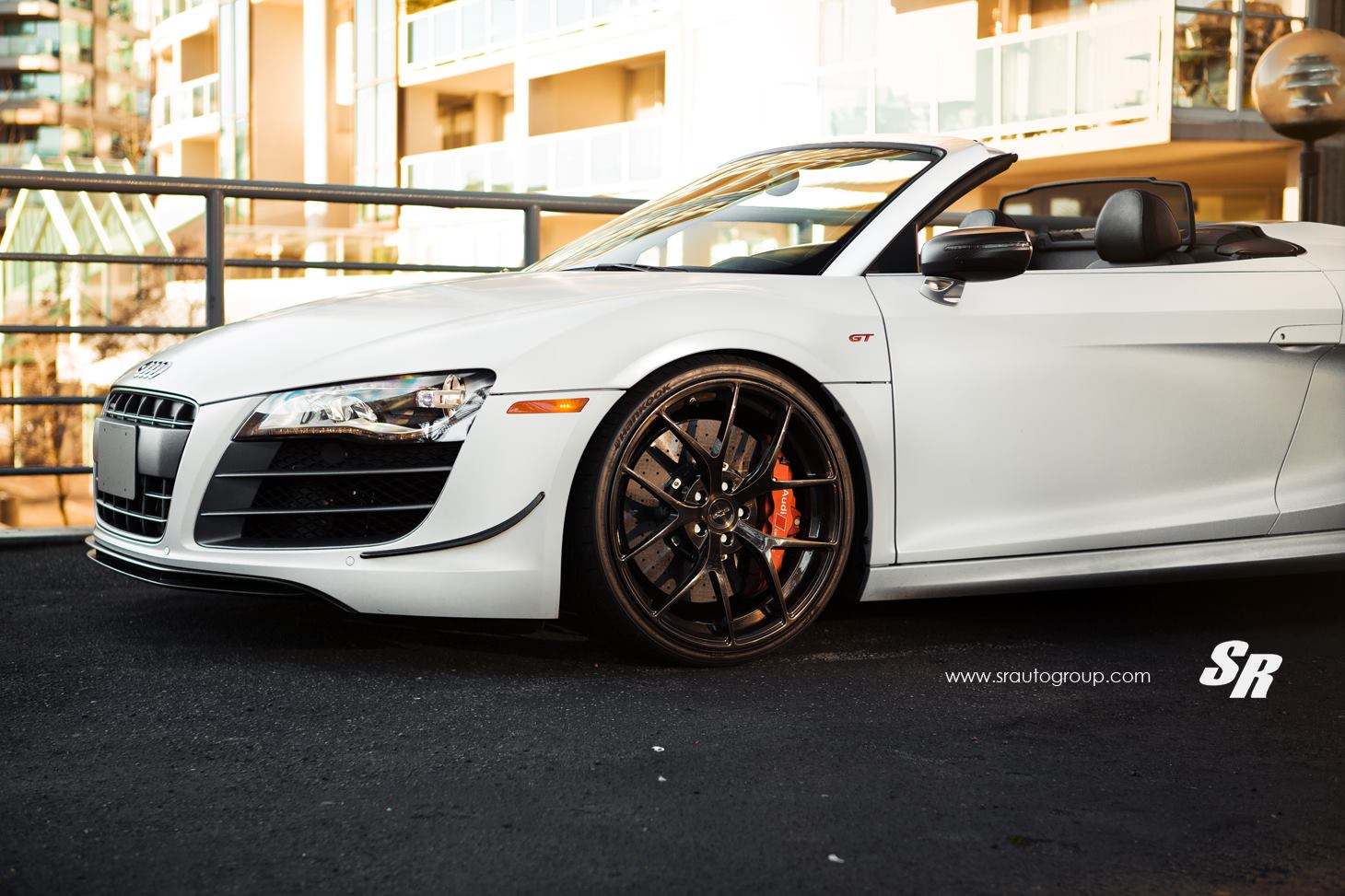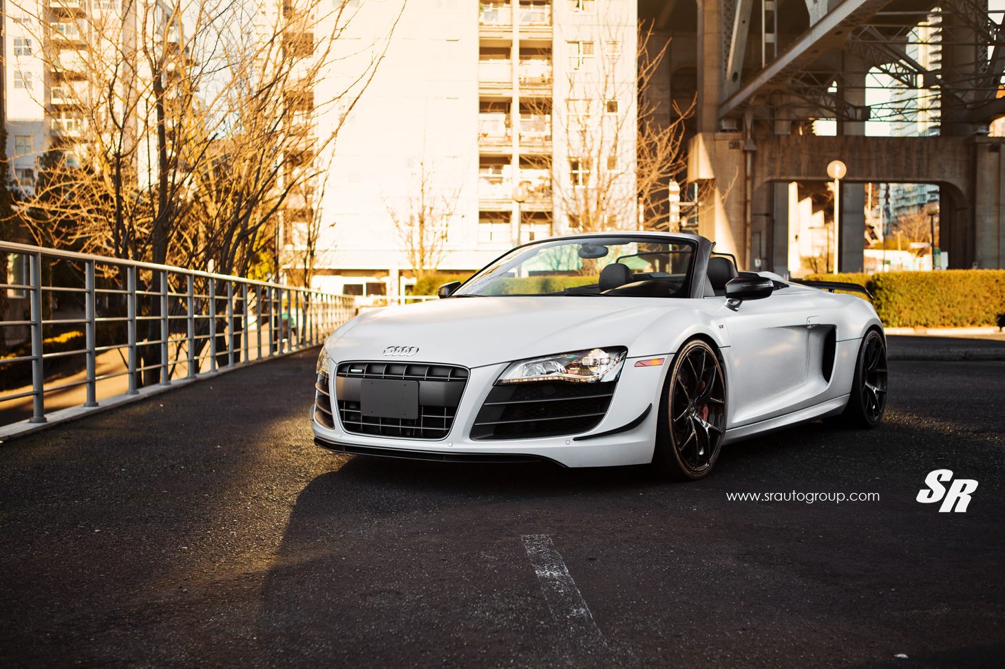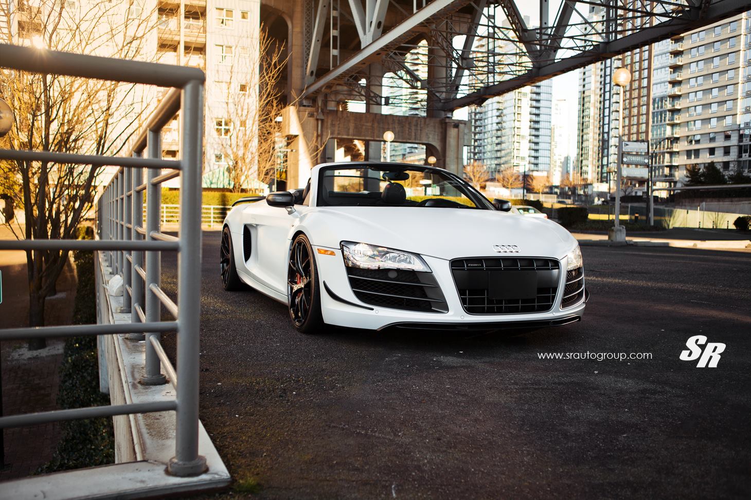 今天帶給各位由改裝廠SR Auto Group所操刀、在加拿大溫哥華(Vancouver, Canada)當地素有"最美R8"之美名的Audi R8 GT Spyder,除了將後視鏡蓋變成黑色塗裝外,同時將陶瓷碳纖維煞車卡鉗以電鍍消光暗紅色處理,另外換裝鑽黑色PUR輪圈與高低軟硬可調式避震器將車身降低,營造出難以左右的極致跑格。