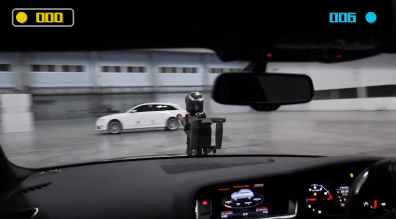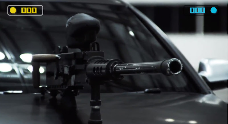 小老弟A1 Quattro之前一個人獨自玩泥巴算什麼?畫面,是兩台擁有4.2升V8 450hp四輪傳動優異表現的Audi RS4 Avant一起玩漆彈,兩位長者皆在引擎蓋上植入M2步槍(當然沒裝真的子彈),車室內備有紅色的擊發按鈕。最後,白色RS4則是因膚色顯得中槍較頻繁,但也看似勢均力敵。