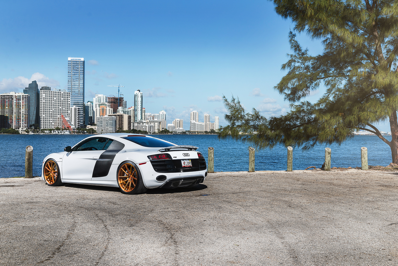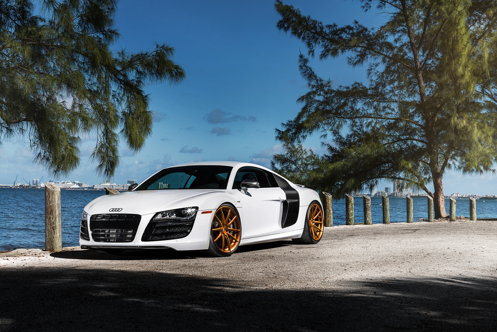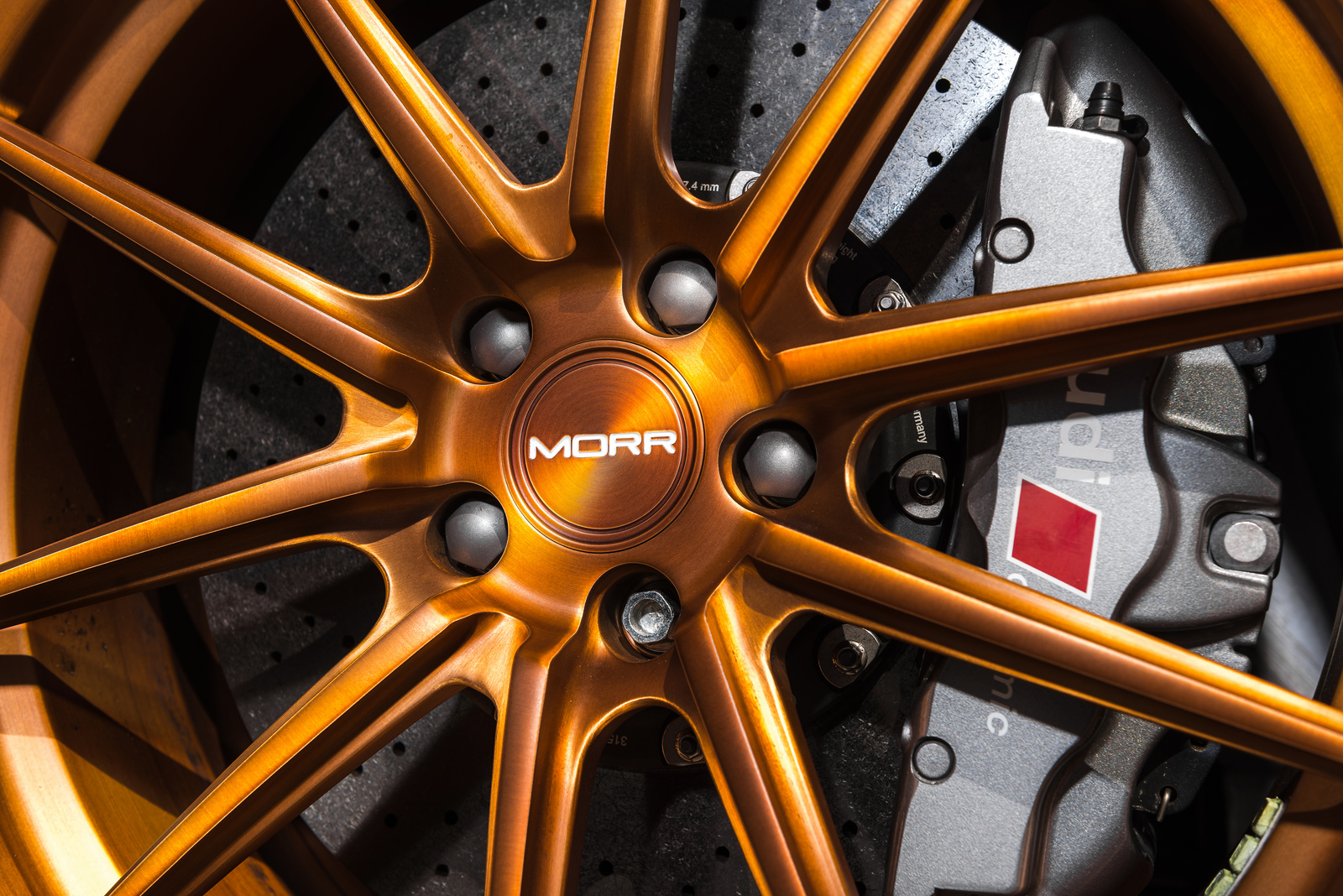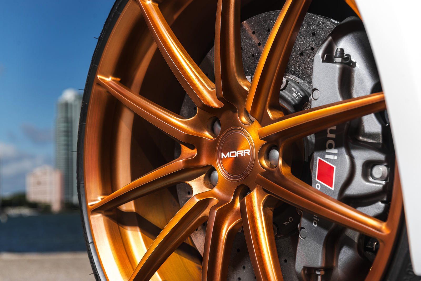 眼前這部Ibis White白色塗裝Audi R8 V10便是遇到一位相當照顧它且捨得花錢裝扮的主人,在出廠時便選配碳纖維C柱飾板與原廠陶瓷碳纖煞車系統,隨後換裝碳纖維後下擾流板與後視鏡蓋等部品,輪圈選用MORR Wheels出品、型號VS10的放射狀內凹款式,圈面採用耀眼的金銅色塗裝,另外換裝高低軟硬可調式避震器組將車身降低,讓這部Audi頂級超跑在艷陽下熱力四射、吸睛無比。