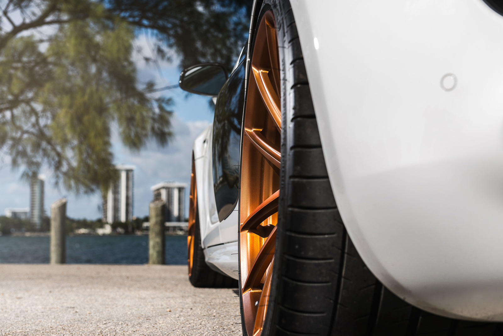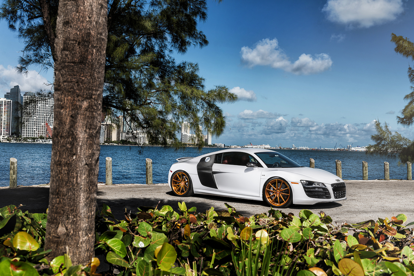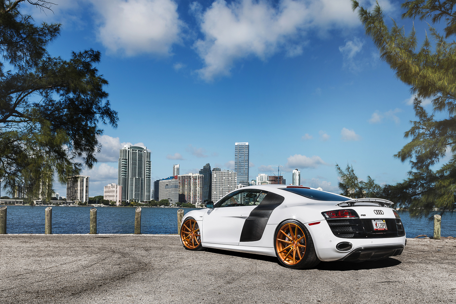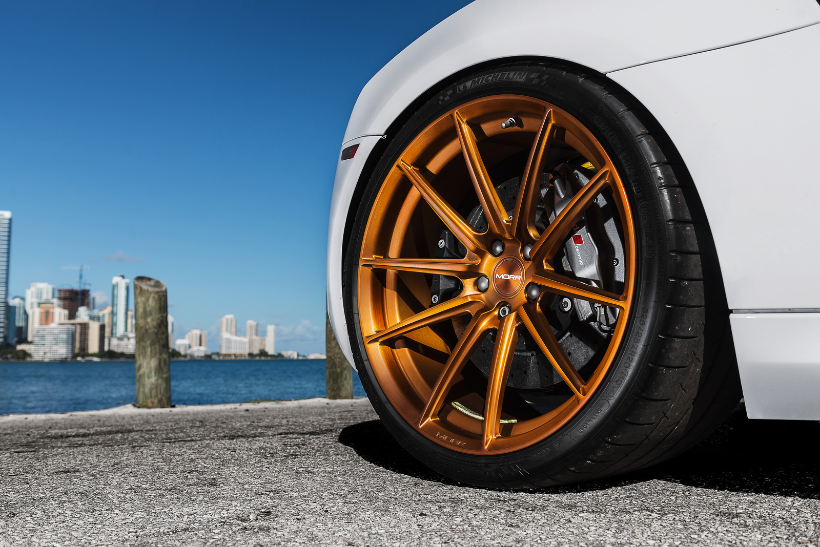 眼前這部Ibis White白色塗裝Audi R8 V10便是遇到一位相當照顧它且捨得花錢裝扮的主人,在出廠時便選配碳纖維C柱飾板與原廠陶瓷碳纖煞車系統,隨後換裝碳纖維後下擾流板與後視鏡蓋等部品,輪圈選用MORR Wheels出品、型號VS10的放射狀內凹款式,圈面採用耀眼的金銅色塗裝,另外換裝高低軟硬可調式避震器組將車身降低,讓這部Audi頂級超跑在艷陽下熱力四射、吸睛無比。