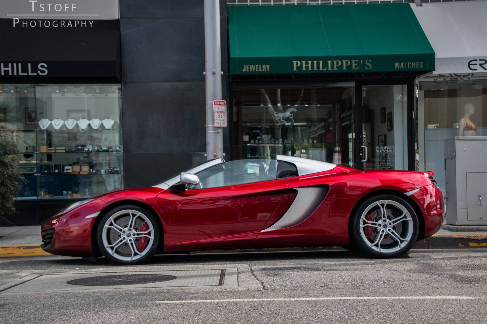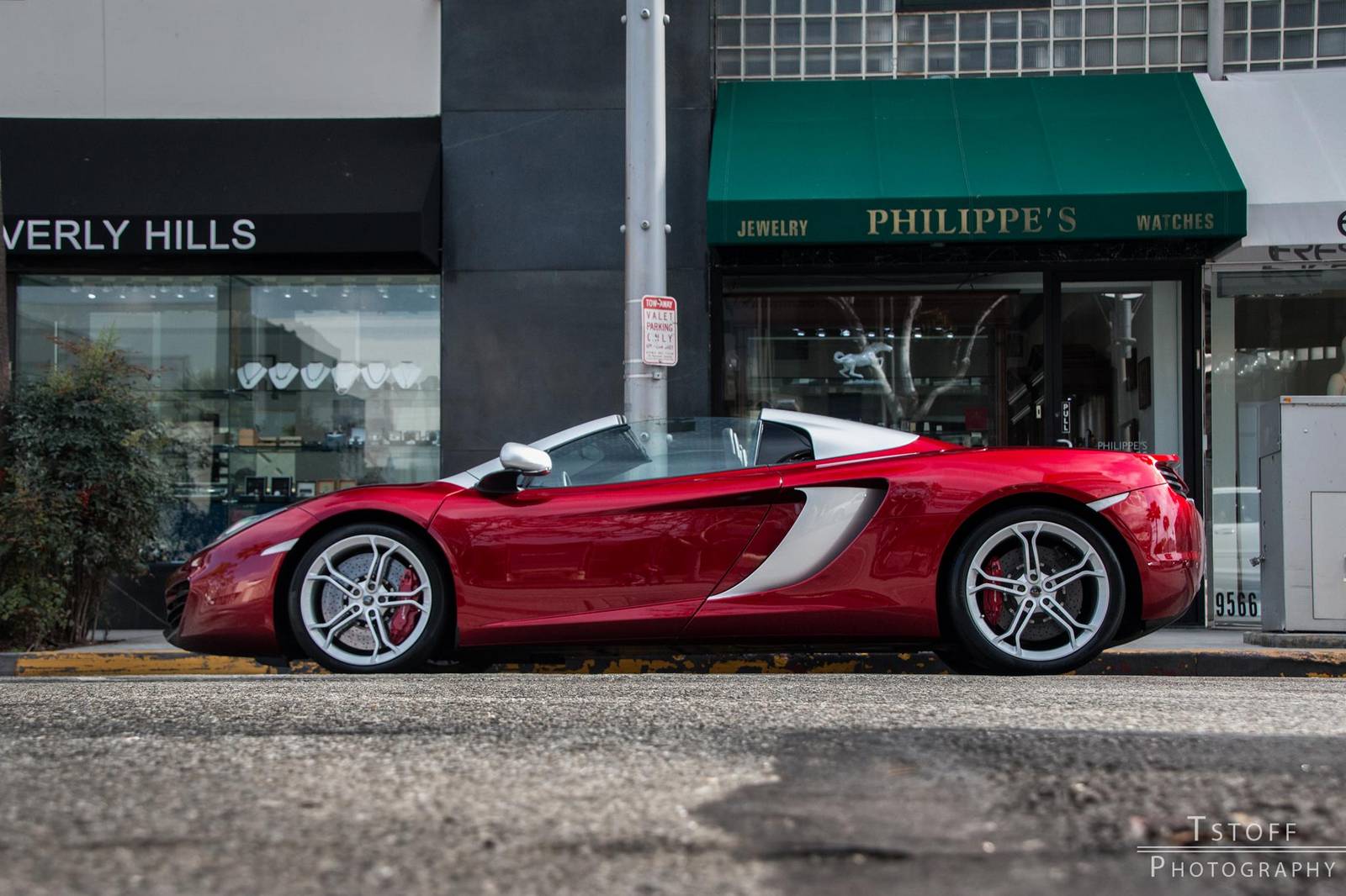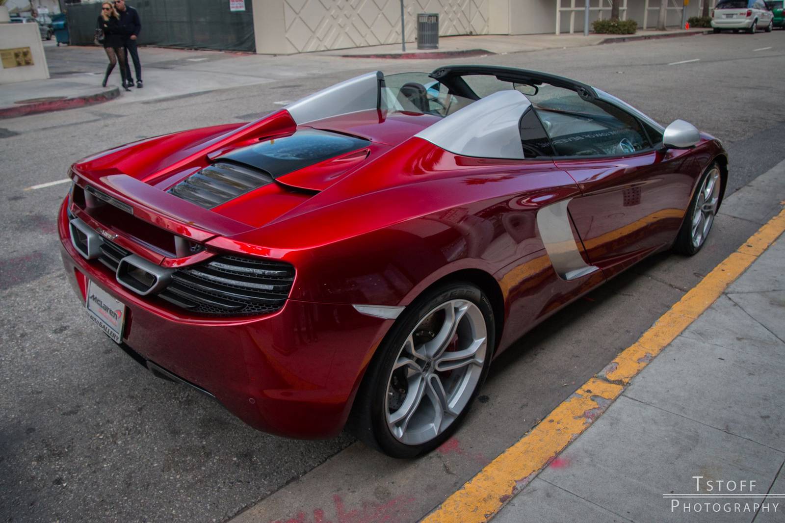 在結果出來之前,我們先來觀賞眼前這部特殊配色的McLaren 12C Spider,由攝影專家TSTOFF Photography於美國比佛利山莊(Beverly Hills, USA)街頭所擄獲,車身大部分採用帶有銀粉的Volcano Red紅色塗裝,而在後視鏡、A柱與敞篷雙駝峰部分以對比的鋁合金塗裝處理並將範圍延伸到側邊進氣口周邊,所選配的輕量化鍛造輪圈也採用銀色塗裝,搭配紅底白字的煞車卡鉗,整體令人耳目一新。
