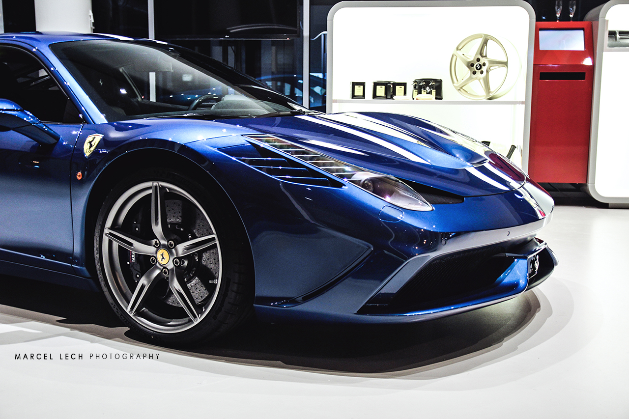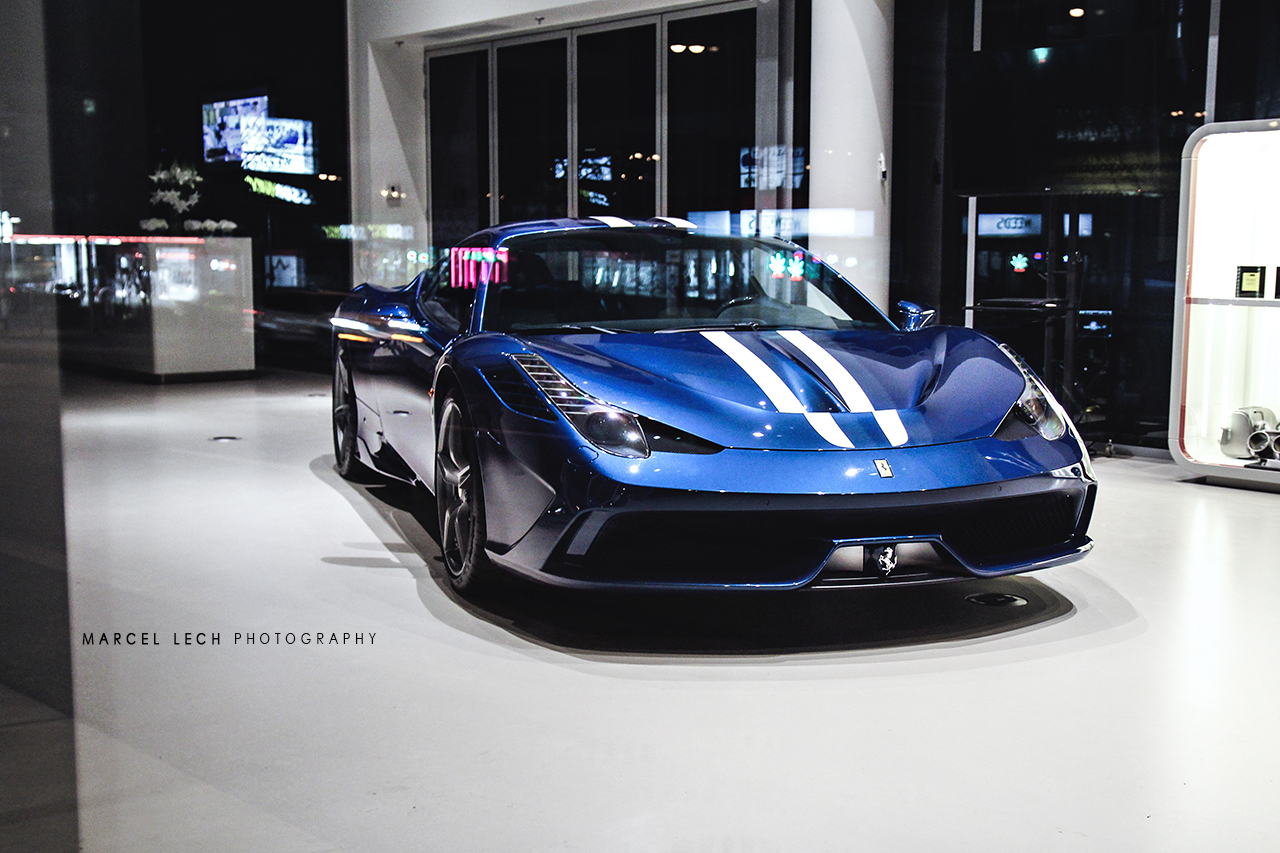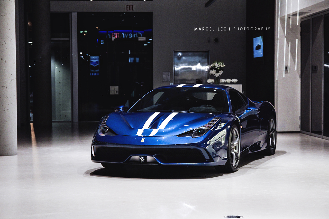 今天帶給各位由攝影師Marcel Lech於加拿大溫哥華(Vancouver, Canada)所拍攝、停放於當地經銷商展間內的藍色塗裝Ferrari 458 Speciale。根據消息指出,這部首部抵達加拿大境內的458 Speciale已於前幾天舉辦發表記者會後便隨即運往別的國家,彷彿國際巨星般地行程滿檔。藍色車身配上白色NART飾條,這樣的搭配各位覺得如何?