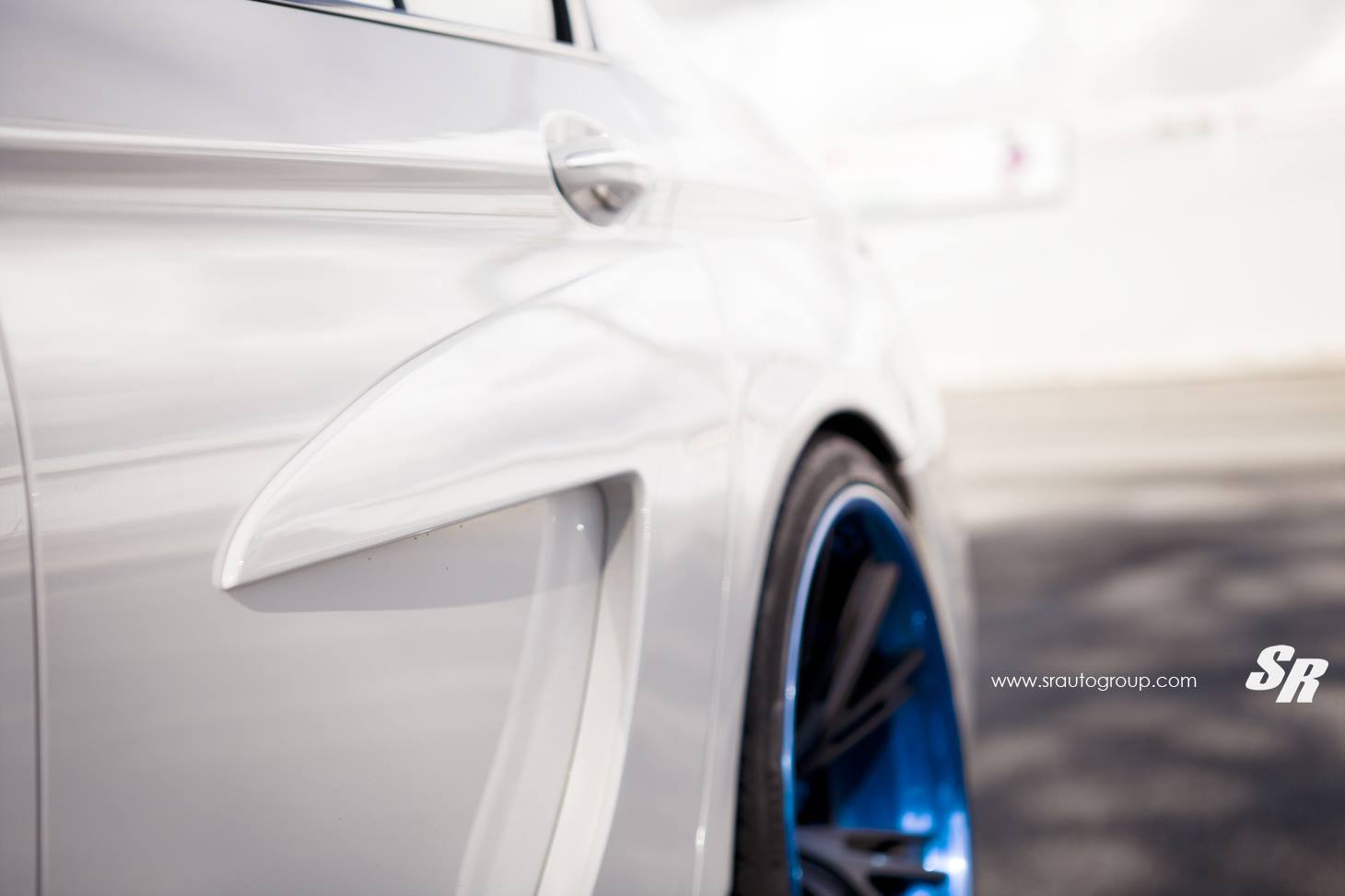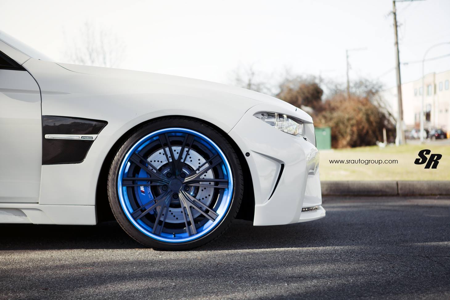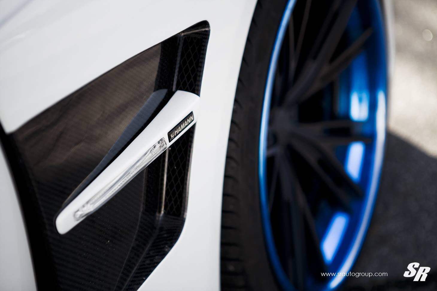 然而,今天各位眼睛所見的BMW F10 M5絕對不是一部Sleeper改裝車,它配有知名品牌Hamann的全車空力套件,包含取名Mi5Sion、附有LED日間行車燈的前保桿、開孔式葉子板、側裙組、後保桿、後上擾流尾翼、後車頂擾流尾翼與全車寬車體套件,將原本斯文內斂的四門房車塑造得劍拔怒張。比較特別的是,改裝廠SR Auto Group並未選擇同樣來自Hamann的輪圈,而是換裝PUR Wheels出品、型號LX09的21吋輪圈,尺寸為前21x9.5J、後21x12.5J的前後配設定,中心採用消光黑色塗裝,外圈則是以電鍍藍色處理,呼應原廠藍色煞車卡鉗,另外選用H&R短彈簧將車身略微降低。
