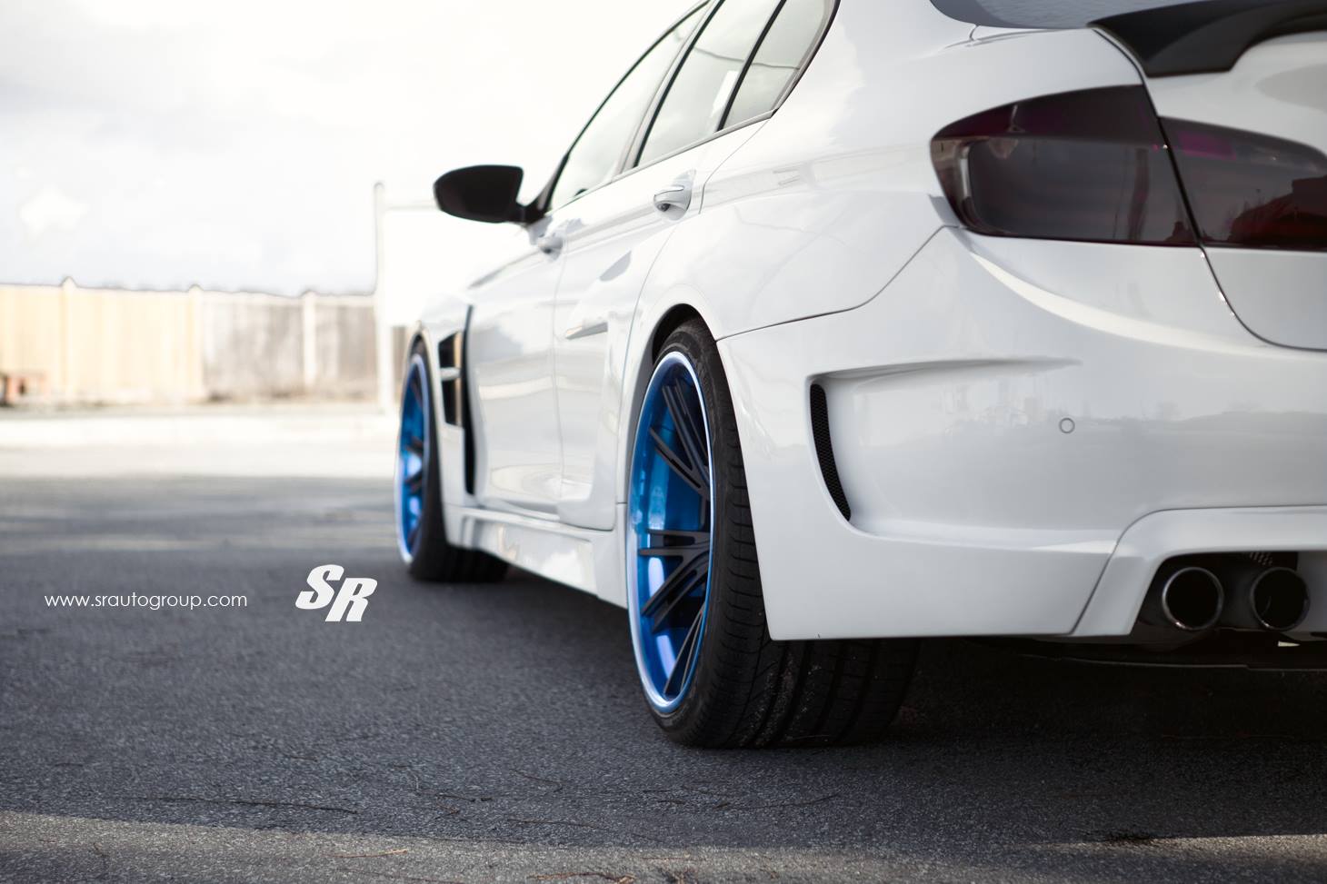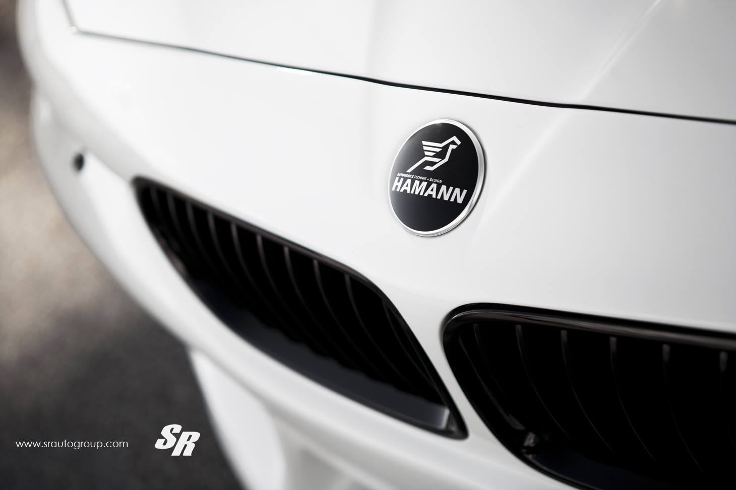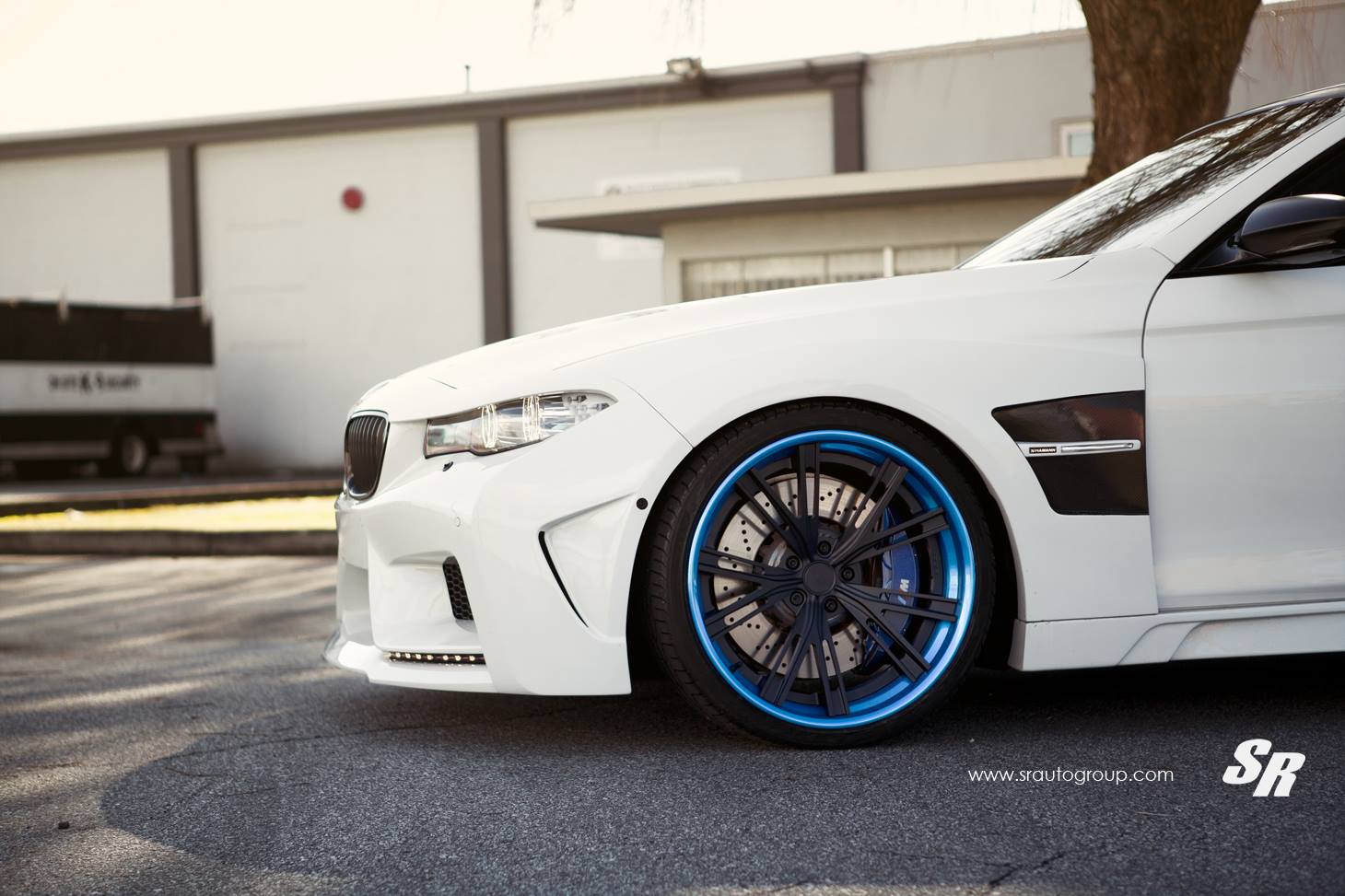 然而,今天各位眼睛所見的BMW F10 M5絕對不是一部Sleeper改裝車,它配有知名品牌Hamann的全車空力套件,包含取名Mi5Sion、附有LED日間行車燈的前保桿、開孔式葉子板、側裙組、後保桿、後上擾流尾翼、後車頂擾流尾翼與全車寬車體套件,將原本斯文內斂的四門房車塑造得劍拔怒張。比較特別的是,改裝廠SR Auto Group並未選擇同樣來自Hamann的輪圈,而是換裝PUR Wheels出品、型號LX09的21吋輪圈,尺寸為前21x9.5J、後21x12.5J的前後配設定,中心採用消光黑色塗裝,外圈則是以電鍍藍色處理,呼應原廠藍色煞車卡鉗,另外選用H&R短彈簧將車身略微降低。