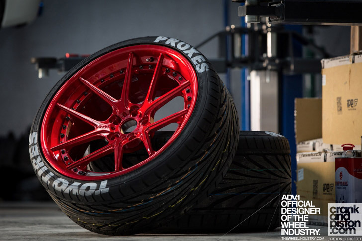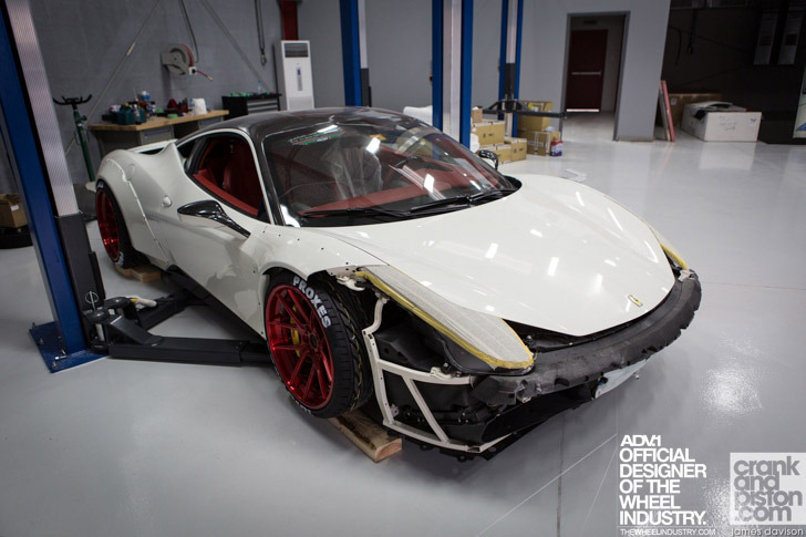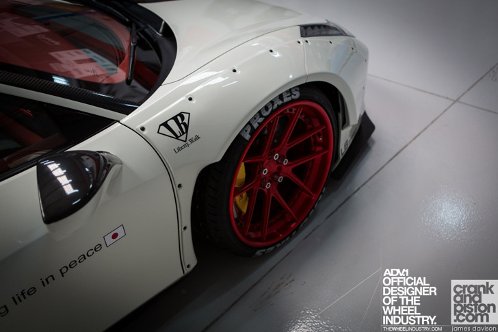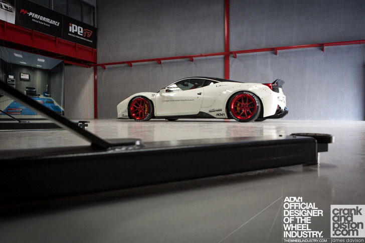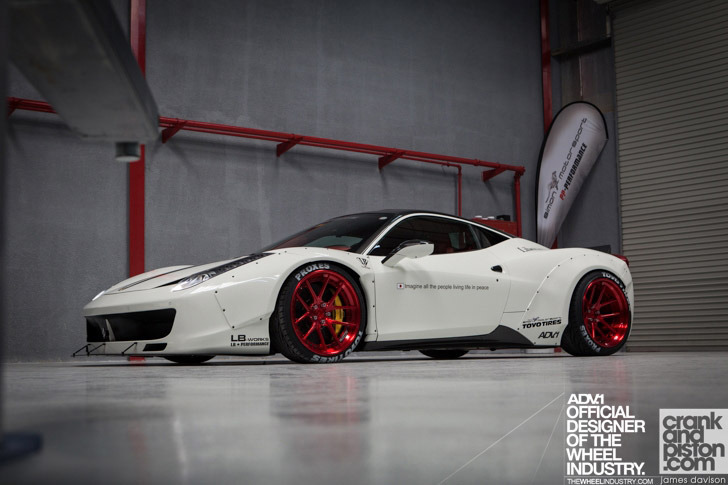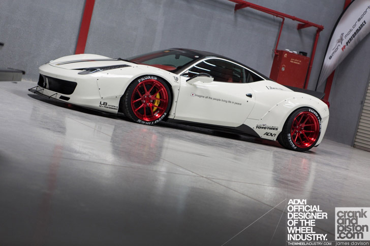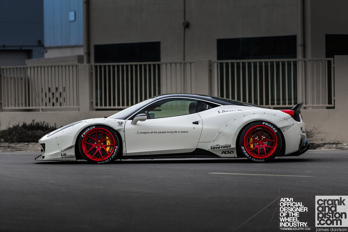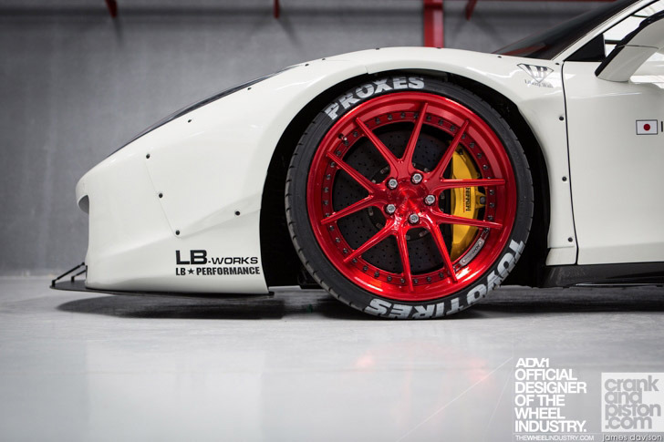眼前這部由知名媒體Crank & Piston所提供的Bianco Avus白色塗裝、紅色內裝Ferrari 458 Italia便是絕佳典範,除了換裝LB Performance全車寬車體空力套件外,選用知名品牌ADV.1 Wheels出品、型號ADV5.0 Track Spec SL的輕量化輪圈,圈面採用電鍍紅色塗裝,尺寸為前20x10J、後20x13J的前後配設定,輪胎選用日本Toyo Proxes T1R並用白色塗料將胎壁型號字體標註出來,另外搭配高低軟硬可調式避震器將車身降得低趴,同時將車頂施以局部黑色貼膜,是否讓相較於458 Speciale斯文許多的458 Italia格外有型呢?