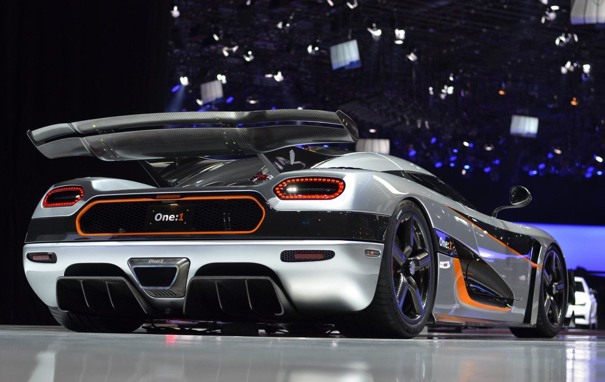 Koenigsegg One:1車身經過多次風洞實驗後、完全以高速行駛為目的而打造,配有主動式可調整後擾流尾翼、大型進氣孔、專屬後下擾流板與側翼等部品,能讓車身穩固貼地奔馳,於時速260km/hr時能提供高達610公斤的下壓力、440km/hr時更能達到830公斤,幾乎是Koenigsegg Agera R的兩倍之多,而其過彎側向G值可達2G!動力部分,Koenigsegg One:1搭載鋁合金5.0升V8渦輪增壓引擎,最大增壓值達到1.8bar,能於轉速6,000rpm爆發出139.9kgm的最大扭力,最大馬力可達1,341HP,紅線轉速為8,250rpm,馬力因所使用的汽油種類而異。車重方面,原廠表示油箱半滿的Koenigsegg One:1空車僅種1,360公斤,前後軸重量分配為44:56,車身重量與最大馬力達到1:1的重量比,也是該車命名的由來。