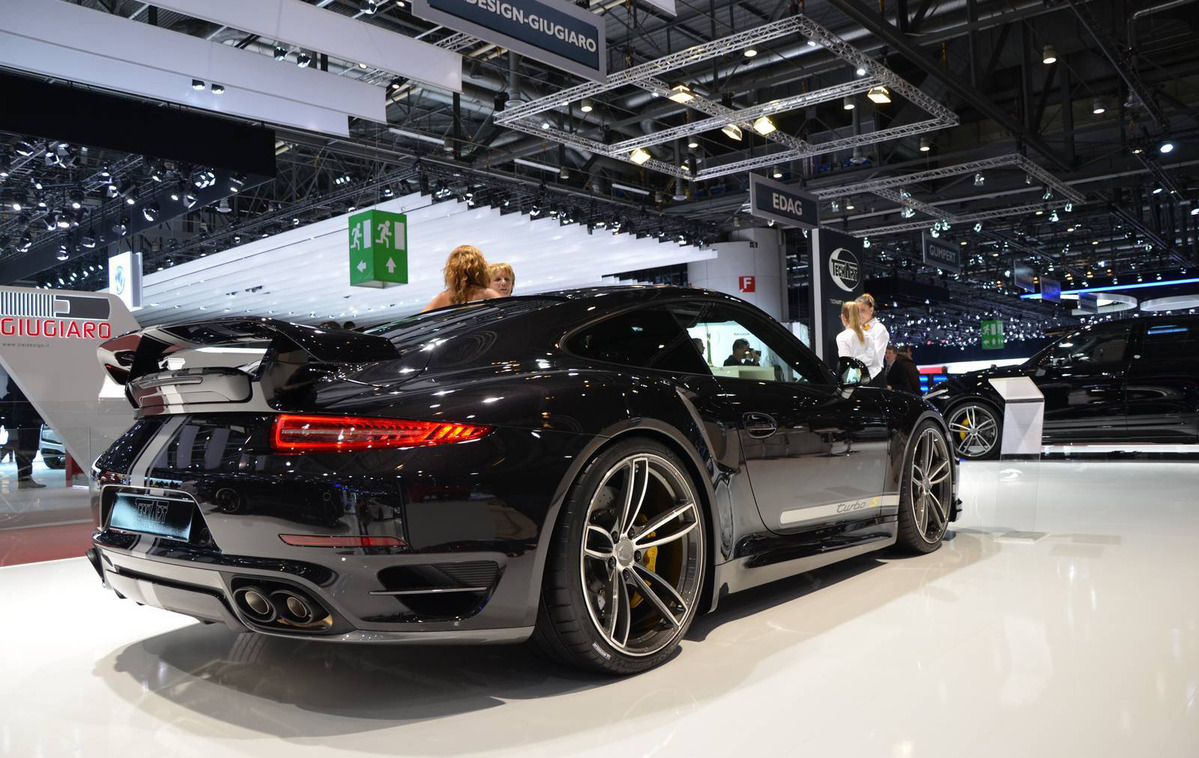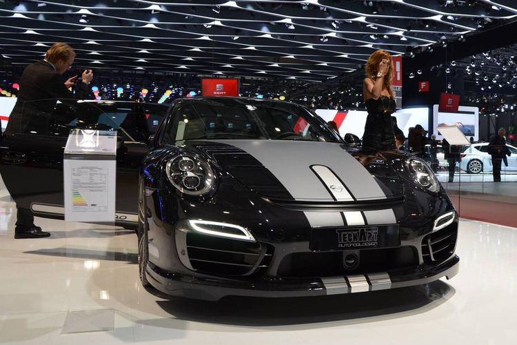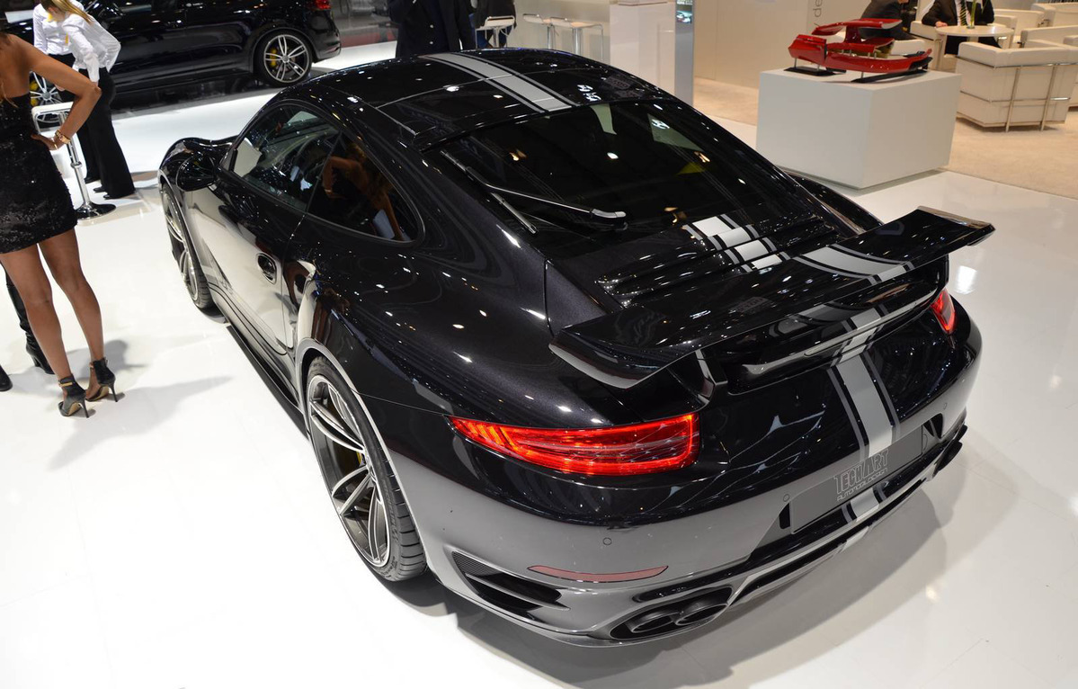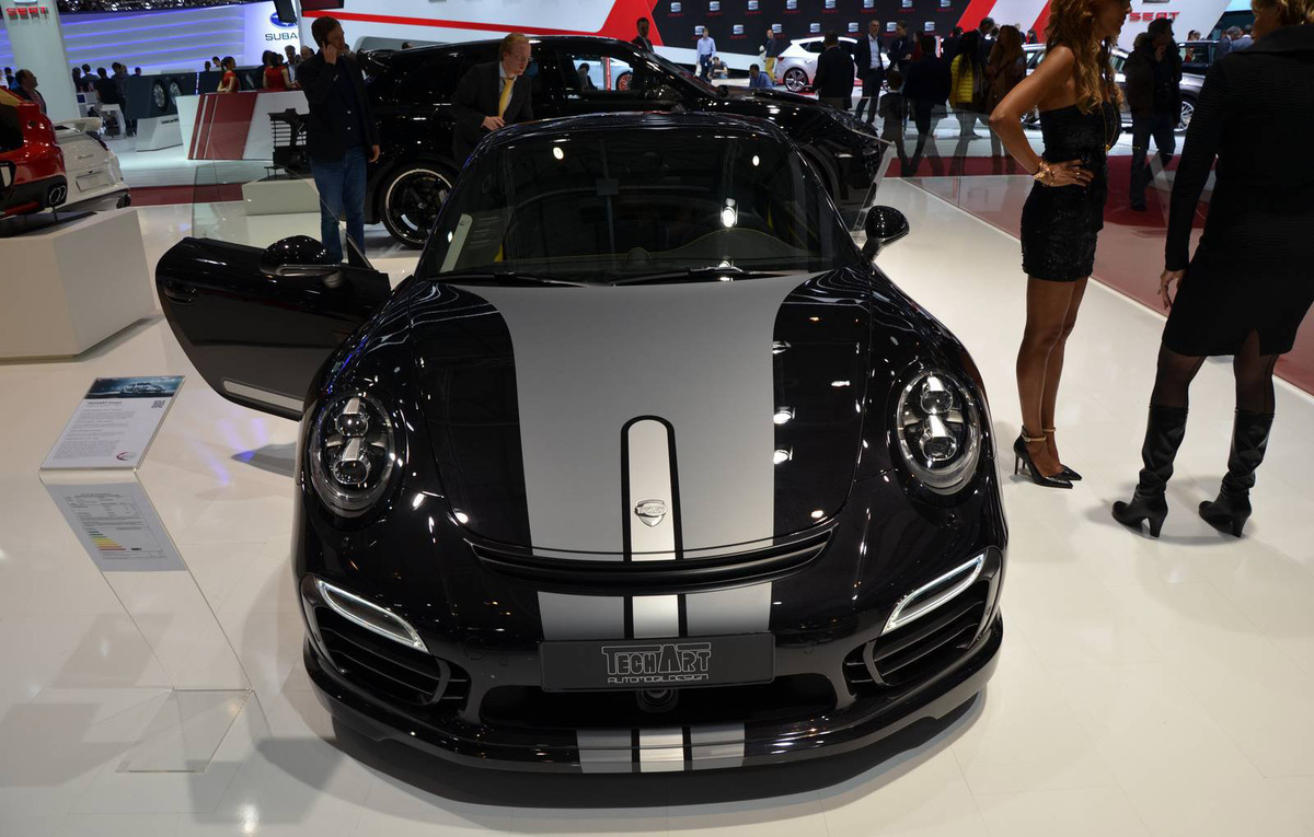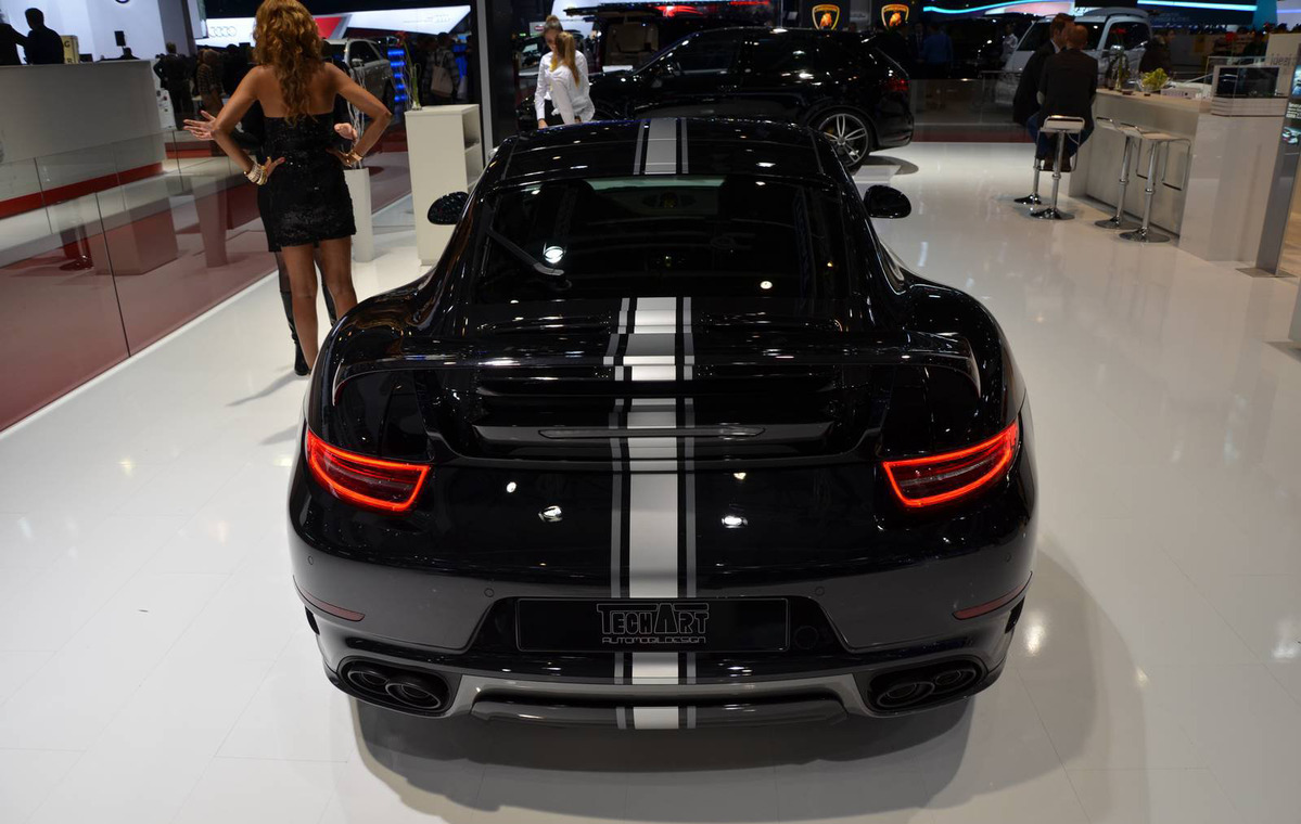 身為國際知名、專攻德國Porsche車款的御用改裝品牌TechArt針對991型Porsche 911 Turbo推出更多新套件,在先前於埃森車展(Essen Motor Show)登場時變已經推出不少改裝部品。如今,面對盛大的日內瓦車展(Geneva Motor Show),TechArt以一部黑色塗裝2014年Porsche 991 Turbo S為展示車款,外觀部分大致上與先前登場的相同,裝上專為Turbo車型開發、擁有流體力學效果的前下巴,另外加裝頭燈周邊環形飾蓋、可以修飾腰身曲線的側裙組、後上擾流尾翼與後下擾流板等部品。除此之外,TechArt選用型號Formula IV、採用五幅雙肋設計的雙色版本21吋輪圈,同時將煞車卡鉗與後視鏡蓋等處施以黃色塗裝,呼應點貼於車側的黃色英文字母S,而貫穿全車的車身飾條以銀、白色為主。