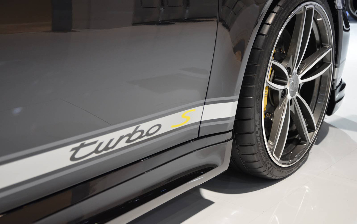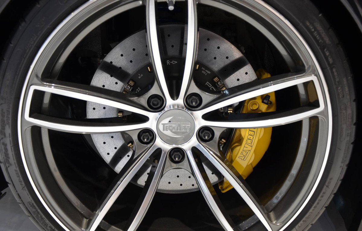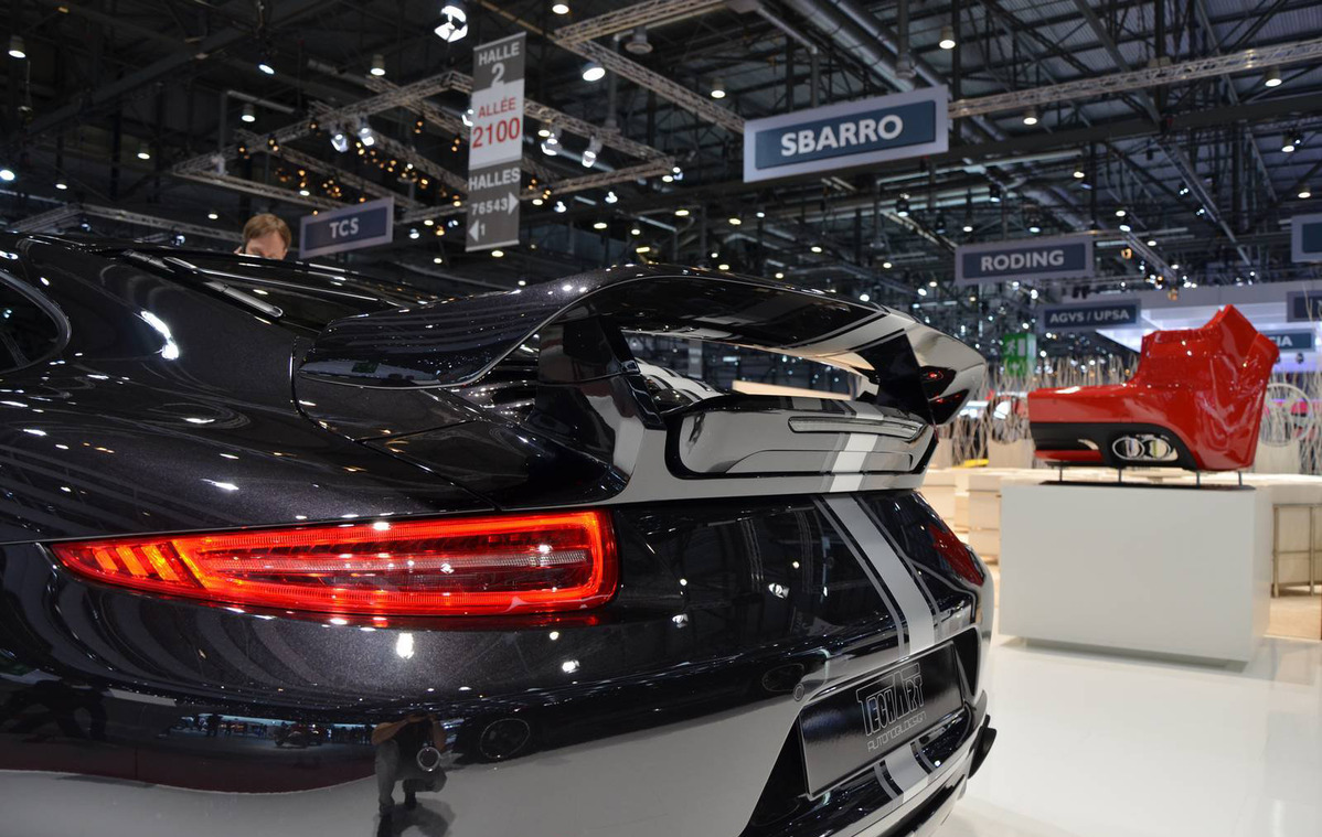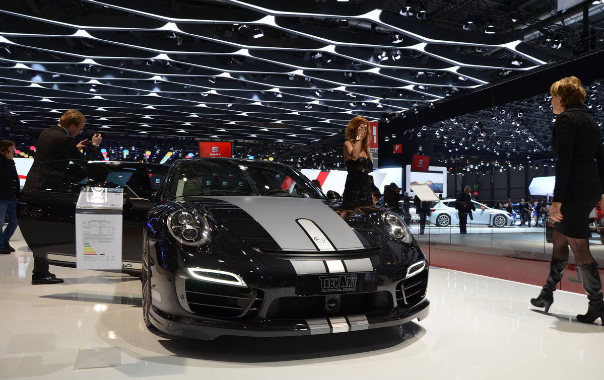 身為國際知名、專攻德國Porsche車款的御用改裝品牌TechArt針對991型Porsche 911 Turbo推出更多新套件,在先前於埃森車展(Essen Motor Show)登場時變已經推出不少改裝部品。如今,面對盛大的日內瓦車展(Geneva Motor Show),TechArt以一部黑色塗裝2014年Porsche 991 Turbo S為展示車款,外觀部分大致上與先前登場的相同,裝上專為Turbo車型開發、擁有流體力學效果的前下巴,另外加裝頭燈周邊環形飾蓋、可以修飾腰身曲線的側裙組、後上擾流尾翼與後下擾流板等部品。除此之外,TechArt選用型號Formula IV、採用五幅雙肋設計的雙色版本21吋輪圈,同時將煞車卡鉗與後視鏡蓋等處施以黃色塗裝,呼應點貼於車側的黃色英文字母S,而貫穿全車的車身飾條以銀、白色為主。