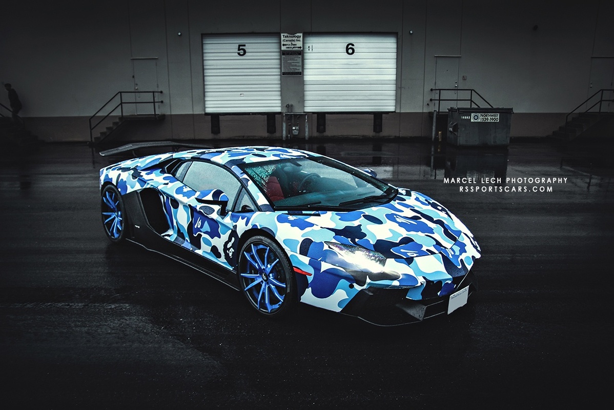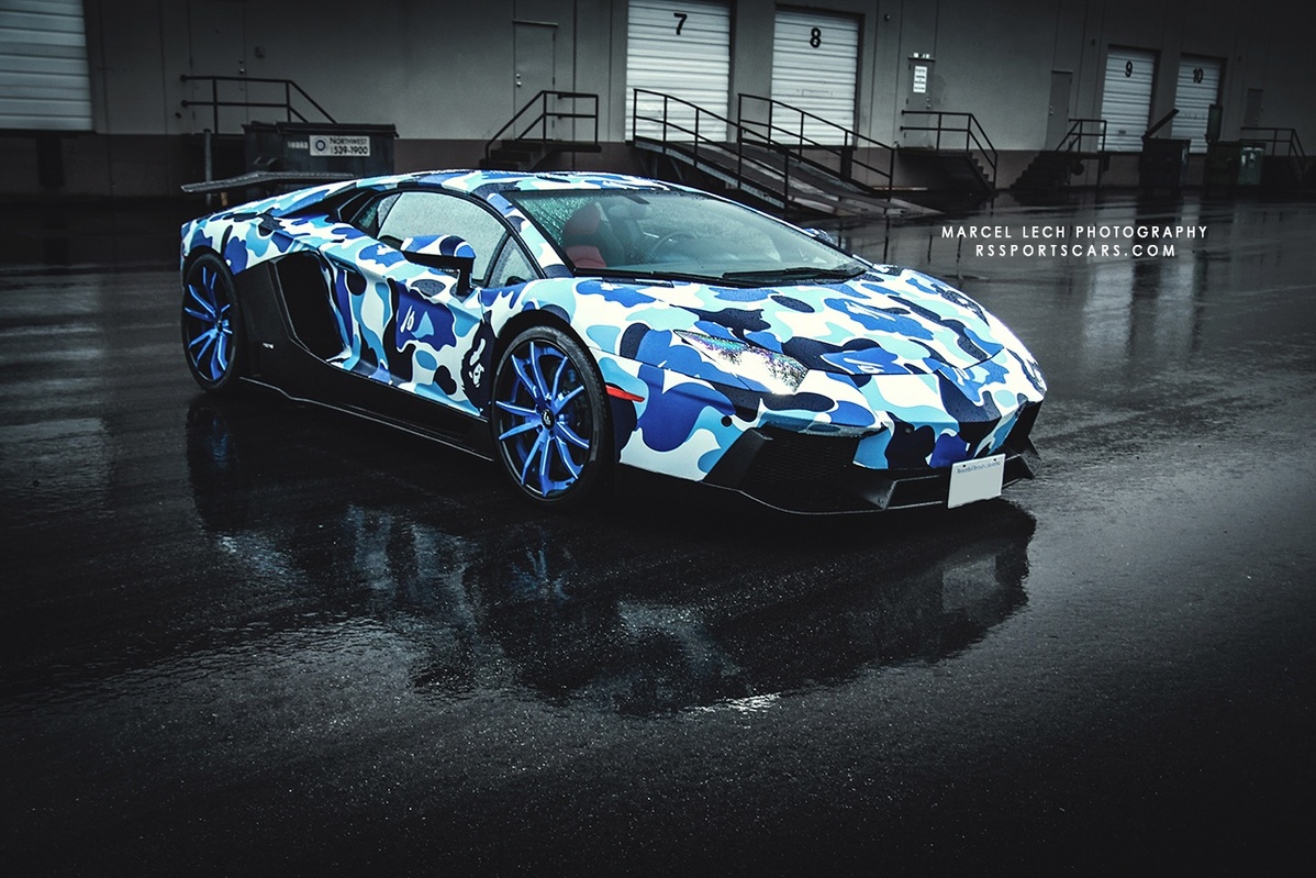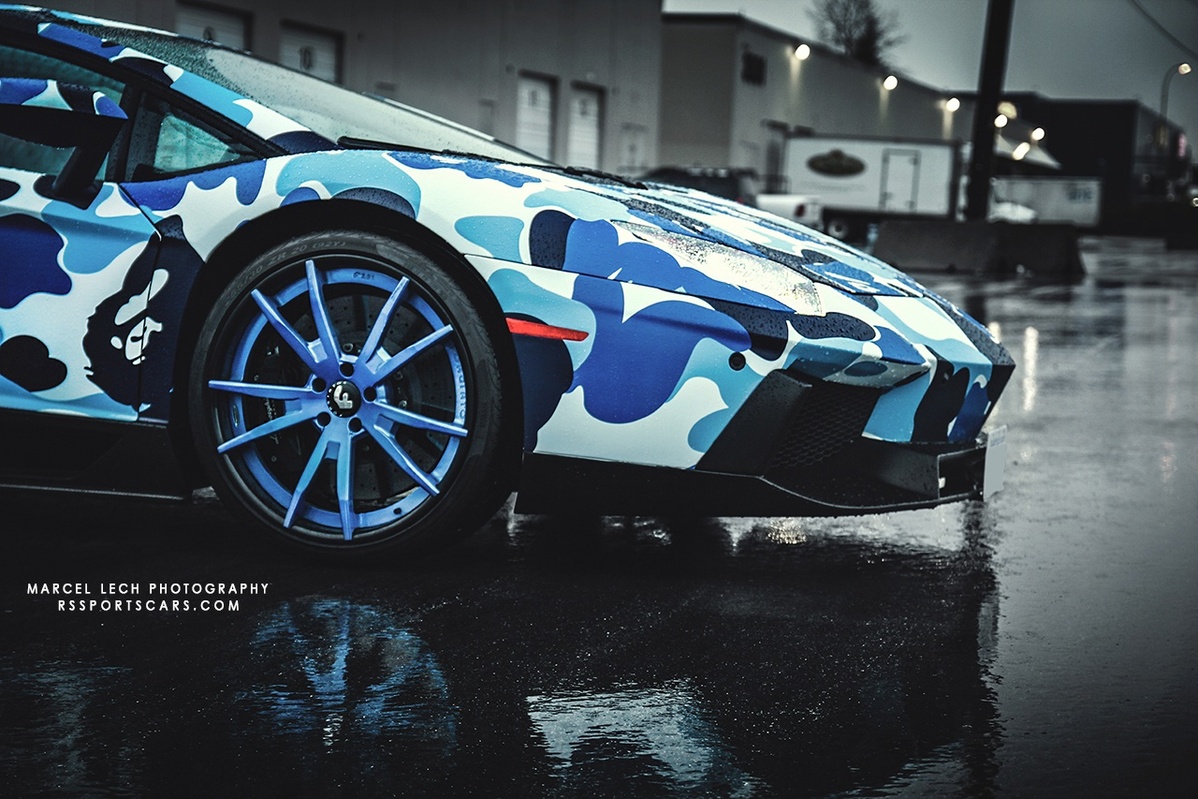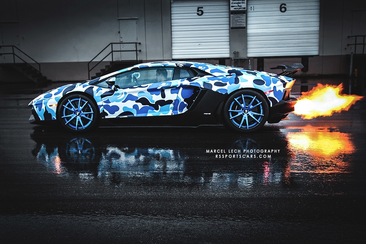 常被老一輩誤以為是鬍鬚張的BAPE應當是讀者們相當熟悉的潮流品牌,而先前也為各位報導過覆上綠色BAPE圖騰的Ferrari 458 Italia,而今天要帶給各位由攝影專家Marcel Lech所拍攝的是藍色版本、BAPE式樣的Lamborghini Aventador LP700-4。該車另外裝有日本品牌Liberty Walk Performance出品的碳纖維前下巴、側裙組、後下擾流板與後上擾流尾翼等配件、輪圈來自Forgiato Wheels,而排氣管則選用Innotech部品,無疑地,即使沒有這些精裝部品加持,這樣貼滿BAPE圖騰有Lamborghini Aventador LP700-4也絕對吸睛滿點。