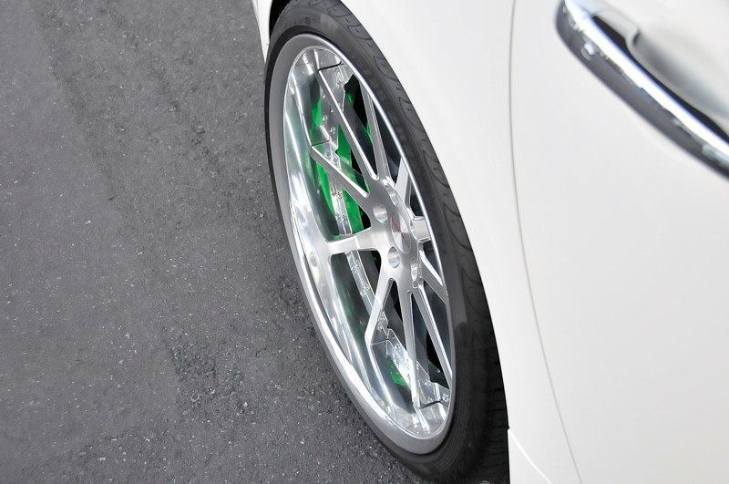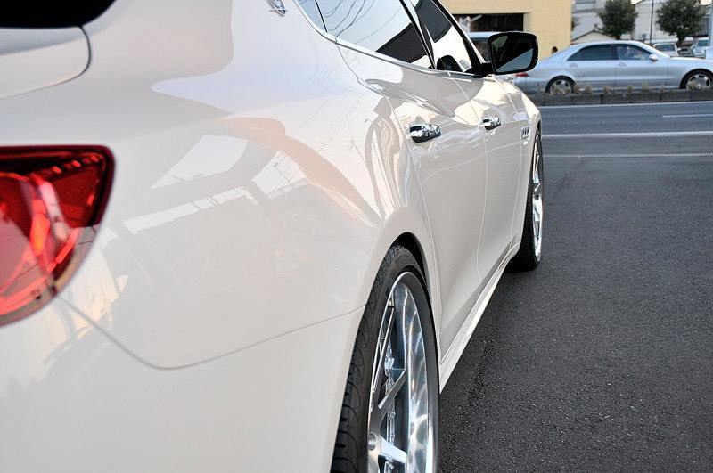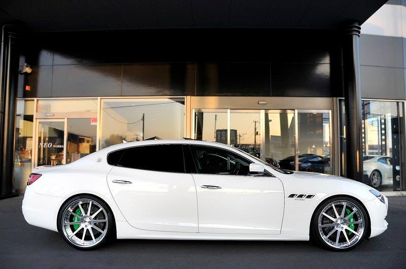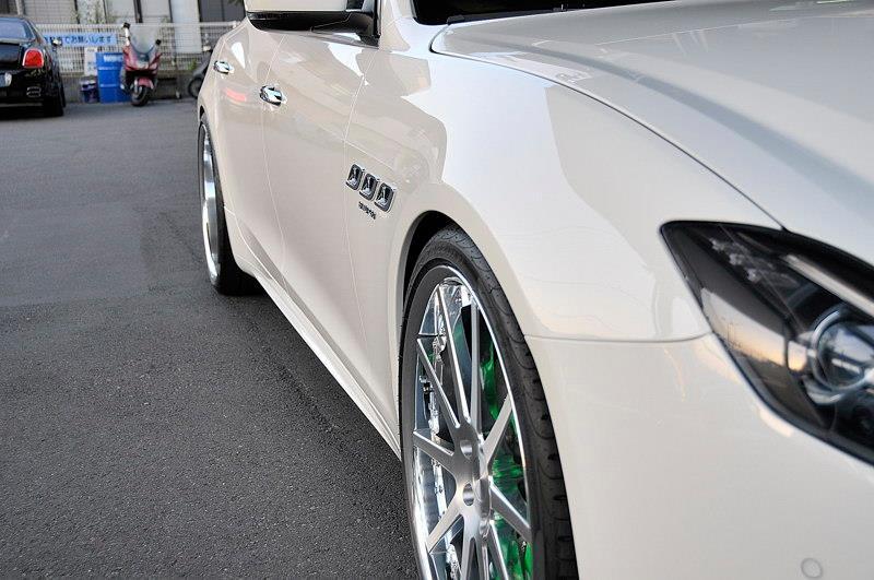 今天帶給各位由日本知名車商Auto Plaza Dank所展示的白色塗裝2014年款式Maserati Quattroporte GTS,足登Hyper Forged Wheels出品、型號HF-C10的輪圈,尺寸為前22x9.5J、後22x11.5J的前後配設定,搭配前255/30R22、後315/25R22的Pirelli P Zero Nero高性能跑胎,另外透過高低軟硬可調式避震器組將車身降低,而輪圈細緻的拋光處理與亮眼的綠色塗裝煞車卡鉗配在這部義大利頂尖房車身上,營造出極具質感的優雅跑格。