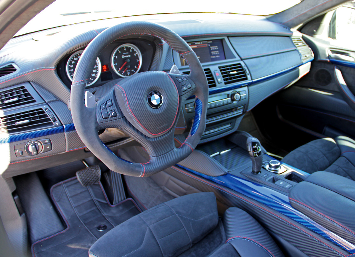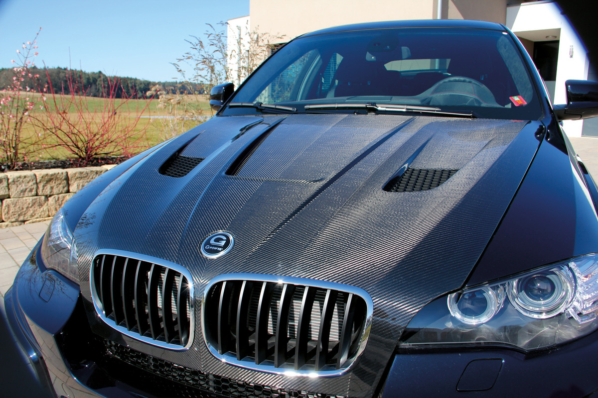 外觀方面,G-Power為這部BMW X6 M換上全車空力套件,包含重新設計的前保桿、開孔式樣碳纖維引擎蓋、側裙組、後保桿、後下擾流板與後擾流尾翼等部品,再加上多片式消光黑色處理的放射狀輪圈與中置雙出排氣管尾段之點綴,將整部車塑造得霸氣有型。