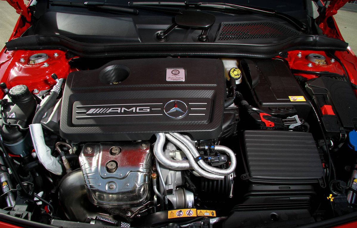 在過去,Mercedes Benz慣於使用大排氣量引擎來壓窄馬力,而在容積效率方面往往不敵車壇中許多性能車款,不過這些刻板印象在A45 AMG與CLA45 AMG等車款登場後立刻被扭轉。藉由高端引擎強化技術,Mercedes Benz以這顆2.0升渦輪增壓四缸引擎創造出360HP的最大馬力,容積效率之高,放眼全球量產車,除了如McLaren P1等數款超級跑車外,幾乎沒有對手。