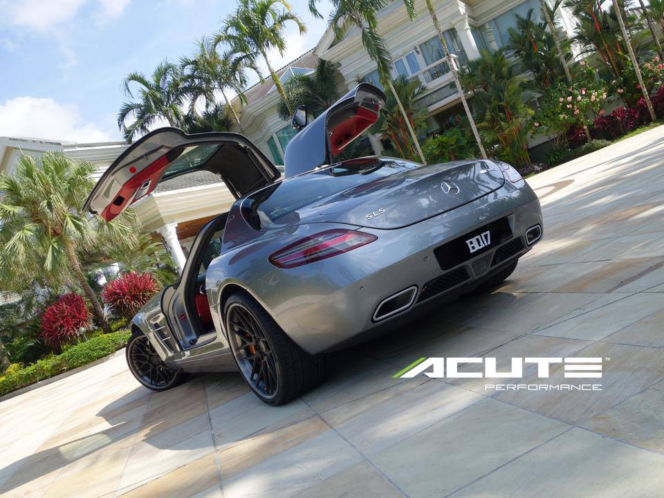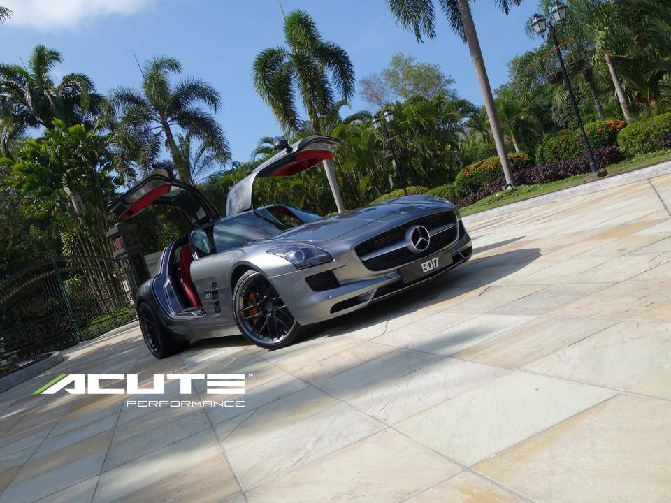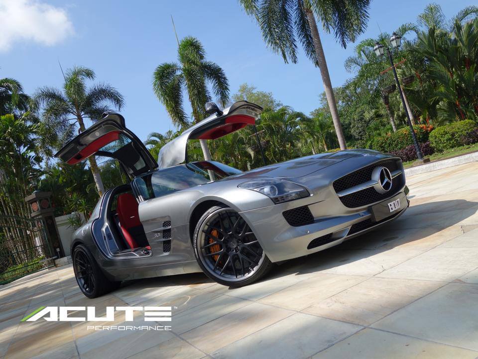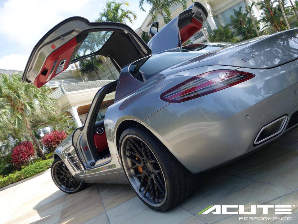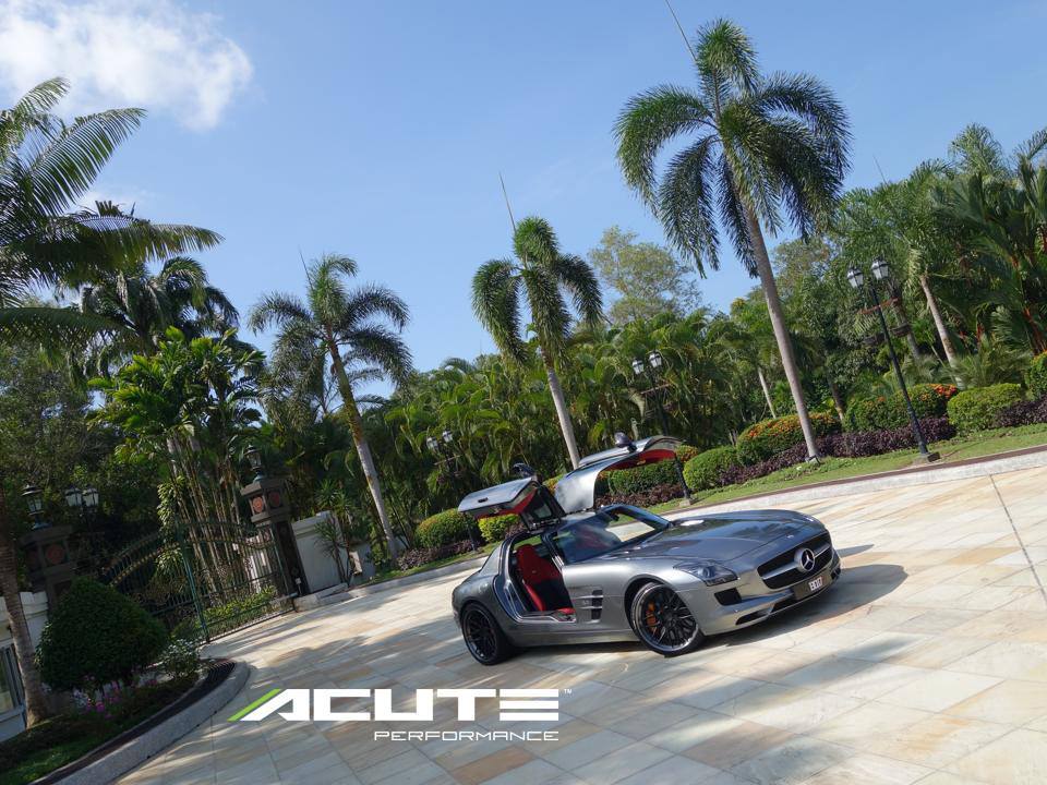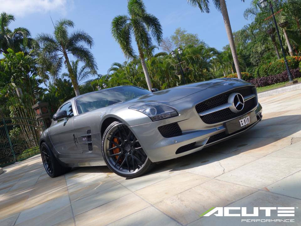 今天帶給各位由美國改裝廠Acute Performance所操刀的Mercedes Benz SLS AMG,換裝ADV.1 Wheels出品、型號ADV8 TS SL的輕量化輪圈,尺寸為前20x10J、後21x12J的前後配設定,均較出廠時大上一吋,而中心採用消光黑色塗裝,搭配手工刷痕槍灰色外圈,頓時讓整部車增加不少動感氛圍。