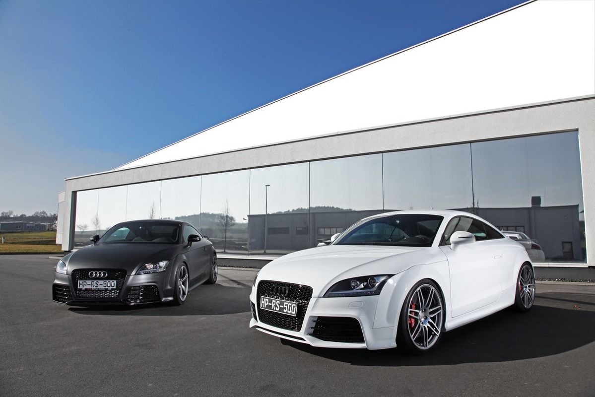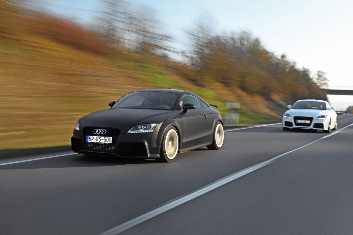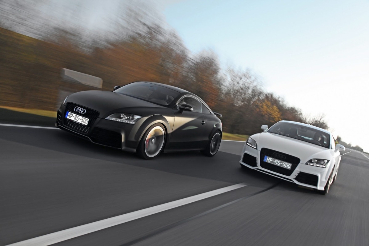 在新款Audi TT-RS尚未登場前,我們來觀摩一下由改裝廠HPerformance所操刀的兩部Audi TT-RS,透過電腦程式的改寫並且換裝鋁合金中央冷卻器、全新渦輪機、JS賽車用觸媒、高效能進氣系拱與排氣管等部品,將最大馬力提升至500HP,扭力則由原廠的45.9kgm提升至72.4kgm,讓這兩部Audi小跑車擁有脫胎換骨的性能表現。