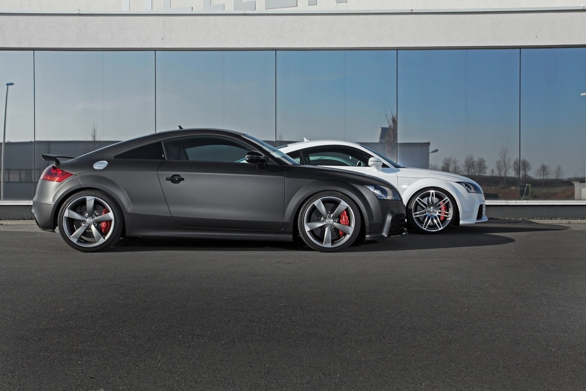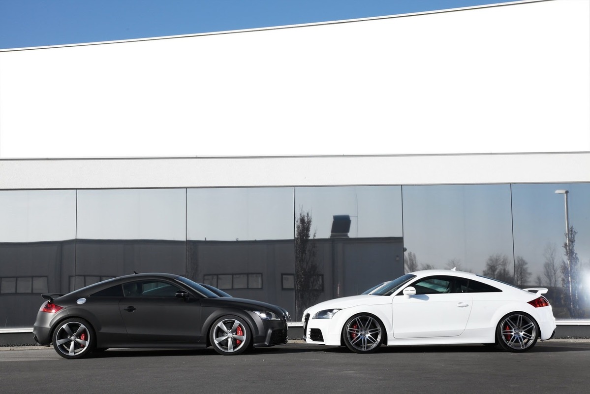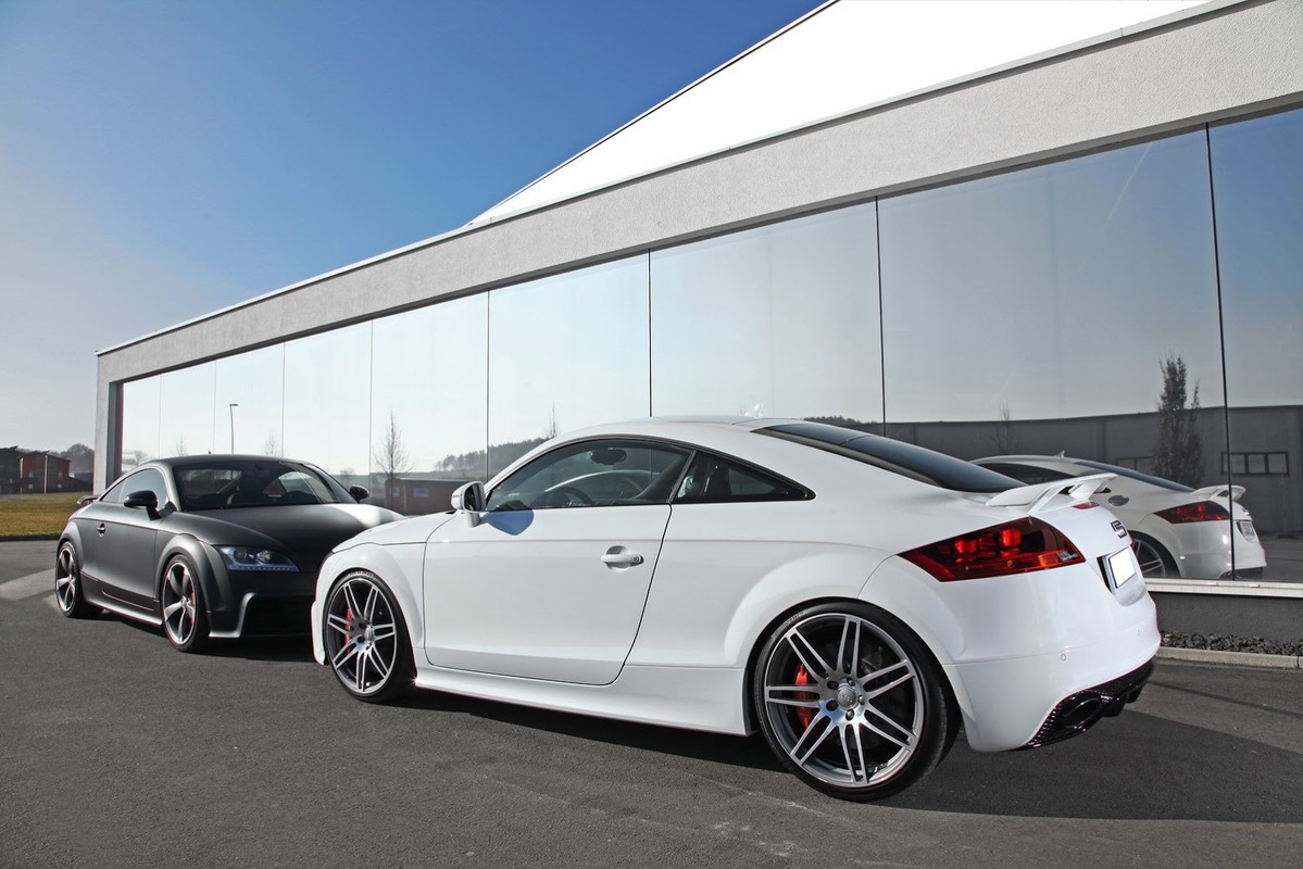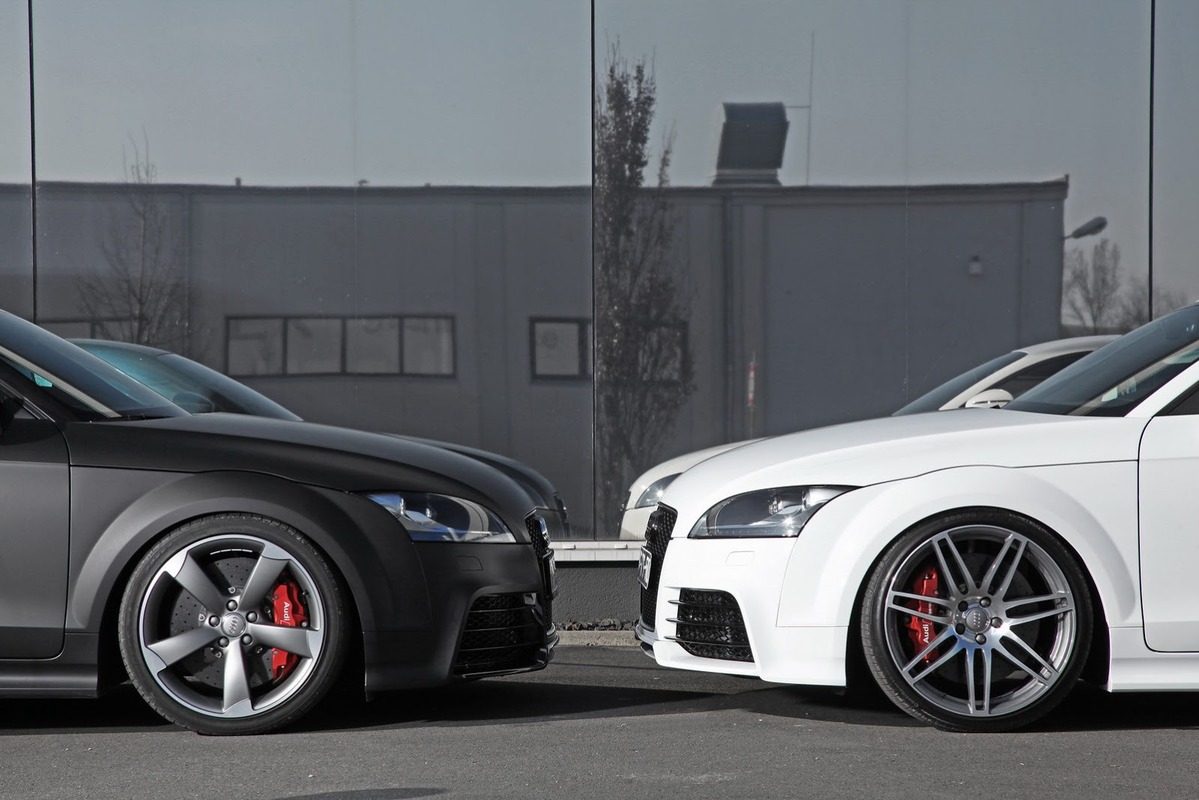 在新款Audi TT-RS尚未登場前,我們來觀摩一下由改裝廠HPerformance所操刀的兩部Audi TT-RS,透過電腦程式的改寫並且換裝鋁合金中央冷卻器、全新渦輪機、JS賽車用觸媒、高效能進氣系拱與排氣管等部品,將最大馬力提升至500HP,扭力則由原廠的45.9kgm提升至72.4kgm,讓這兩部Audi小跑車擁有脫胎換骨的性能表現。