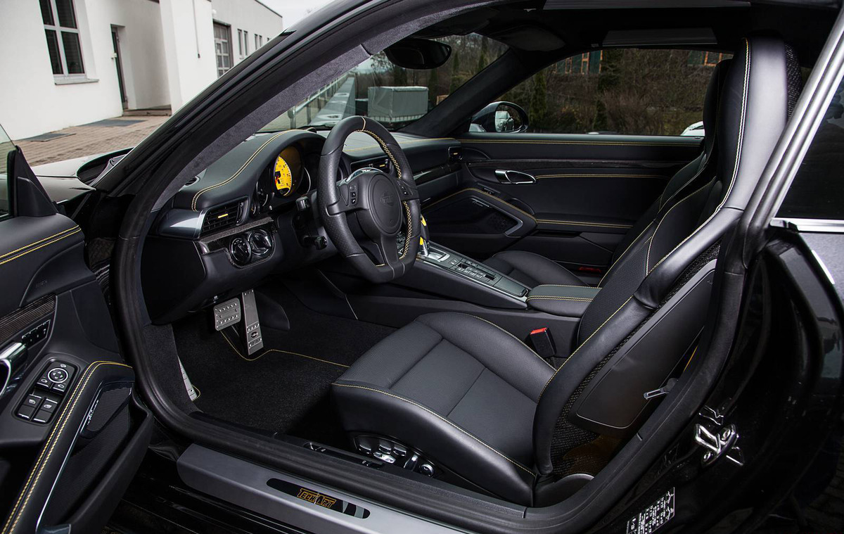 外觀部分,TechArt為這部黑色渦輪跑車裝上專為Turbo車型開發、擁有流體力學效果的前下巴,另外加裝頭燈周邊環形飾蓋、可以修飾腰身曲線的側裙組、後上擾流尾翼與後下擾流板等部品。除此之外,TechArt選用型號Formula IV、採用五幅雙肋設計的雙色版本21吋輪圈,同時將煞車卡鉗與後視鏡蓋等處施以黃色塗裝,呼應點貼於車側的黃色英文字母S,而貫穿全車的車身飾條以銀、白、灰色為主。