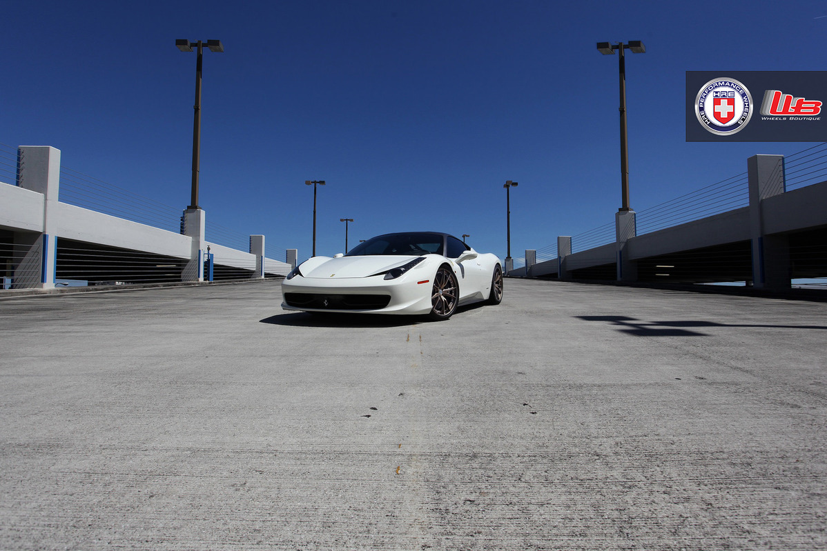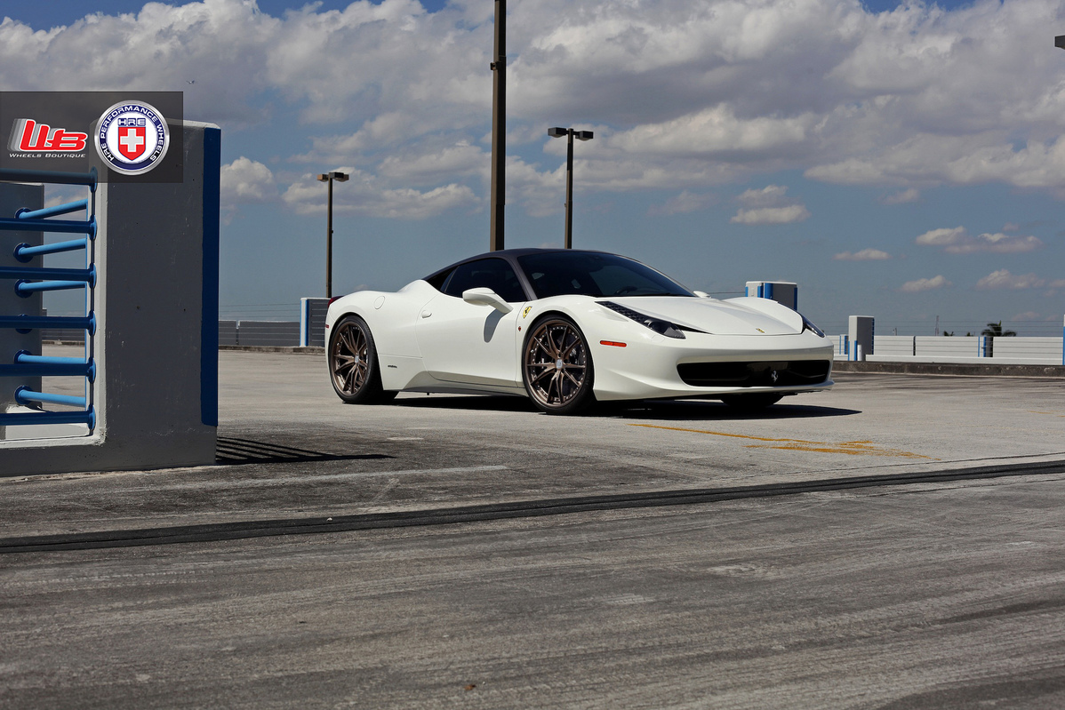 今天奉上的是一部由改裝廠Wheels Boutique提供、Bianco Avus白色塗裝Ferrari 458 Italia,足登知名品牌HRE Performance Wheels、型號S104的新款輪圈,圈面採用古銅色塗裝,車頂上半部與後保桿再以局部消光暗灰色貼膜包覆,使得整部車別具獨有風格。