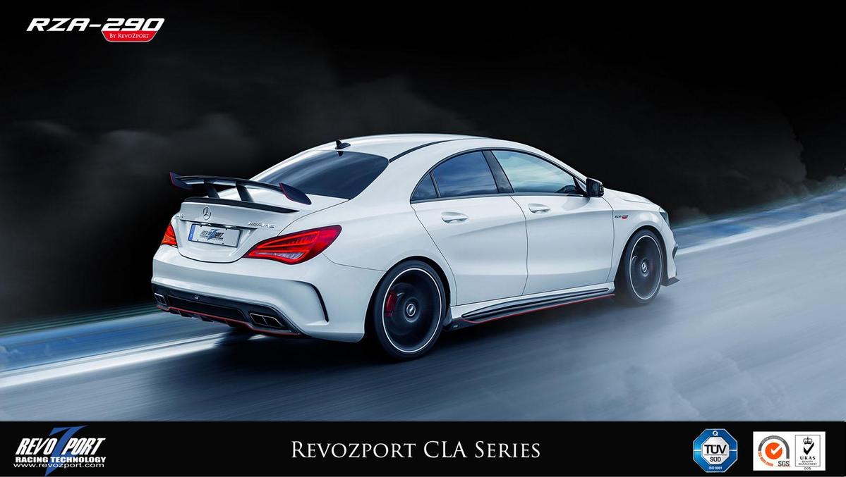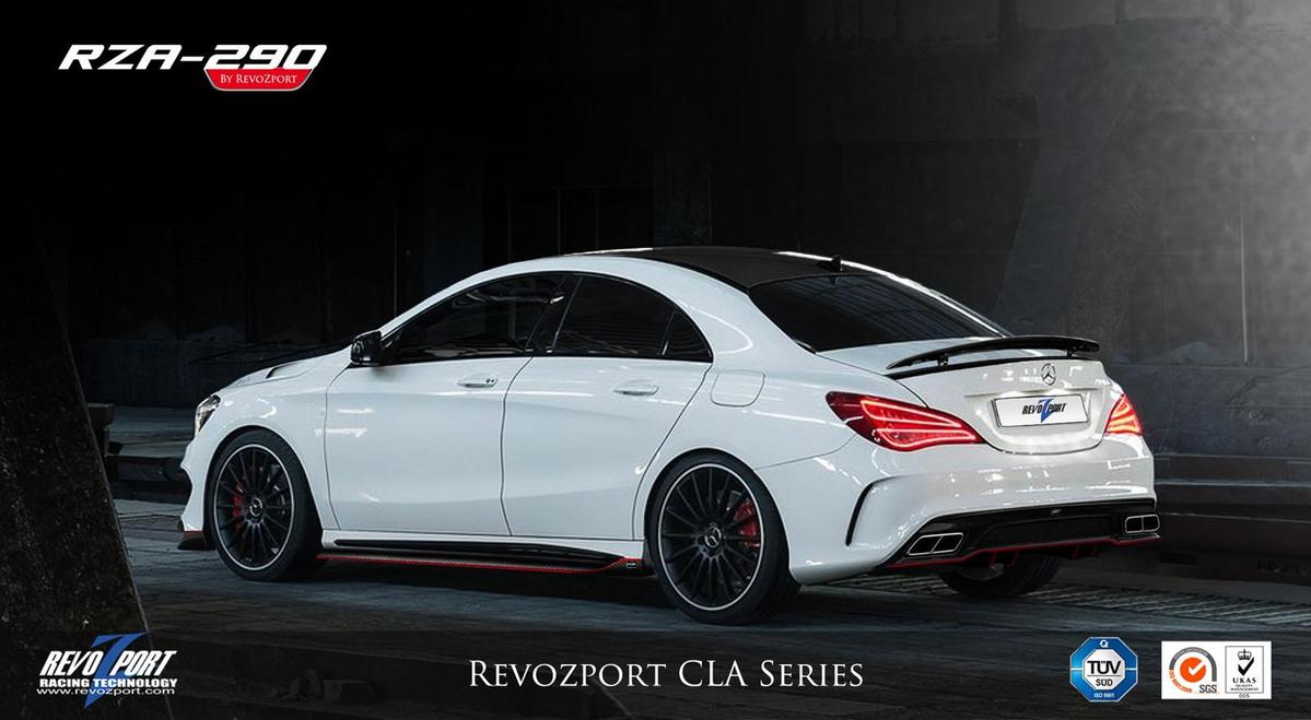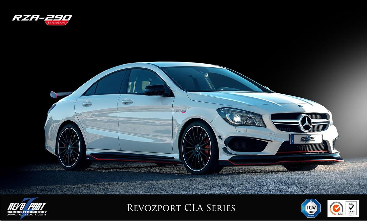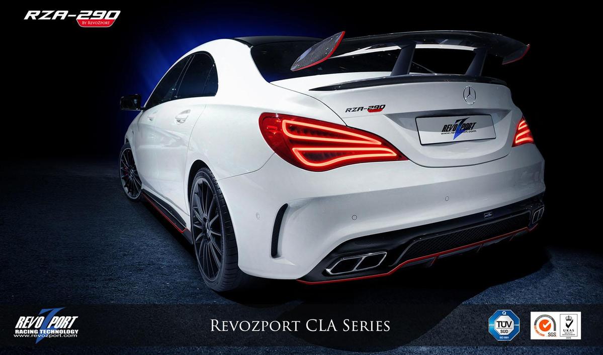 然而,市場上勢必會以中階版本的Mercedes Benz CLA250為大宗,改裝市場部分可能會分為視覺系與動力系兩大族群,前者可能為購買CLA250或CLA200車型者,後者可能會以CLA45 AMG為主。因此,改裝廠RevoZport針對這部新款小型轎跑車推出一系列外觀套件,取名RevoZport RZA-290,適用於CLA全車系,包含三款不同式樣的後擾流尾翼、前下巴與側裙組,另外還提供鈦合金排氣管尾段讓消費者選購,讓配有原廠AMG空力套件的CLA-Class變得更具霸氣。內裝部分,RevoZport提供高質感鋁合金踏板組與腳踏墊等精緻部品。另外,將該組套件取名RevoZport RZA-290是否意味著能夠將CLA250的最大馬力提升至290HP,這點則尚須RevoZport進一步說明。