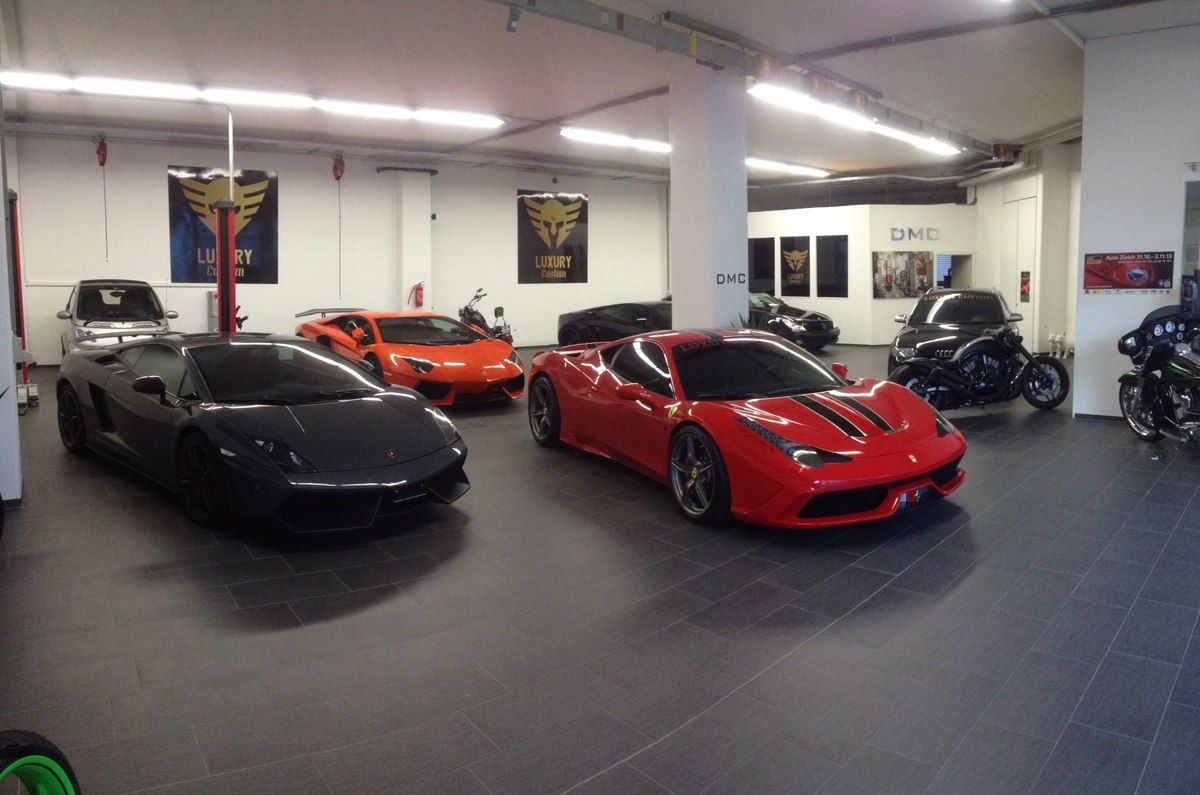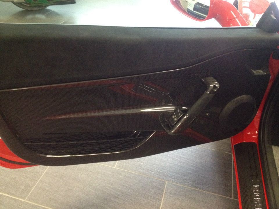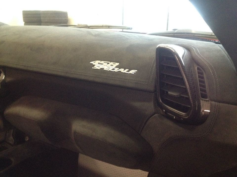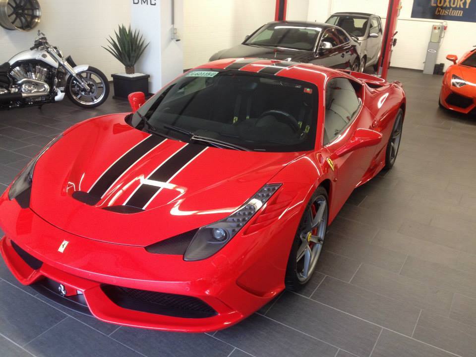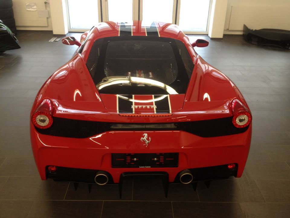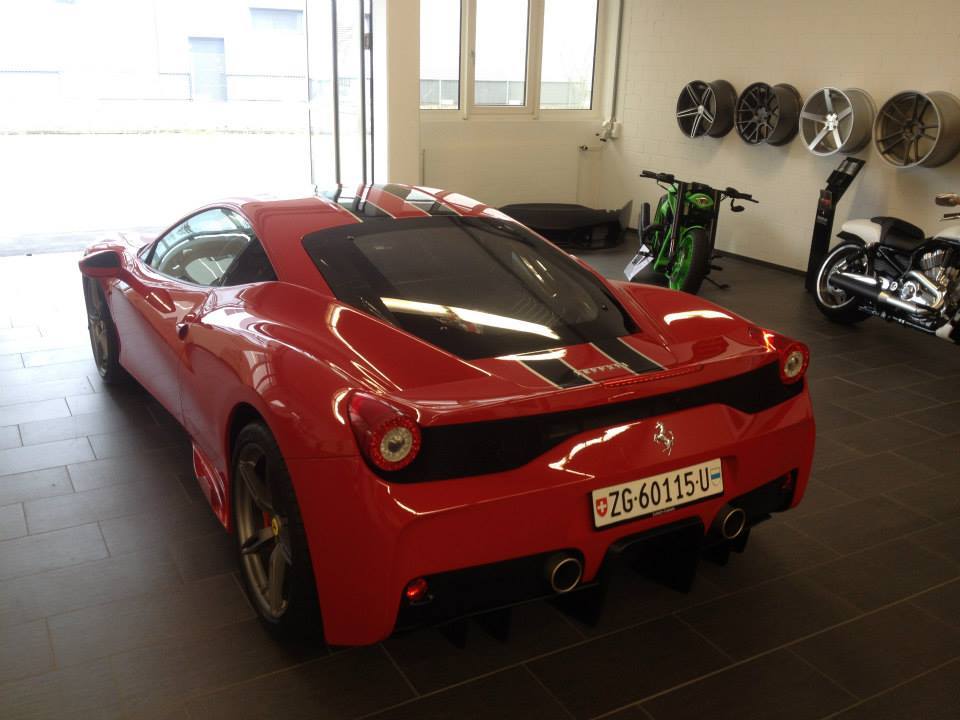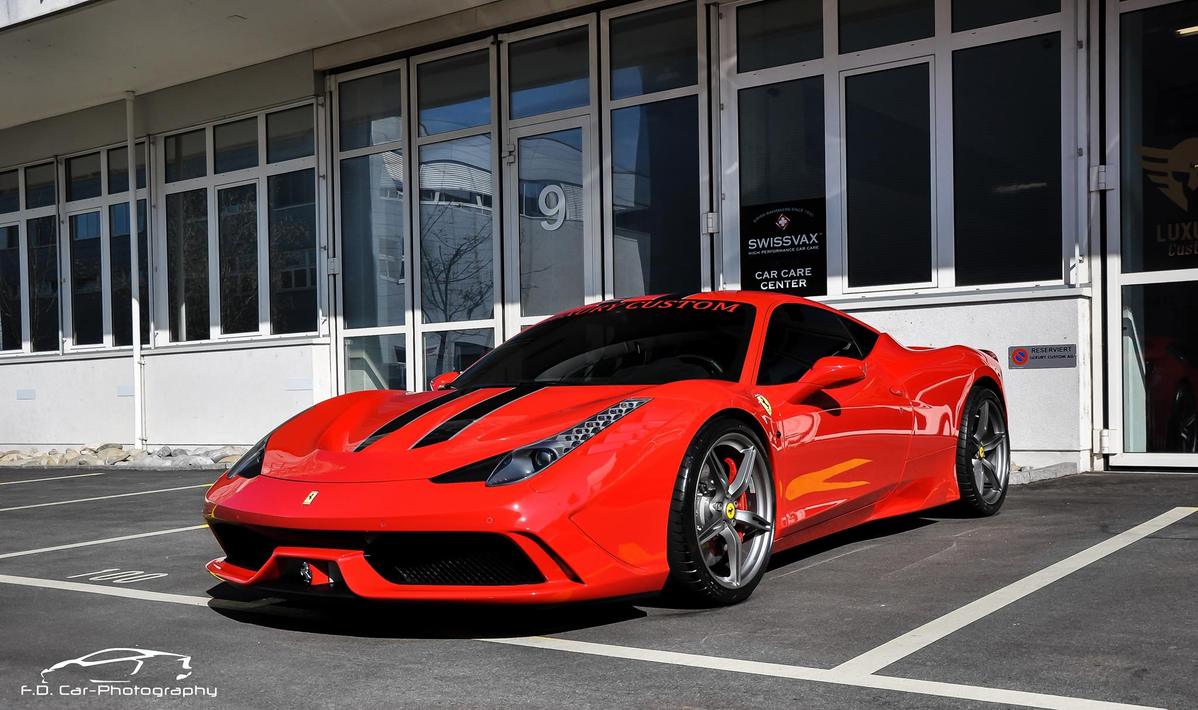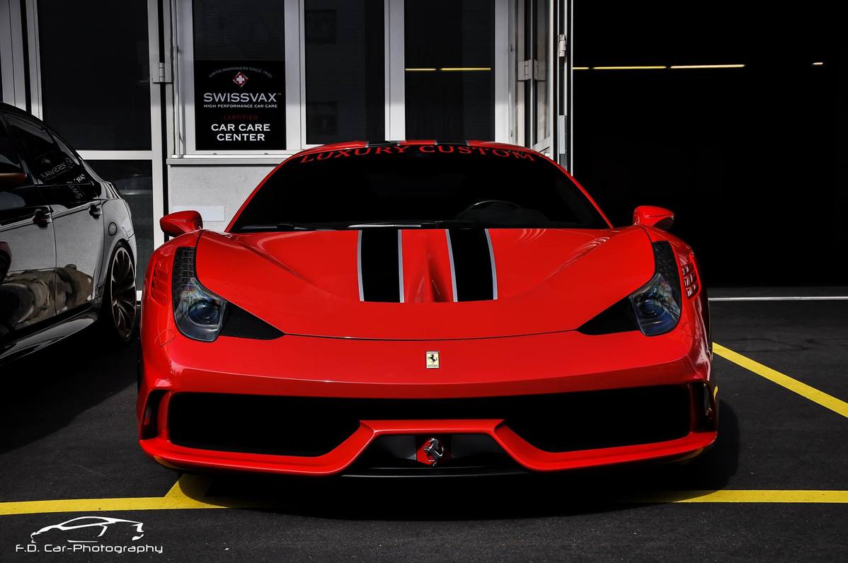 專精於超級跑車改裝同時代理DMC套件的瑞士(Swiss)改裝廠Luxury Custom最近剛拿到他們的Ferrari 458 Speciale,該部輕量化紅鬃烈馬在車身飾條部分選用黑色銀邊版本,輪圈為鐵灰色款式,再加上紅色煞車卡鉗,配在火紅色車身上相當協調。內裝方面,將來可能會成為Luxury Custom御用店車的它以黑色麂皮、黑色車縫線與Speciale特有的碳纖維門板與鋁合金腳踏墊等搭配,僅在座椅頭枕Ferrari logo刺繡部分才能看到紅色蹤跡,營造出極具整體感的素雅競技氛圍。