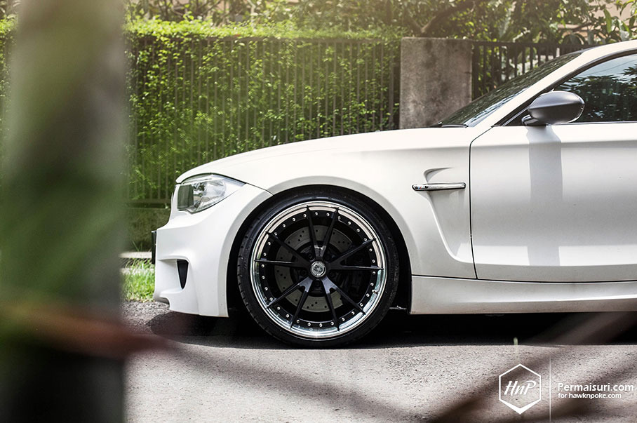 今天帶給各位由坐落於印尼雅加達(Jakarta, Indonesia)、當地最具盛名的改裝廠Permaisuri所操刀的白色BMW E82 1M Coupe,選用他們所代理的輪圈品牌HRE Performance Wheels、型號S104的新款輪圈,中心為黑色塗裝,外圈採用電鍍拋光處理,搭配前245/30R20、後285/25R20的Toyo T1R街道用胎,另外換裝KW V3高低軟硬可調式避震器組將車身降低,再藉由高人氣的Akrapovic鈦合金排氣管修飾引擎聲浪。這樣沒有過度鋪陳,改走細緻妝點精品路線的BMW 1M Coupe,各位喜歡嗎?