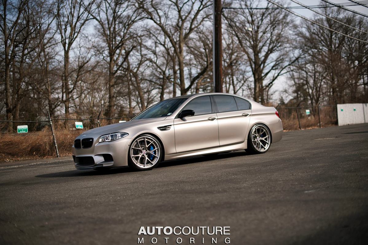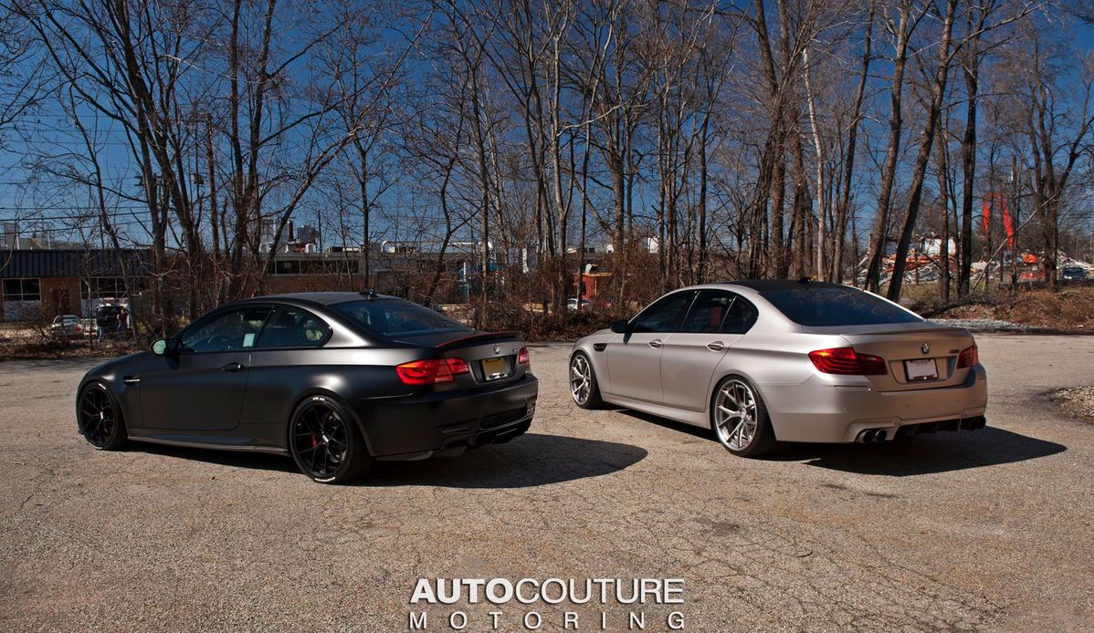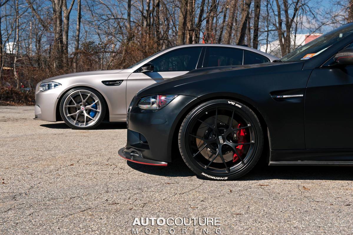 今天帶給各位由美國紐澤西(New Jersey, USA)改裝廠AUTOcouture Motoring所操刀的2014年款式BMW F10 M5,小改款後的它在頭燈與尾燈處展現更成熟內斂之風味,而改裝廠也為它選用知名品牌HRE Performance Wheels出品、型號S101的輪圈,再透過換裝高低軟硬可調式避震器組將車身降低,車身採用少見的消光香檳金色貼膜,使得這部德國高性能房車氣質與動感兼具,與同樣來自BMW M部門、即將成為曠世經典的消光黑色BMW E92 M3停放在一起進行拍攝,別有風趣。
