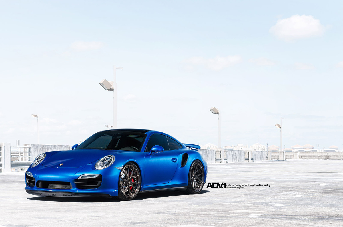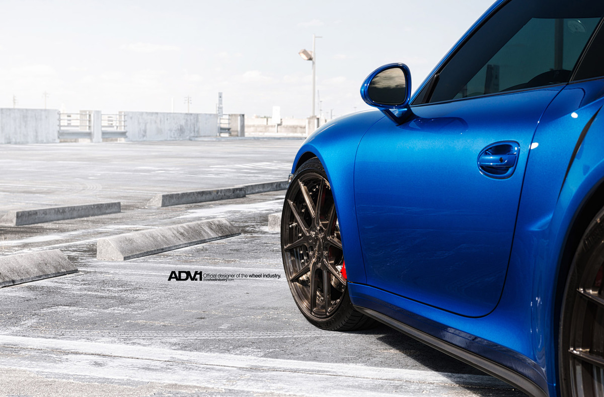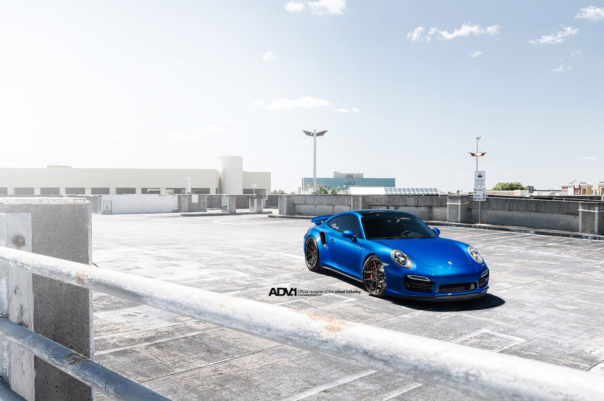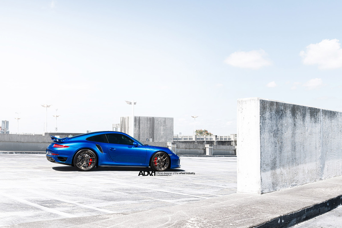 今天帶給各位一部由輪圈品牌ADV.1 Wheels所推出的藍色塗裝Porsche 991 Turbo,除了換裝高低軟硬可調式避震器組將車身降低外,另外選用ADV.1 Wheels、型號ADV5.0 MV2 SL的輪圈,尺寸採用前20x9J、後20x11J的前後配設定,而其特殊的手工刷痕槍灰色塗裝,配在亮眼的金屬藍色車身上,營造出別具風味的跑格。