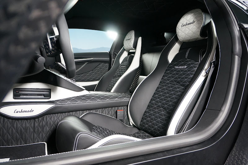 眼前就是Mansory最近打造的一台Lamborghini Aventador,全車包覆碳纖維飾板,全世界僅生產六部,而且據說六部都將被運往不同國度,各霸一地。Mansory給這台Aventador的代號是Carbonado,外觀已讓人久久無法回神,發動那具V12引擎,更能發現聲浪丕變,原來新增的兩具渦輪、鍛造活塞、鍛造連桿、凸輪軸與曲軸平衡等提升已使馬力從700hp爆增至1250hp!