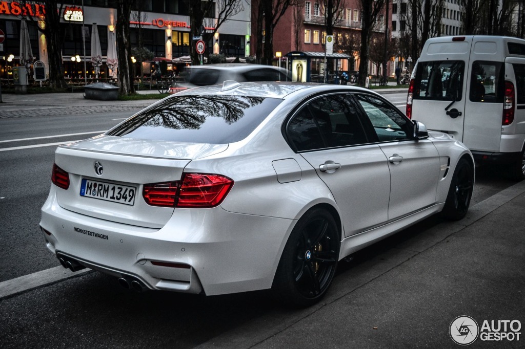 在數個月前的官方發表照片中,取名BMW M3的四門車型以亮眼的藍色塗裝現身,前保桿與現行F30車系所能選配到的M-Sport前保桿有些許差異,變得較具有侵略性,水箱罩採用黑色塗裝,而後視鏡部分則是延續傳統,擁有M3專屬的版本。此外,這部展示車配有五幅雙肋雙色輪圈、金色煞車卡鉗與碳纖維車頂,與前代四門版本E90 M3取消碳纖維車頂的規劃不同。車尾部分,BMW M3配有專屬的後保桿與後下擾流板,排氣管與前代車型相同,採用四出口設計。如今,有網友於德國慕尼黑(Munich, Germany)街頭拍到眼前這部珍珠白色(Mineral White)塗裝的BMW F80 M3,仔細觀察,配有前保桿橘色邊燈的它當屬美規車型,且其車尾貼著Werkstestwagen,可能是BMW原廠正在針對美規車型執行道路測試工作。
