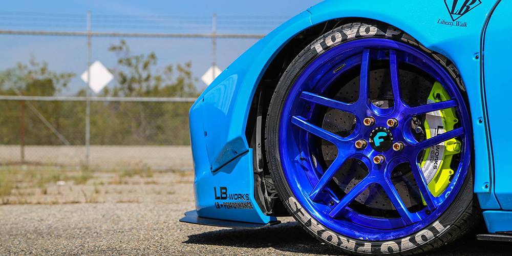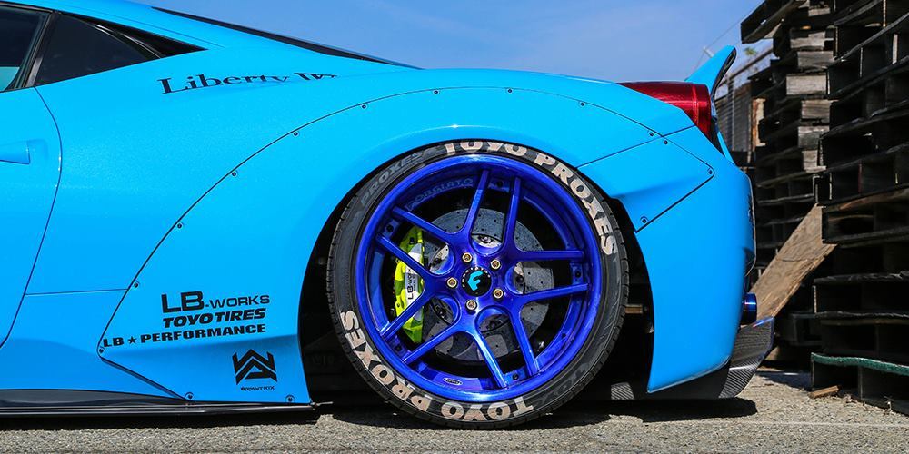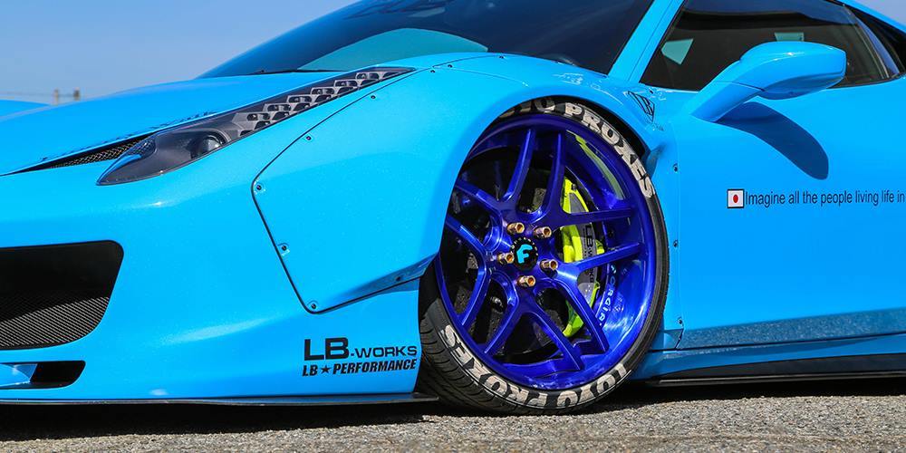 就這部LB Performance Ferrari 458 Italia的外觀而言,空力套件部分沿用原本設計,包含前下巴、葉子板寬車體套件、後下擾流板與後上鴨尾翼等部品,然而輪圈部分更換為來自Forgiato Wheels的產品,圈面採用對比的電鍍藍色塗裝,並且將Toyo街胎之側邊施以白色字體標示,展現出類廠車的霸氣跑格。