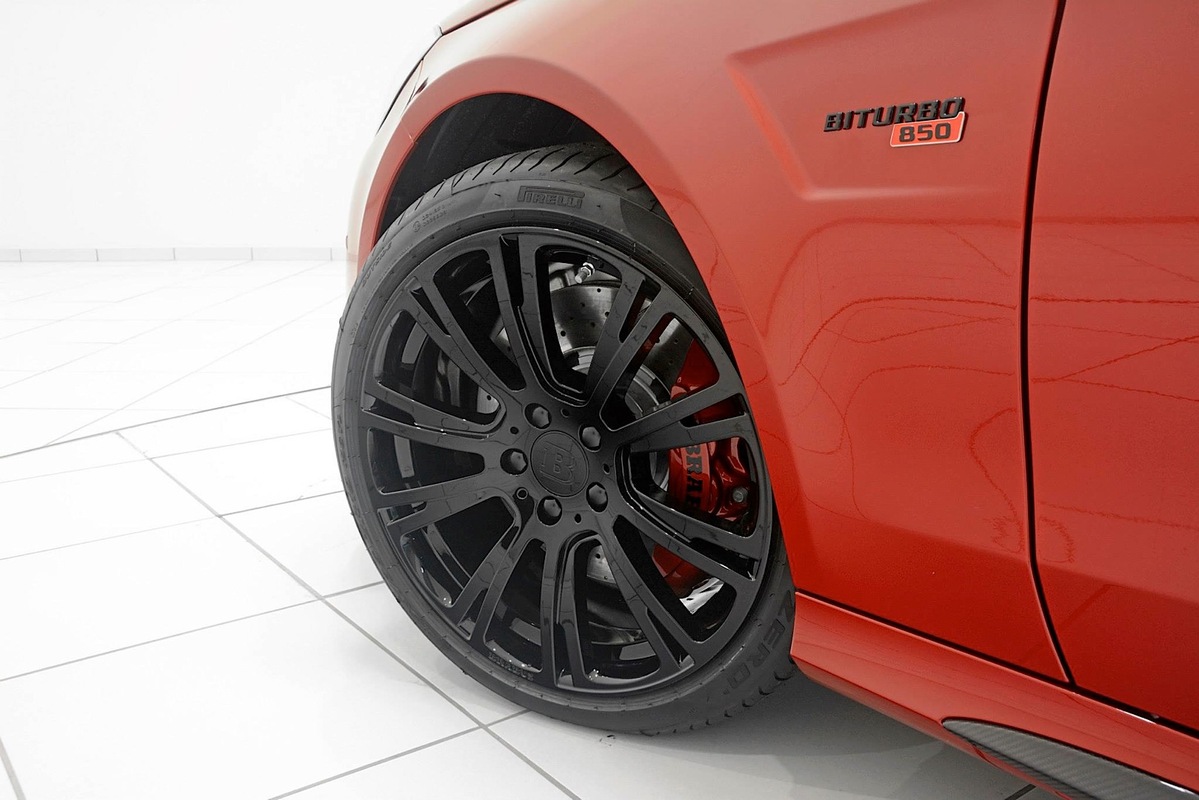 針對facelift最新款式W212、擁有585HP與四輪傳動系統的頂級版本Mercedes Benz E63 AMG S-Model,Brabus將眼前這部紅色房車取名Brabus 850 6.0 Biturbo 4Matic、改裝廠透過電腦程式改寫、全段排氣管換裝並將排氣量擴升至5.9升,將最大馬力提升至驚人的850HP最大馬力與147.5kgm超強扭力,使得身軀不小的它能繳出比Ferrari 458 Italia、Lamborghini Gallardo LP570-4等超級跑車更優異的3.1秒百里加速成績,以其龐大的身軀來說,算是相當強悍。