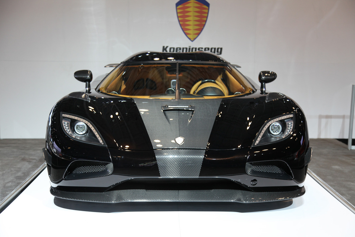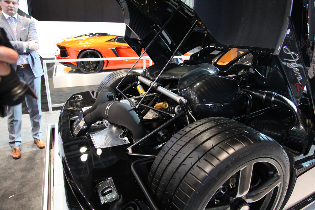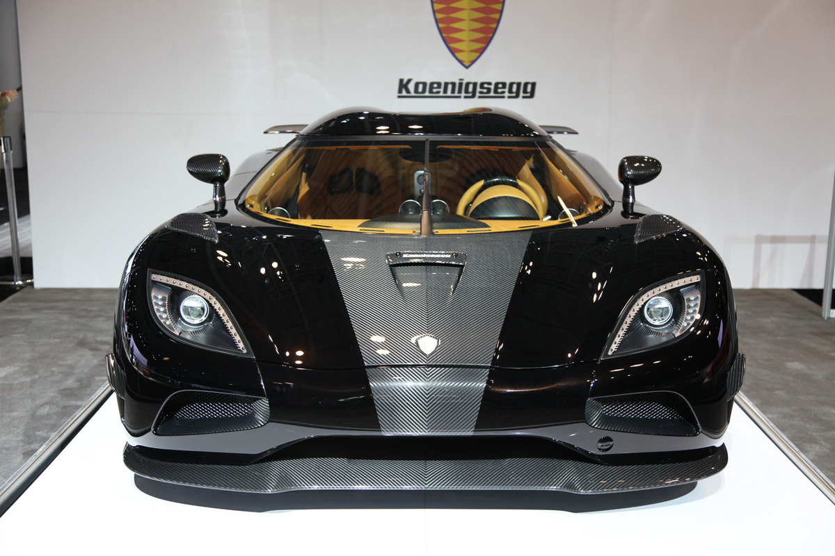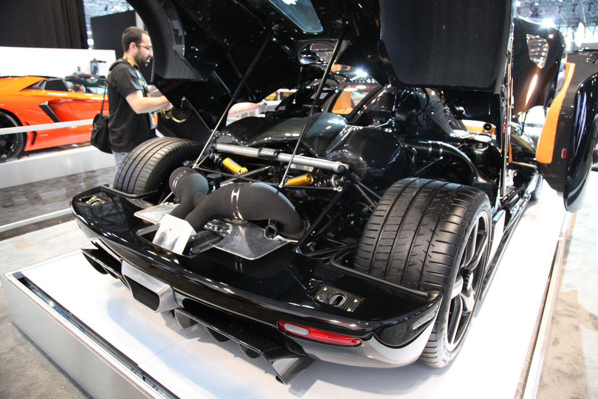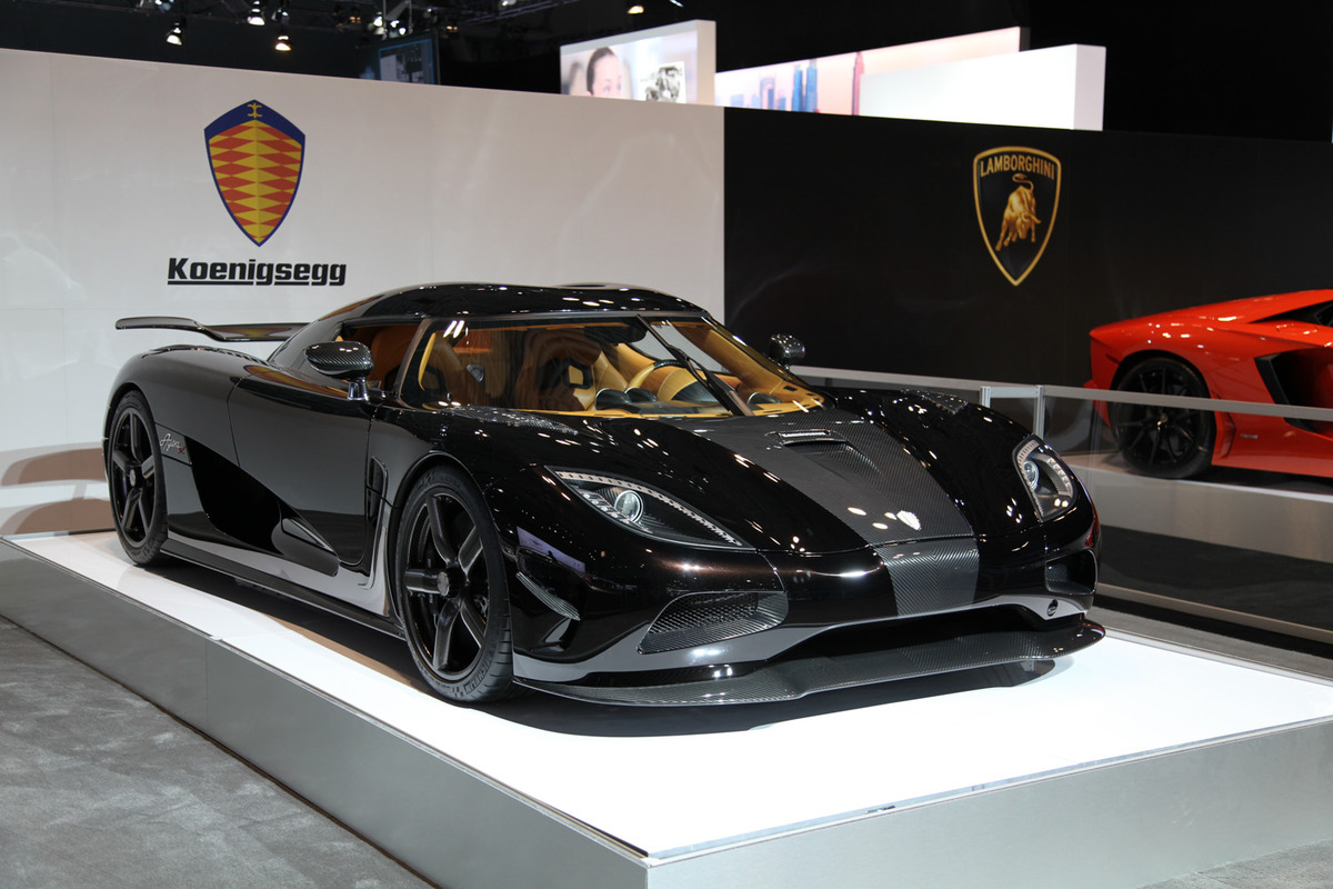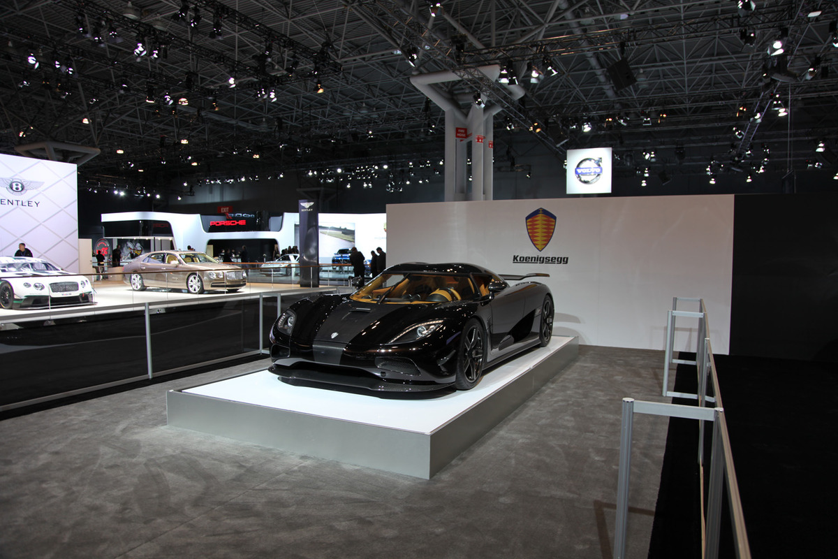 因此,面對今年熱鬧非凡的紐約車展(New York Motor Show),代理商Manhattan Motors租下一整個區塊,擺放橘色Lamborghini Aventador LP700-4 Roadster、鐵灰色Bugatti Veyron、黃色Lotus Evora與Bentley Continental GT3等最新車款,同時納入一部Koenigsegg Agera R,採用黑色塗裝搭配米色內裝,碳纖維套件貫穿全車內外,相當霸氣。動力部分,這部黑色瑞典超級跑車搭載獨立開發的5.0升V8雙渦輪增壓引擎,最大馬力可達1,140HP,扭力峰值有122.4kgm,輔以與Cima合作研發、重量僅81公斤的七速雙離合器變速箱,百里加速僅需2.9秒便可完成、由靜止加速至時速200km/hr僅需7.5秒、衝刺達時速300km/hr更只需要21.19秒,極速則是上看440km/hr!