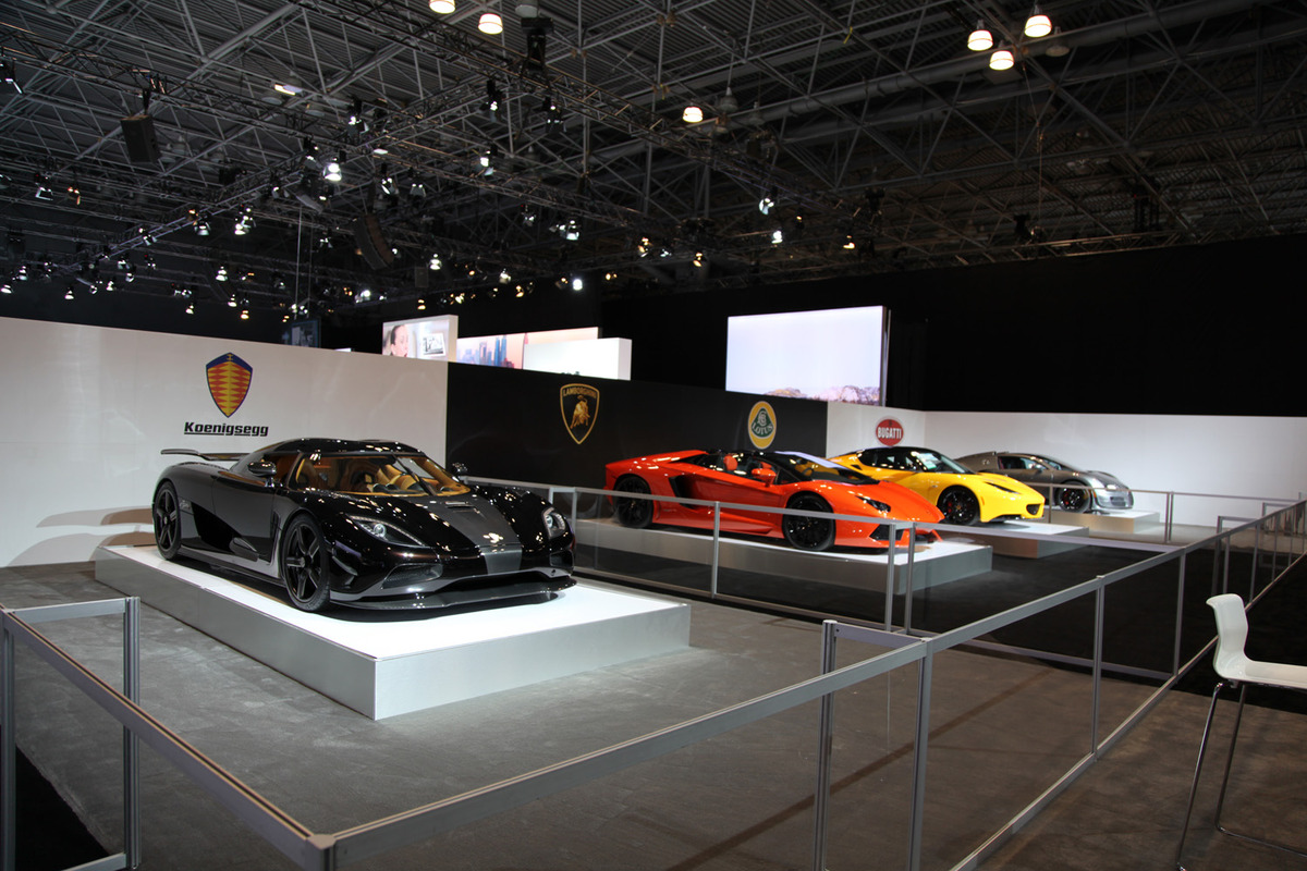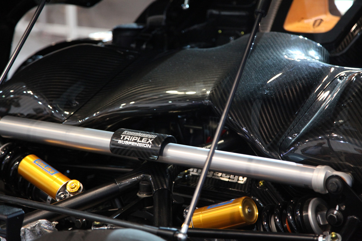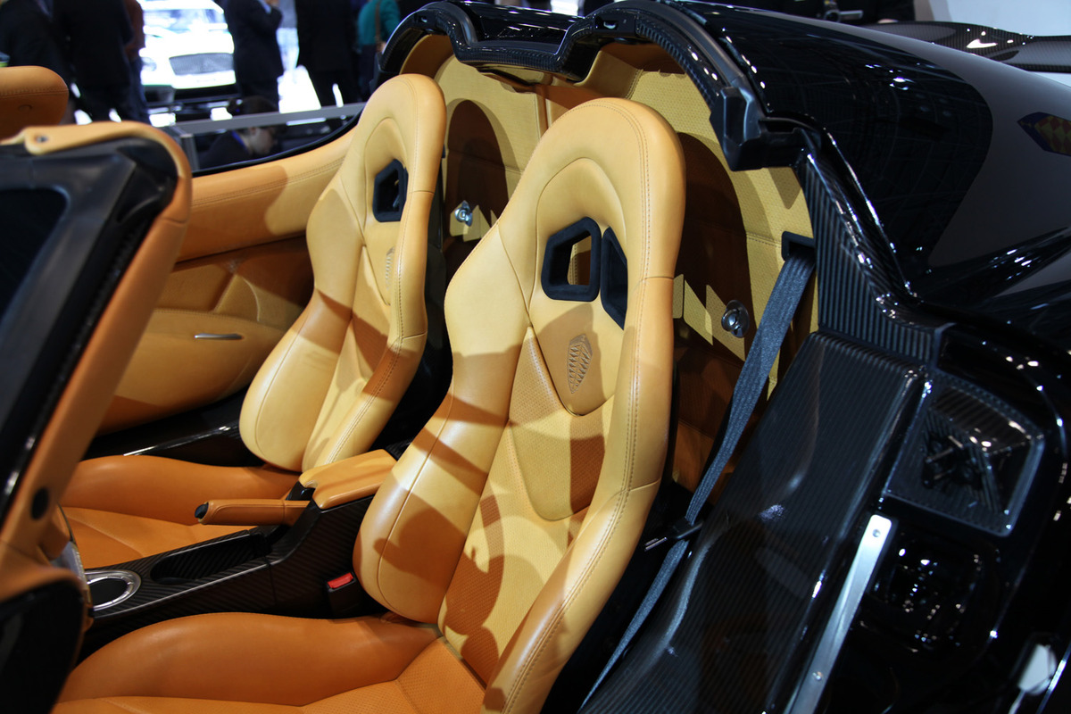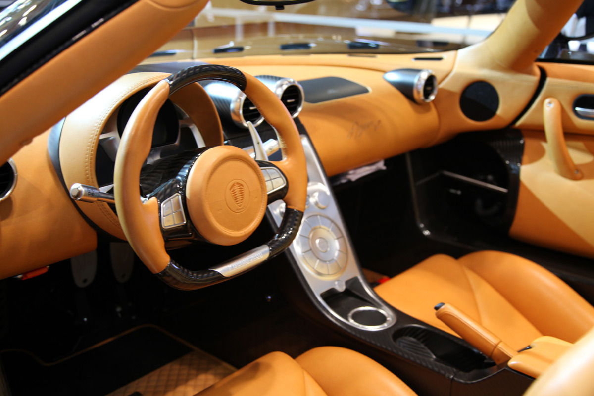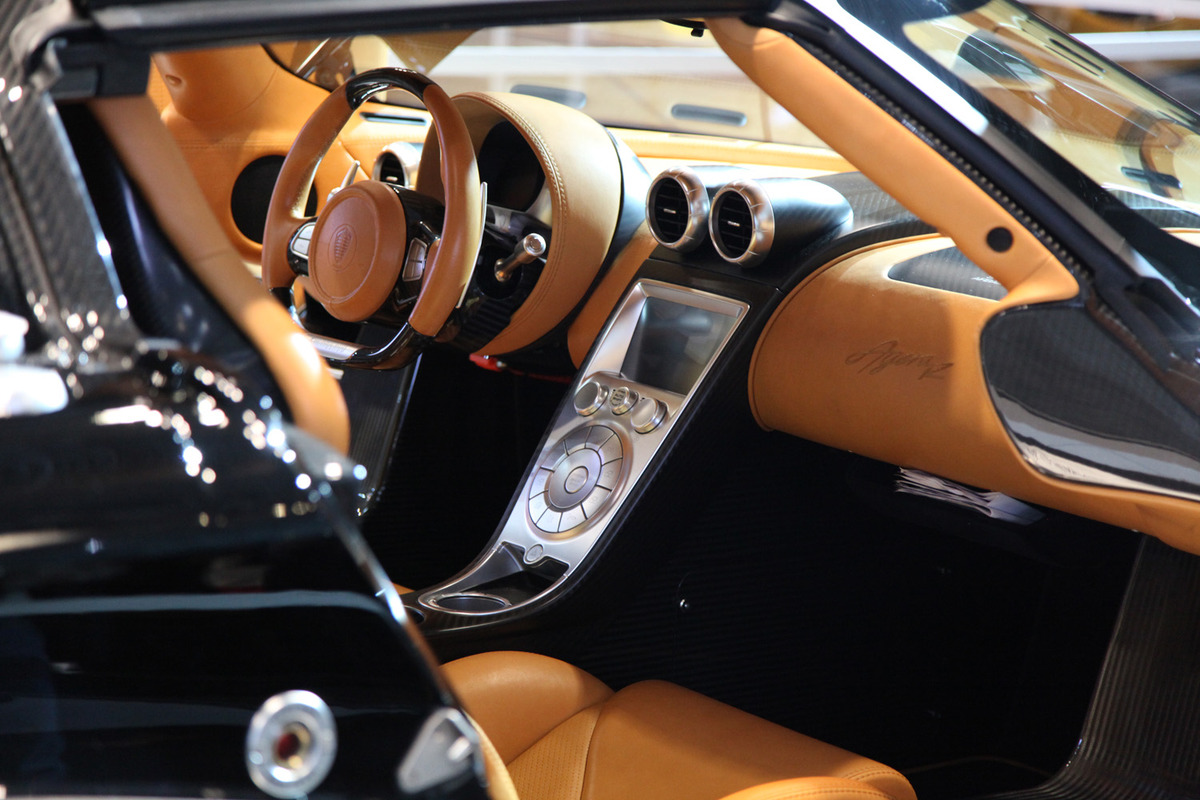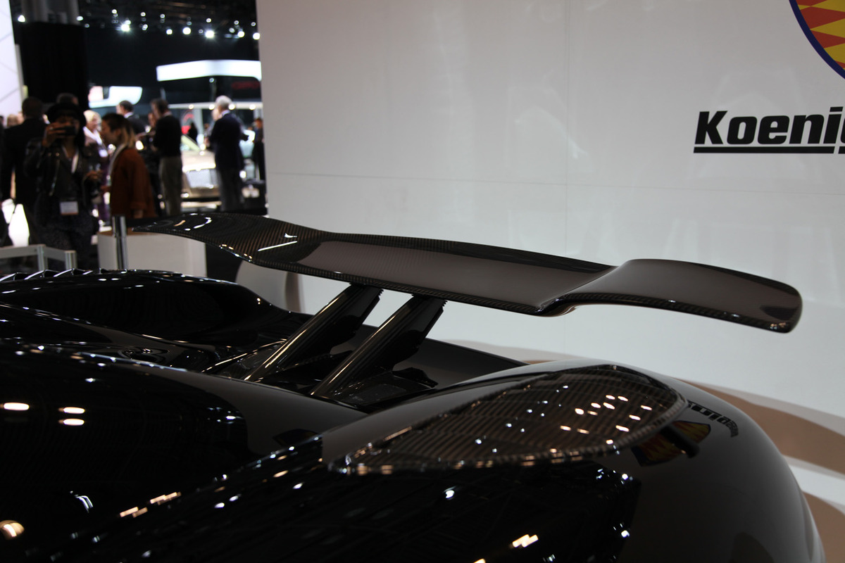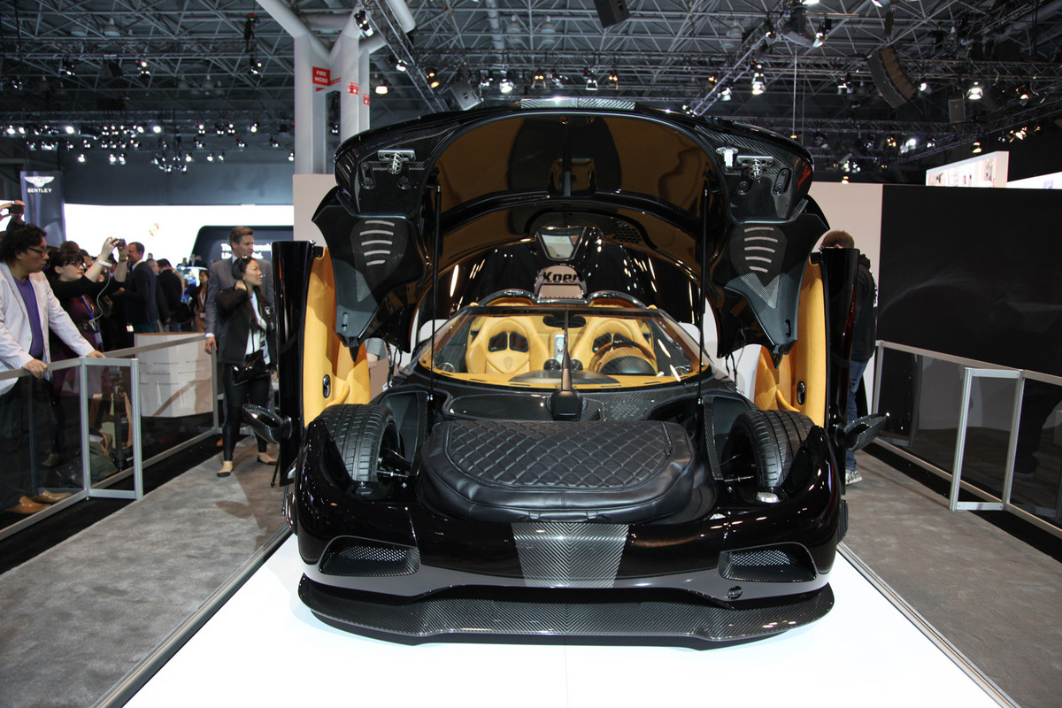 因此,面對今年熱鬧非凡的紐約車展(New York Motor Show),代理商Manhattan Motors租下一整個區塊,擺放橘色Lamborghini Aventador LP700-4 Roadster、鐵灰色Bugatti Veyron、黃色Lotus Evora與Bentley Continental GT3等最新車款,同時納入一部Koenigsegg Agera R,採用黑色塗裝搭配米色內裝,碳纖維套件貫穿全車內外,相當霸氣。動力部分,這部黑色瑞典超級跑車搭載獨立開發的5.0升V8雙渦輪增壓引擎,最大馬力可達1,140HP,扭力峰值有122.4kgm,輔以與Cima合作研發、重量僅81公斤的七速雙離合器變速箱,百里加速僅需2.9秒便可完成、由靜止加速至時速200km/hr僅需7.5秒、衝刺達時速300km/hr更只需要21.19秒,極速則是上看440km/hr!