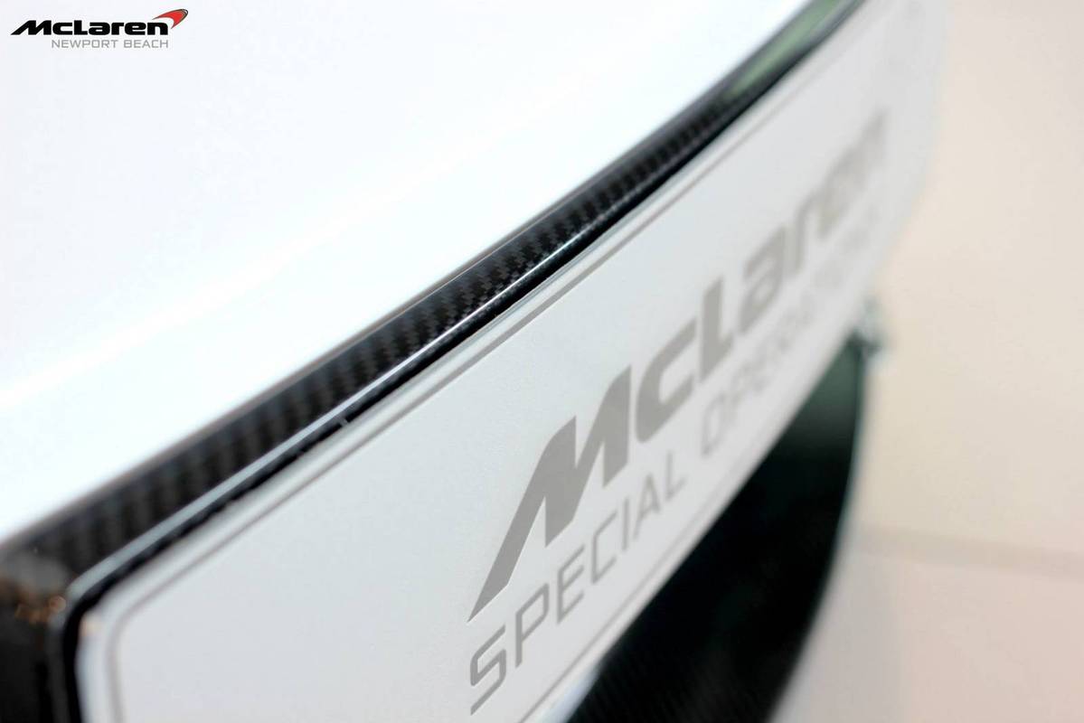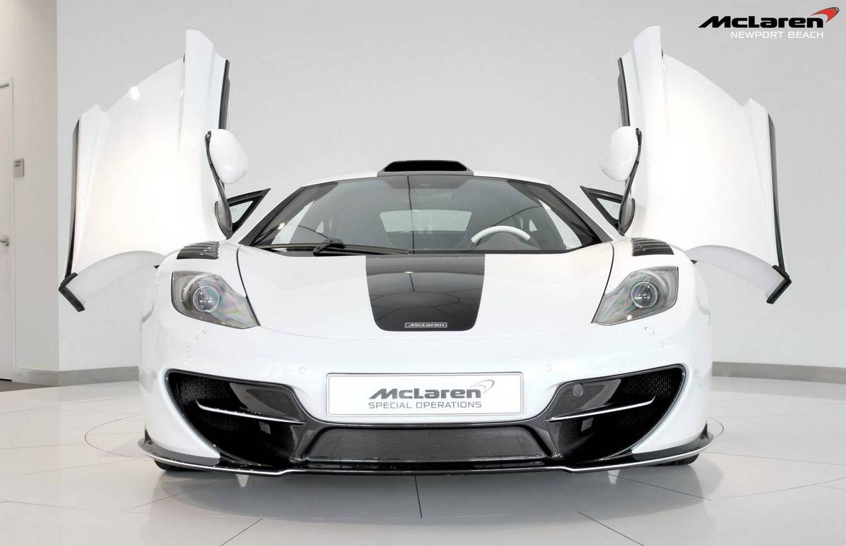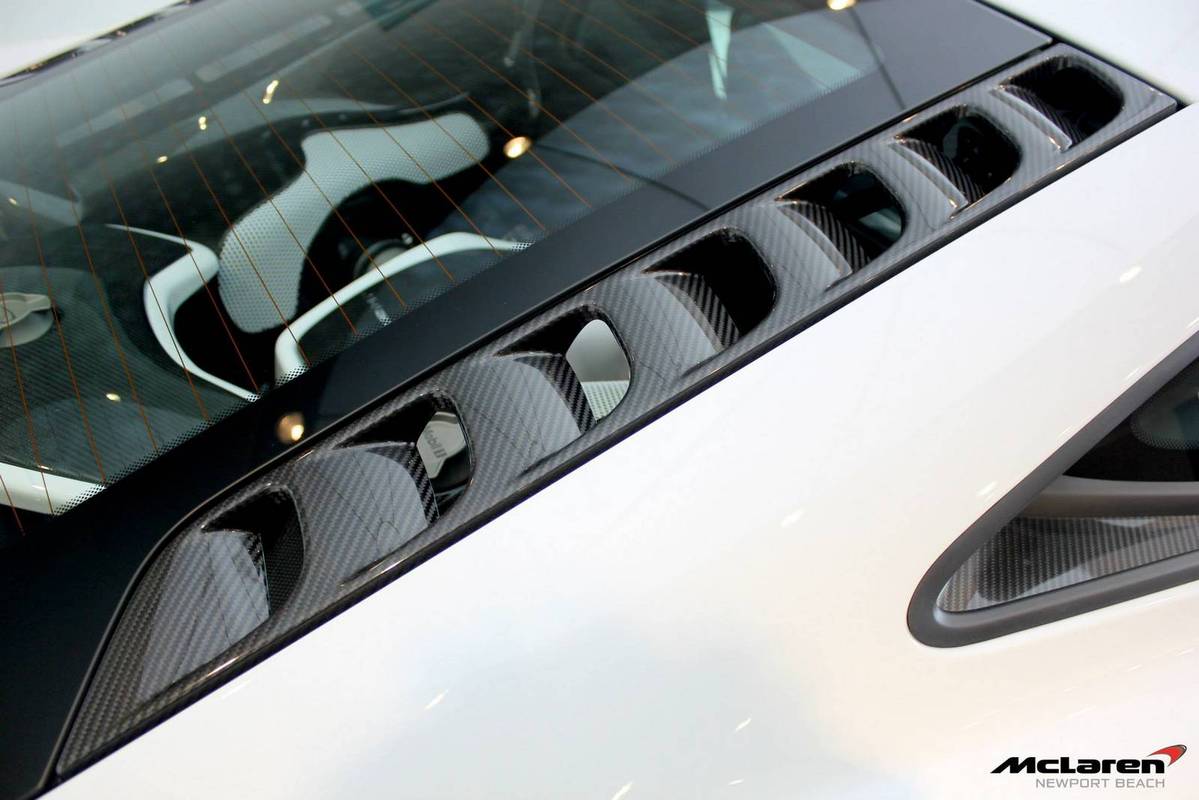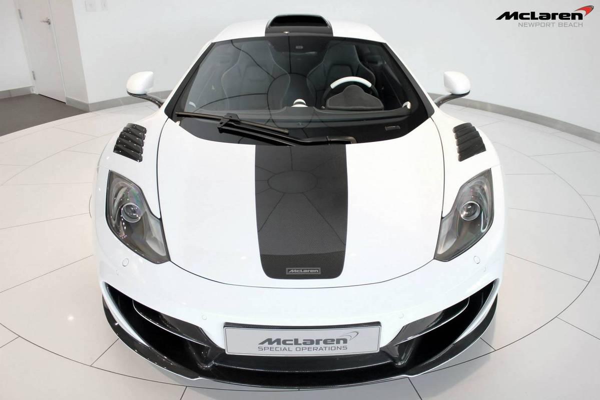 12C MSO概念車在很多地方都顯得與眾不同,諸如碳纖維前保險桿、後方空氣煞車、引擎蓋等等,在車頂的部分則有大型進氣口,提供引擎擁有足夠之空氣得以燃燒,這些氣口當然也提供了輪胎、剎車所需之冷卻效果,其白色塗裝可不是一般的白色,他們聲稱是”阿拉斯加鑽石白”,搭配大量碳纖維套件,與白色塗裝可說是絕配。內裝部分,碳纖維仍是遍布車室內,包括換檔撥片、車門飾板等等小細節,這組照片在McLaren Newport Beach的展示間裡,診所般乾淨的場地搭配這輛車,讓人震撼的久久 不能自己。