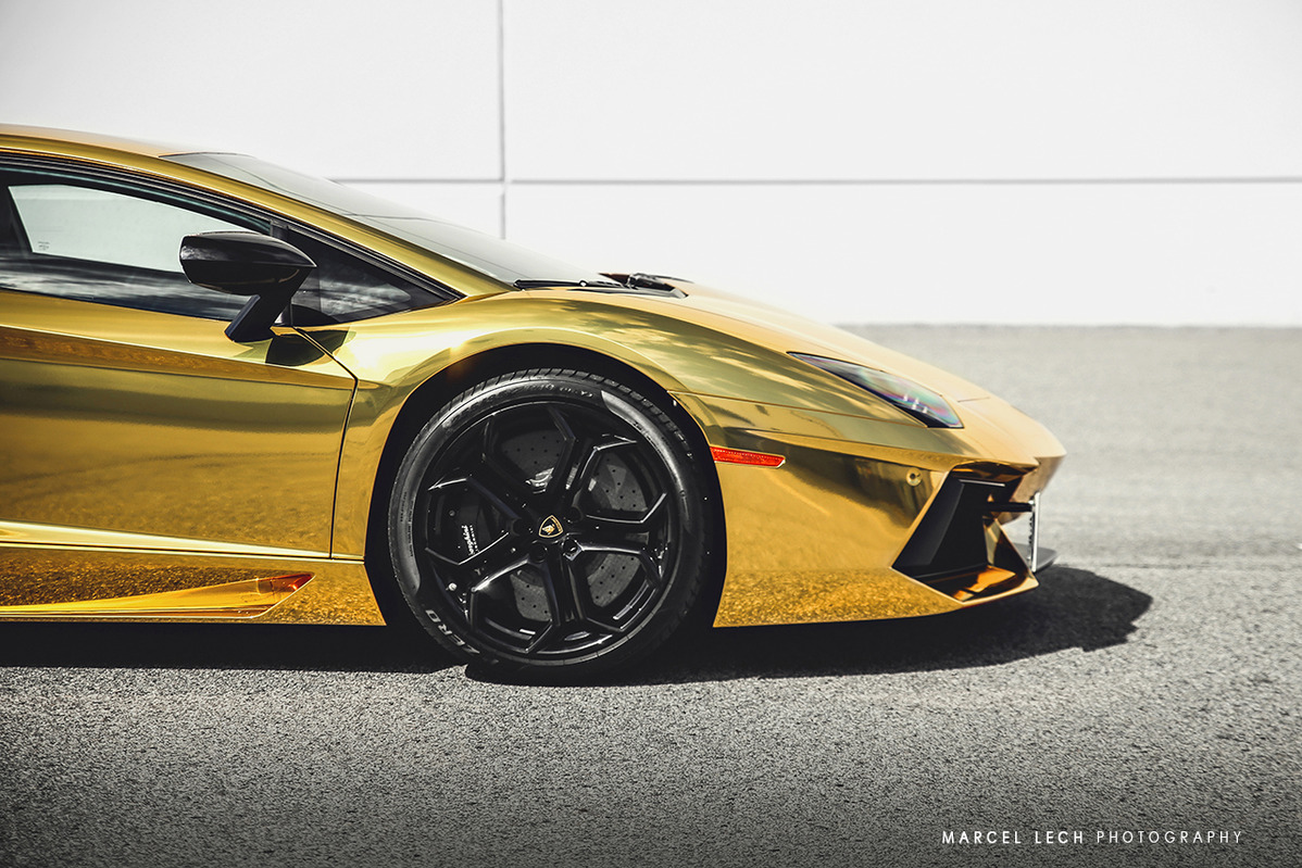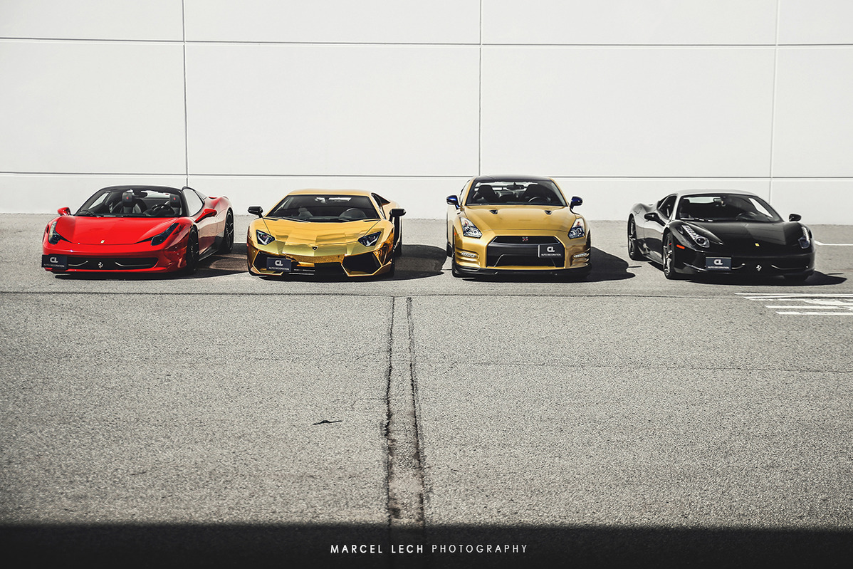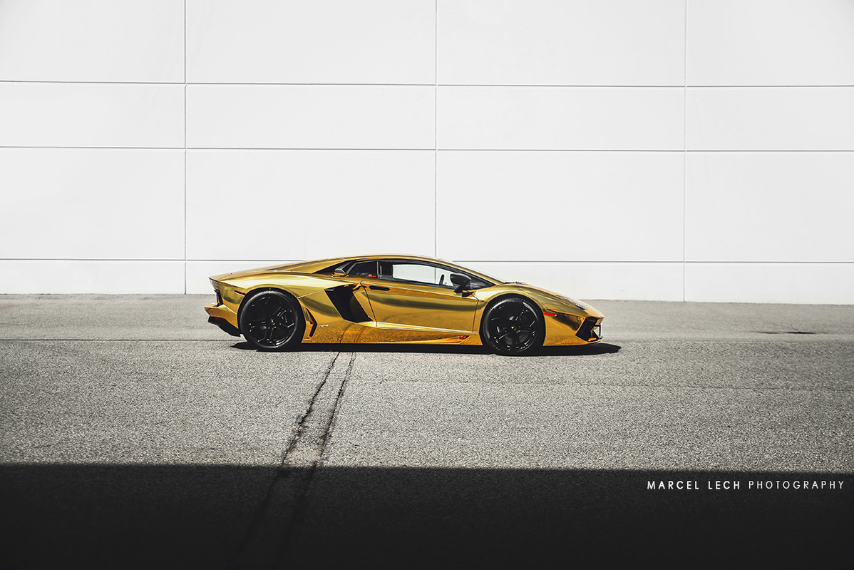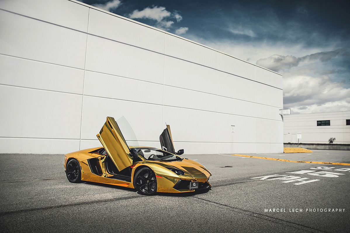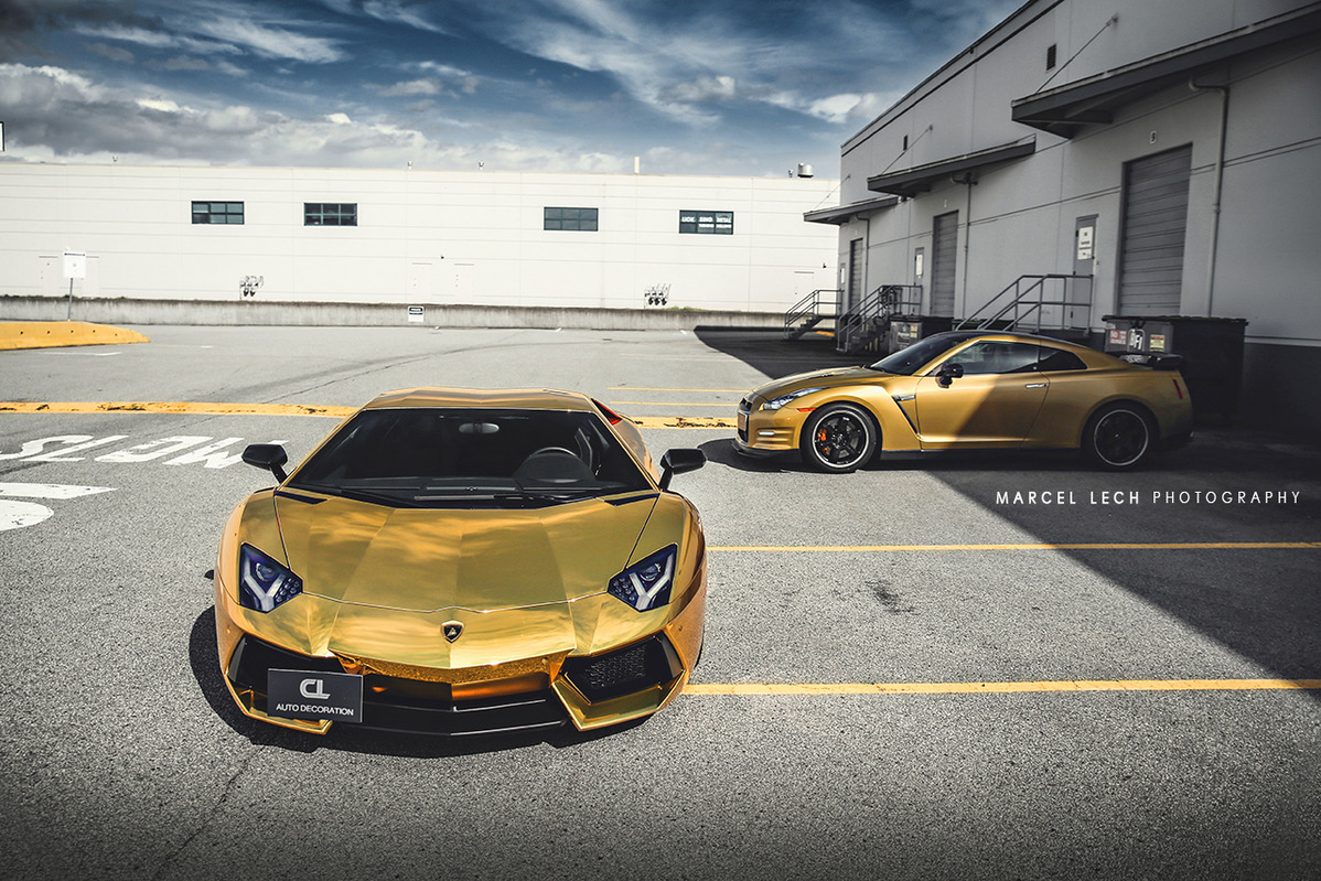 今天與各位分享知名攝影專家Marcel Lech於加拿大溫哥華(Vancouver, Canada)所進行的華麗拍攝圖集,現場找來黑色Ferrari 458 Italia、紅色Ferrari 458 Spider、東瀛戰神Nissan R35 GT-R與兩部義大利超級跑車旗艦Lamborghini Aventador LP700-4。眼前這部由貼膜專業廠CL Auto所操刀的Lamborghini Aventador LP700-4被施以全車電鍍金色貼膜,其餘大致上維持原廠配置。