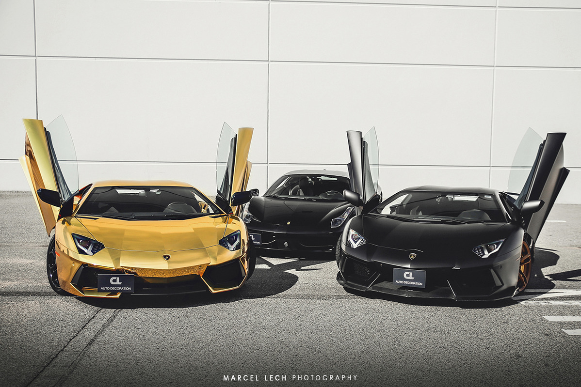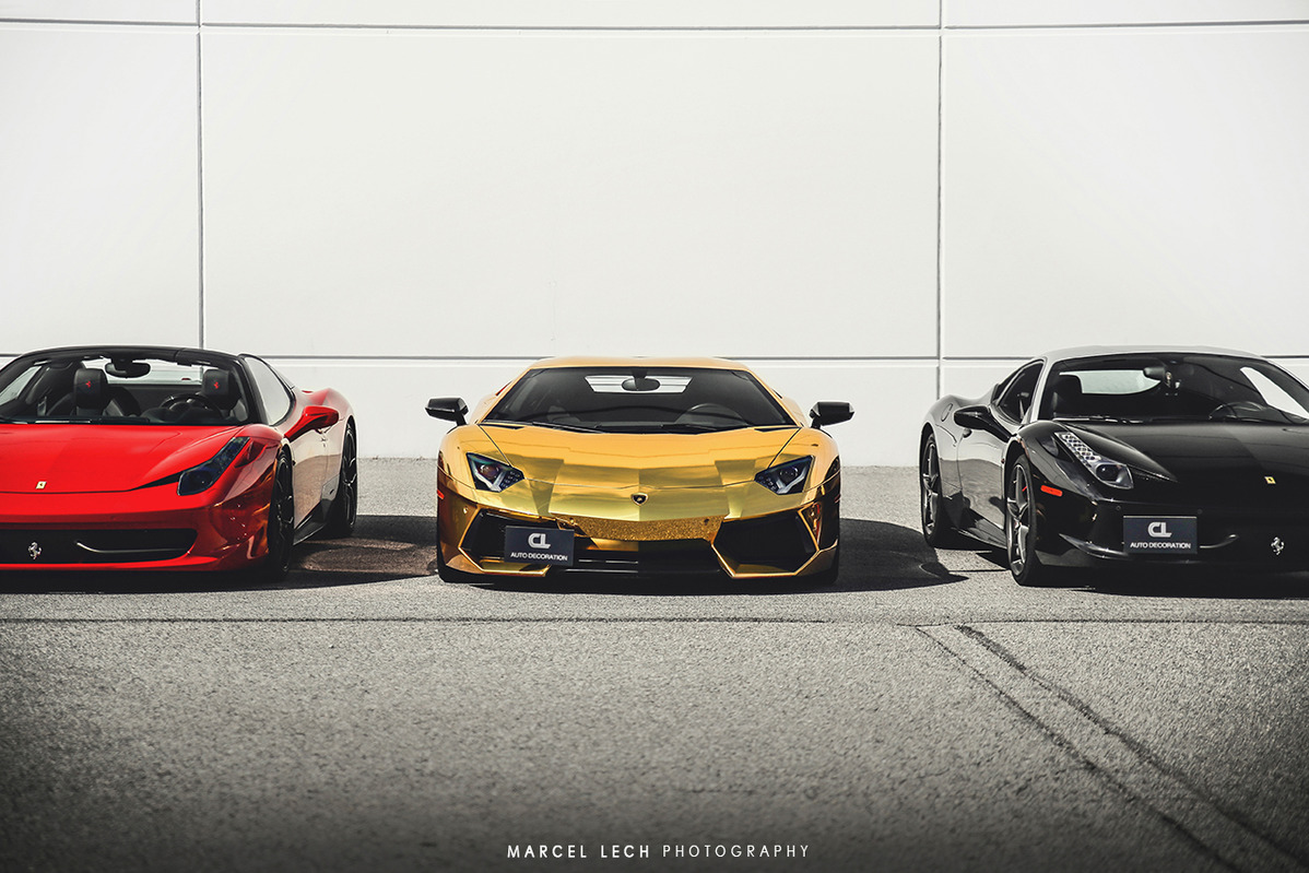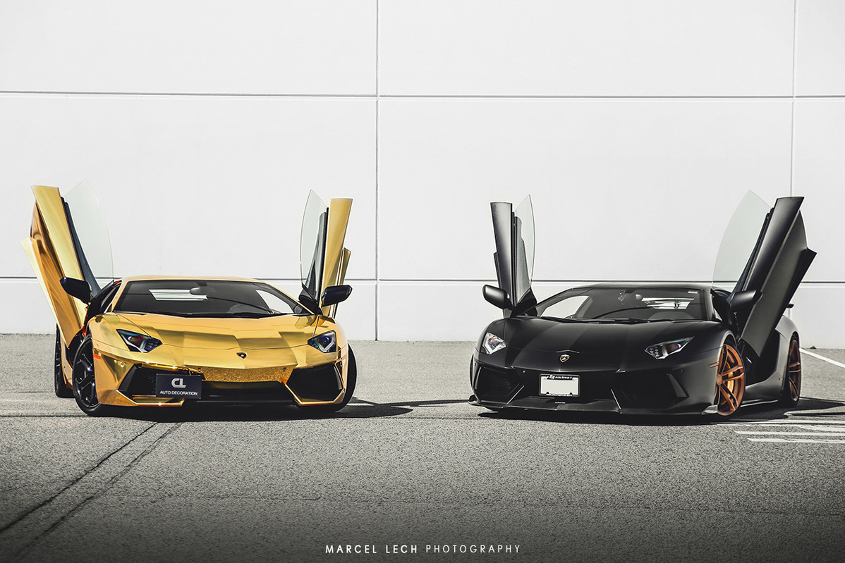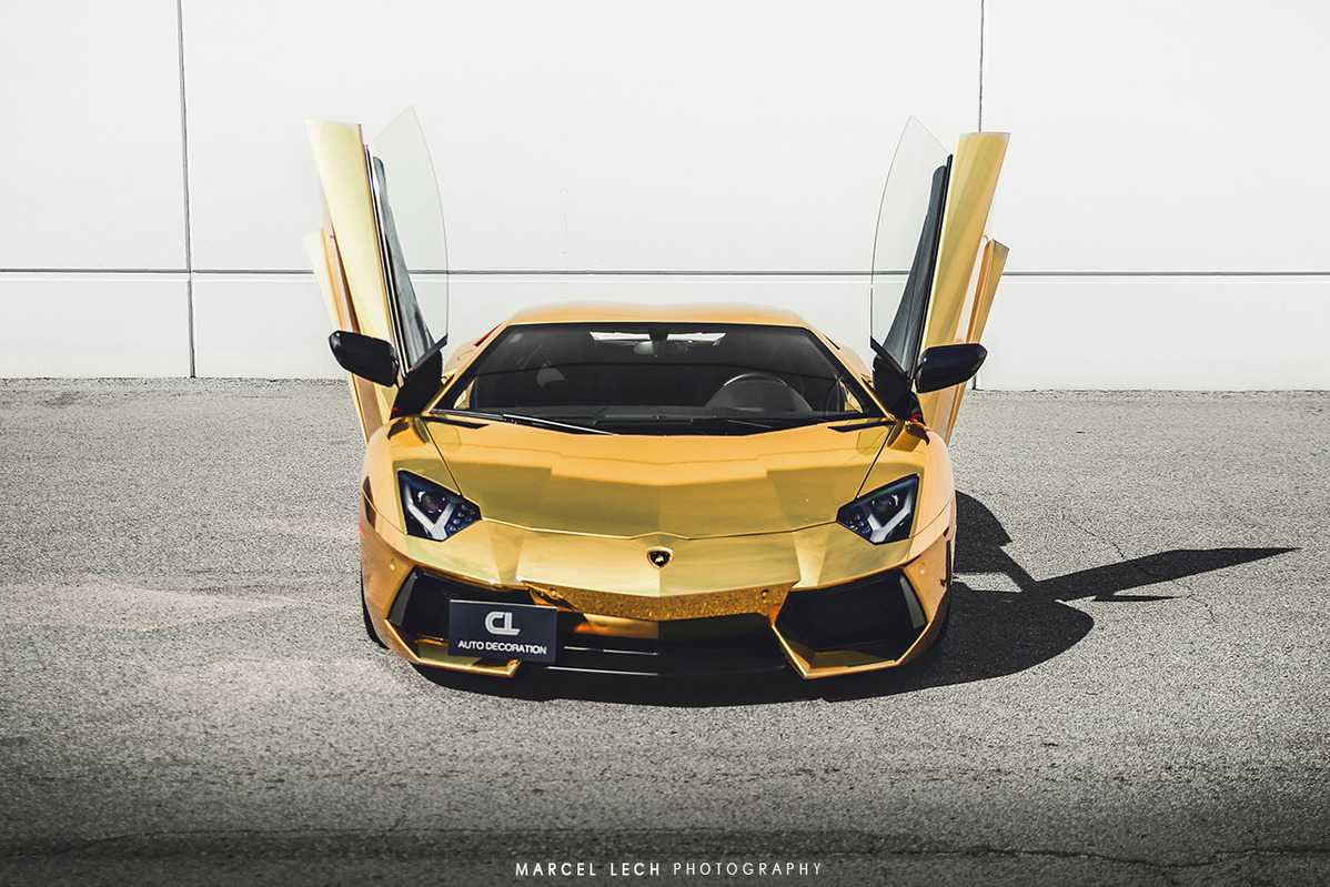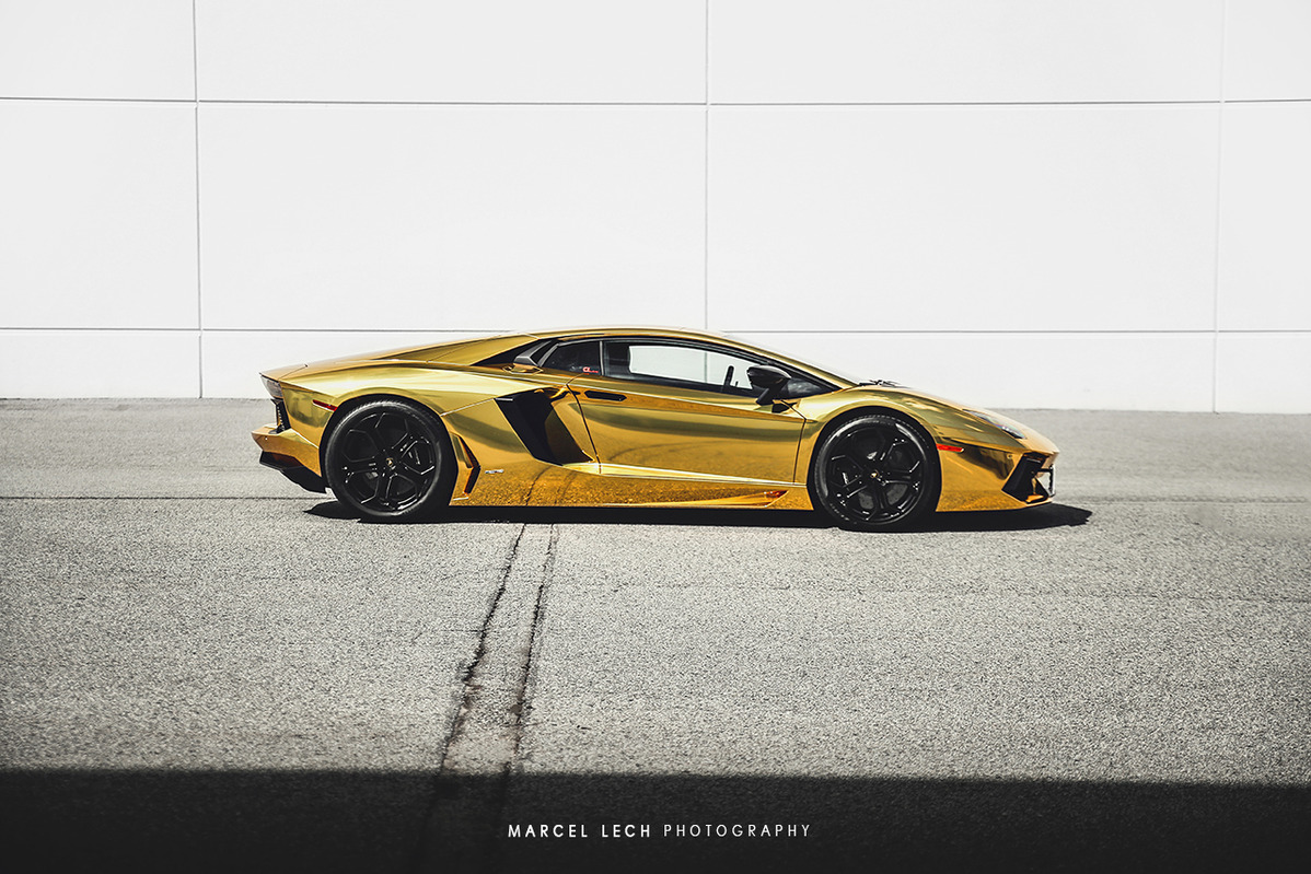 今天與各位分享知名攝影專家Marcel Lech於加拿大溫哥華(Vancouver, Canada)所進行的華麗拍攝圖集,現場找來黑色Ferrari 458 Italia、紅色Ferrari 458 Spider、東瀛戰神Nissan R35 GT-R與兩部義大利超級跑車旗艦Lamborghini Aventador LP700-4。眼前這部由貼膜專業廠CL Auto所操刀的Lamborghini Aventador LP700-4被施以全車電鍍金色貼膜,其餘大致上維持原廠配置。