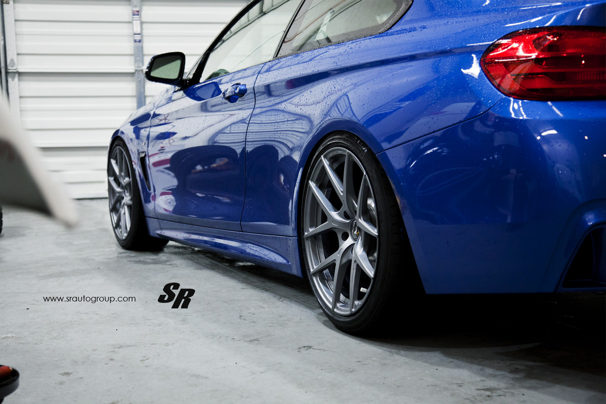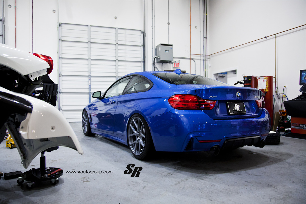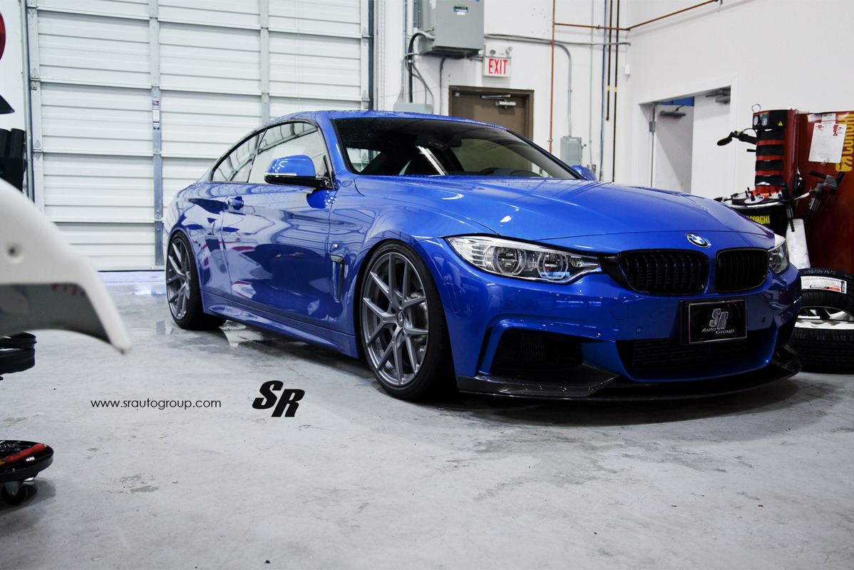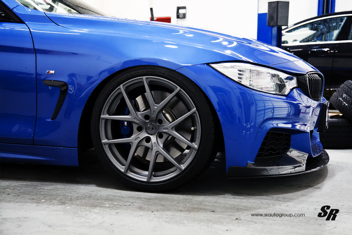 今天帶給各位由加拿大改裝廠SR Auto Group所操刀的藍色塗裝BMW F32 435i雙門跑車,於出廠時便選配了M Sport空力套件,在專屬Estoril Blue寶藍色塗裝的襯托下便已跑格十足,而改裝廠另外換裝黑色水箱護罩、M Performance前下巴、側裙組與後下擾流板等部品,輪圈選用知名品牌Vorsteiner出品、型號V-FF 101的款式,尺寸為前19x8.5J、後19x10J的前後配設定,圈面採用質感極佳的槍灰色塗裝,再透過高低軟硬可調式避震器組的換裝將車身降低,讓這部雙門跑車更具侵略性。