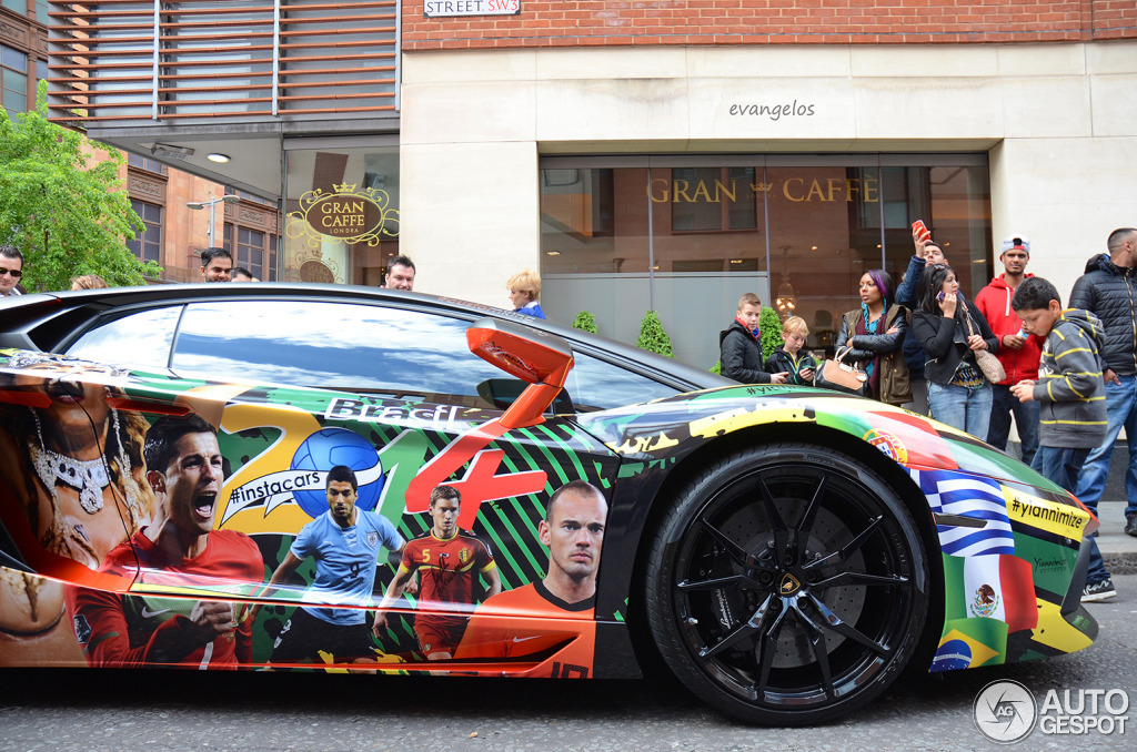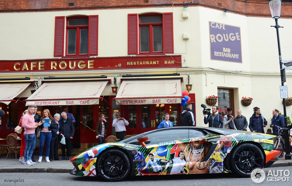 國際足球總會(FIFA : Fédération Internationale de Football Association)即將在今年六月12日開始舉辦全球矚目的2014年世界盃足球賽(2014 World Cup),首場比賽由巴西(Brazil)隊出戰克羅埃西亞(Croatia),而如果你是位巴西隊粉絲,想必你會喜歡眼前這部由攝影專家Evangelos Photography在英國倫敦(London, England)街頭擄獲的義大利超級跑車Lamborghini Aventador LP700-4!該部Lamborghini Aventador LP700-4原本是Arancio Argos橘色塗裝,在貼膜專業廠Yiannimize-Refined的獨到設計下,車身佈滿五顏六色的圖騰,包含知名球星與數種國旗,停在街頭立刻吸引大批民眾圍觀。在這部V12超跑身上的球星包含阿根廷(Argentina)隊的利昂內爾・梅西(Lionel Messi)、德國(Germany)隊的梅蘇特・厄齊爾(Mesut Ozil)、西班牙(Spain)隊的安德烈斯・伊涅斯塔(Andres Iniesta)、烏拉圭(Uruguay)隊的路易斯・阿爾貝托・蘇亞雷斯(Luis Suarez)、比利時(Belgium)隊的揚・費爾通亨(Ian Vertoghen)與荷蘭(Holland)隊的衛斯理・斯奈德(Wesley Sneijder),當然也包含葡萄牙(Portugal)隊、同時也是Lamborghini Aventador LP700-4車主之一的巨星克里斯蒂亞諾・羅納度(Cristiano Ronaldo)!