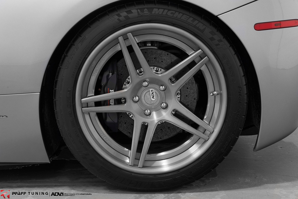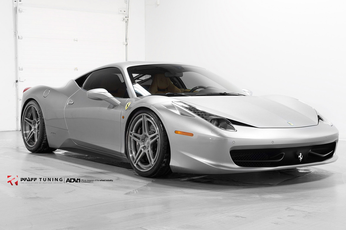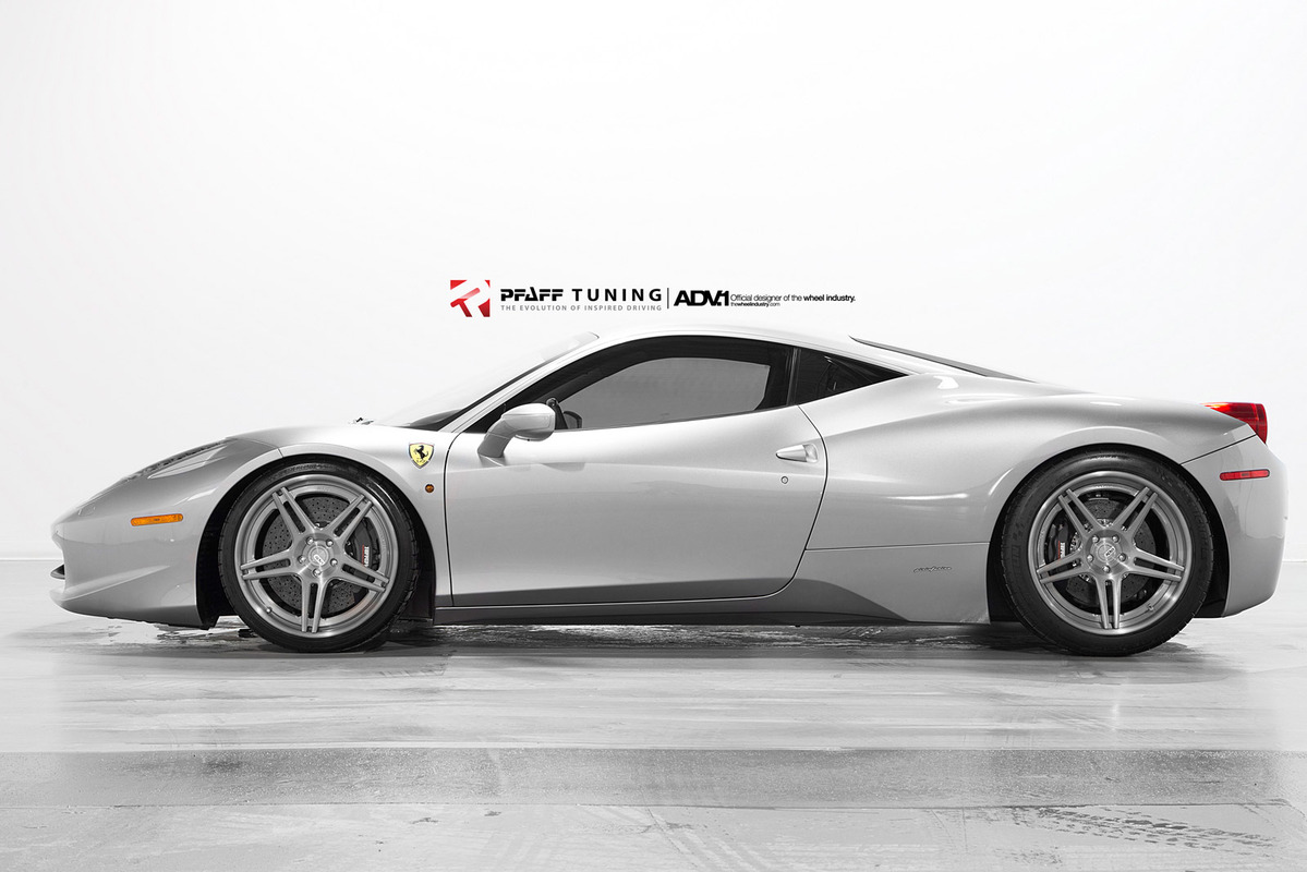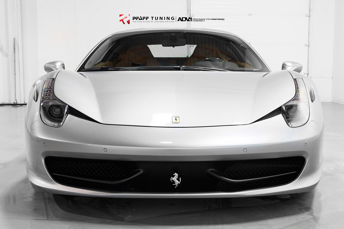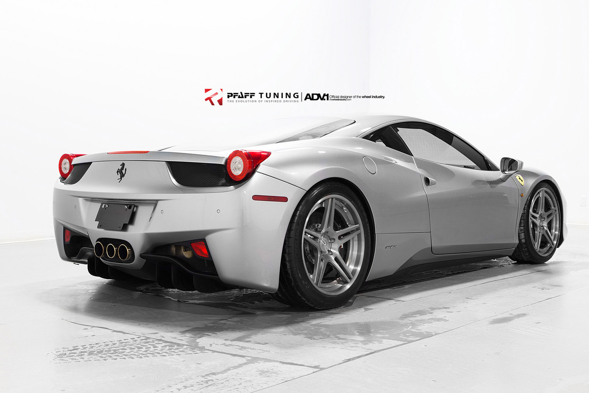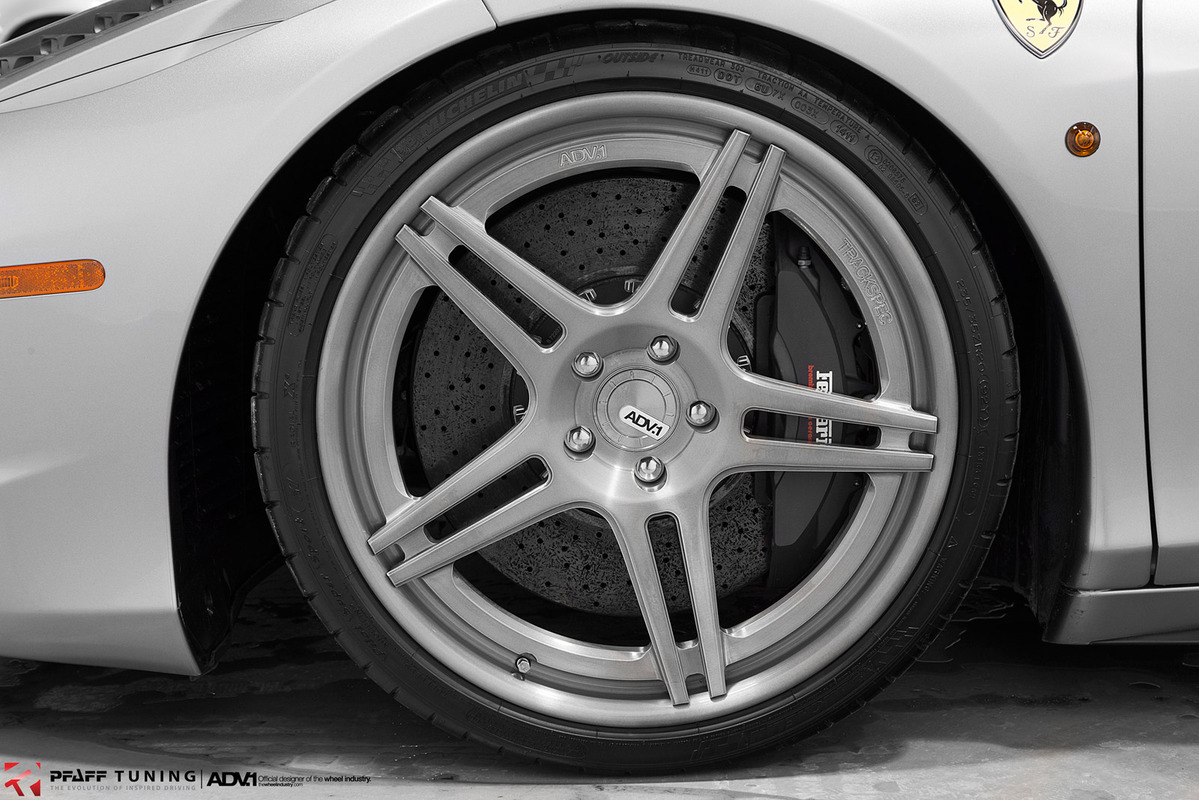 今天與各位分享一部由改裝廠Pfaff Tuning所呈現的銀色塗裝Ferrari 458 Italia,該稀有塗裝乃Ferrari旗下金屬烤漆的一種,取名Argento Nurburgring,有別於Grigio Alloy銀藍色、Grigio Titanio Metallizzato金屬鈦灰色等所呈現出的視覺效果,用另外一種方式詮釋Ferrari 458 Italia的絕美線條。除了車身採用特殊的銀色塗裝外,另外選擇內斂低調的黑色塗裝煞車卡鉗,再換上知名品牌ADV.1 Wheels、型號ADV05 TS的輕量化輪圈,中心採用金屬鈦色,尺寸為前20x9J、後21x11J的前後配設定,搭配Michelin Pilot Super Sport高性能跑胎。這款ADV.1輪圈在造型方面有點類似御用品牌Novitec、型號NF3的五幅雙肋款式,走簡單俐落的高張力風格,別具一番風味。