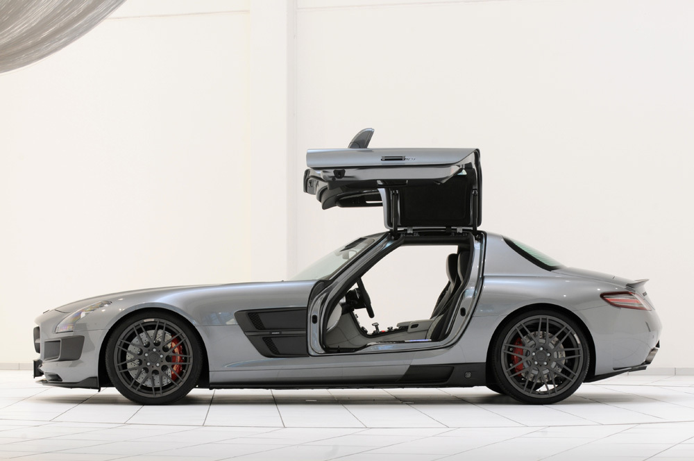 眼前這部Imola Grey鐵灰色Mercedes Benz SLS AMG乃一部2014年款式全新車,在步出Mercedes Benz AMG工廠後,便被直接送到知名改裝廠Brabus,換上諸多精裝部品。這部鷗翼絕美德國超跑於出廠時便已加選許多精緻配備,包含AMG碳纖維內裝飾板、Bang & Olufsen BeoSound頂級音響系統與電動調整型座椅等,然而卻略過輪圈與進階操控等部品,畢竟多選的某些東西到了Brabus之後還是會被移除。進到Brabus改裝廠內,首先對外觀部分進行塑造,換上Brabus Star版本空力套件,包含碳纖維前下巴、前氣壩飾蓋、側裙組、後保桿進氣孔飾蓋、後擾流尾翼與Brabus字樣水箱護罩等,再加上Brabus Widestar寬車體輪弧套件,將車寬增加約30mm,讓車尾視覺更顯霸氣。