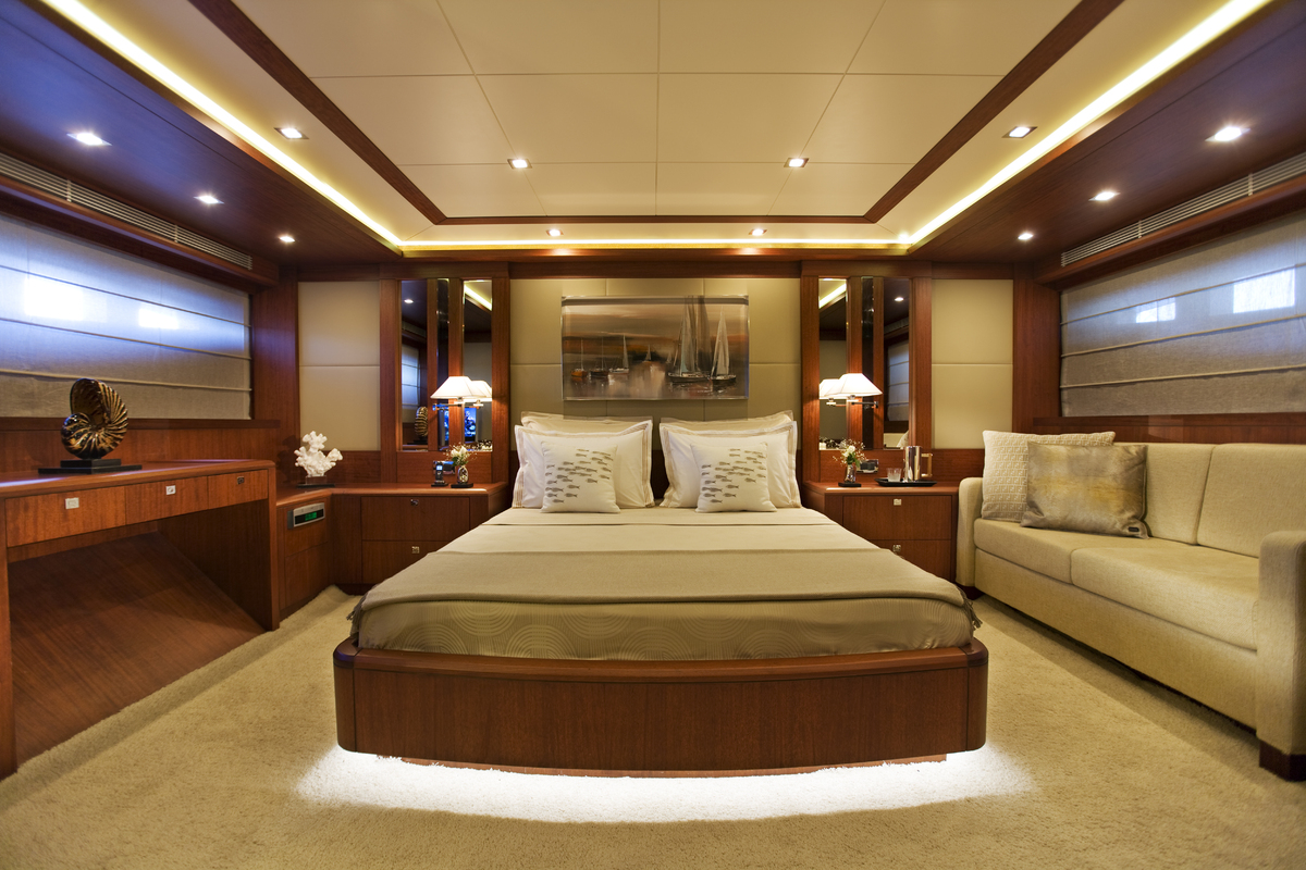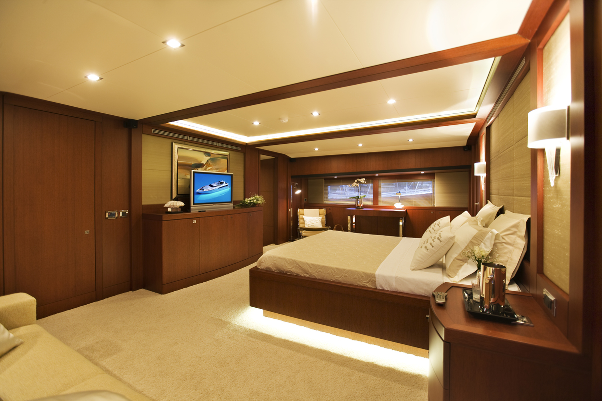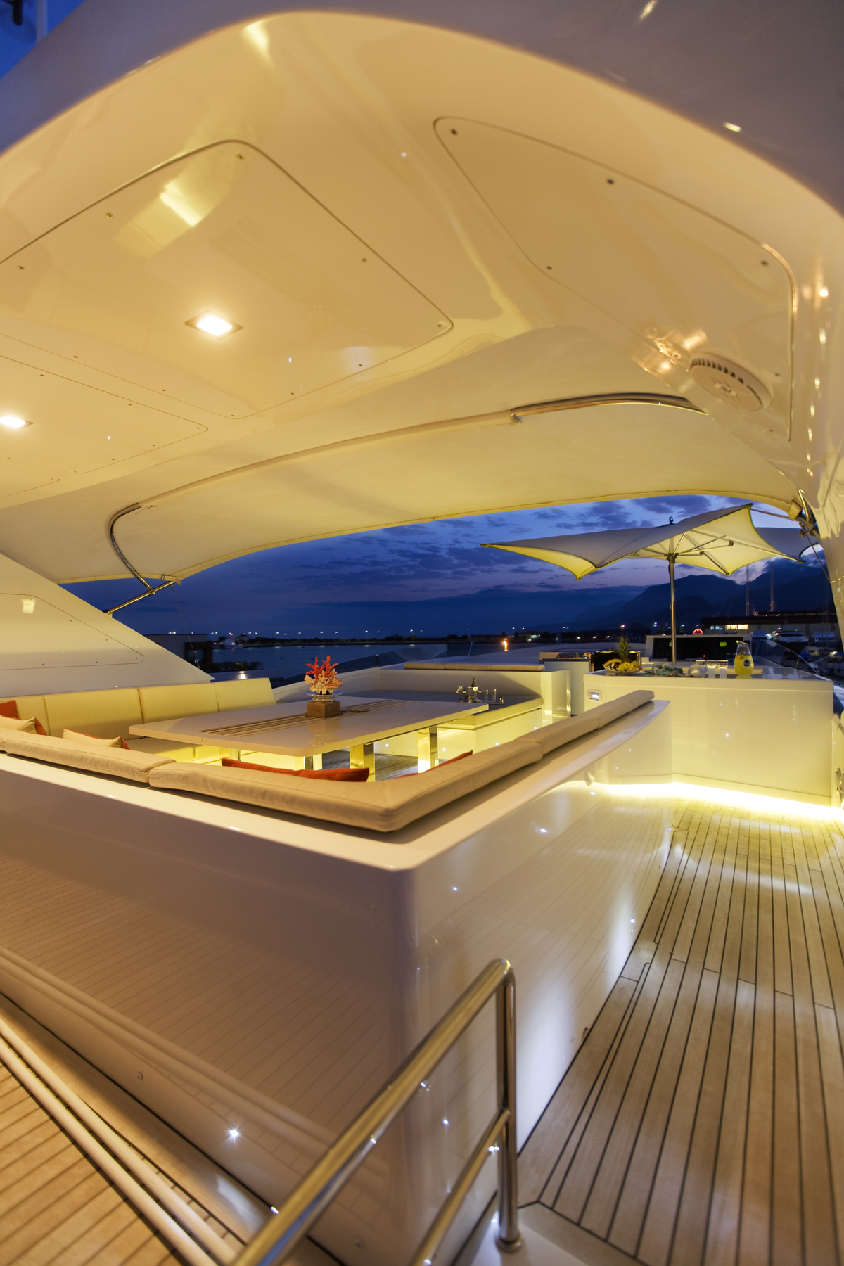 雖然這部遊艇於2004年出廠,但是配備方面絲毫不含糊,在船艙內配有精緻客房、衛浴設備、主臥室與VIP大套房,同時納入液晶電視、頂級音響系統、i-Pod連接裝置與無線網路等3C配備,豪華卻不雜亂,簡約中帶有高品味質感。由於訂製遊艇的過程較為繁雜,因此全球各地中古遊艇的交易量不小,而這種看得到、摸得到,甚至會提供試乘或試駕的中古良品,對於初次接觸海上活動的顧客們來說,方便性大增。