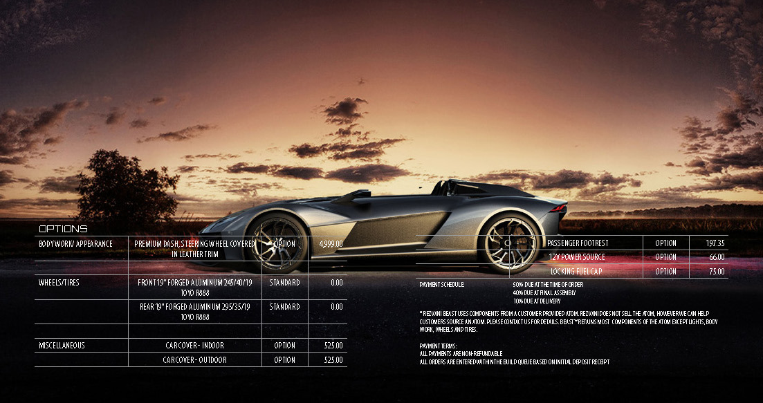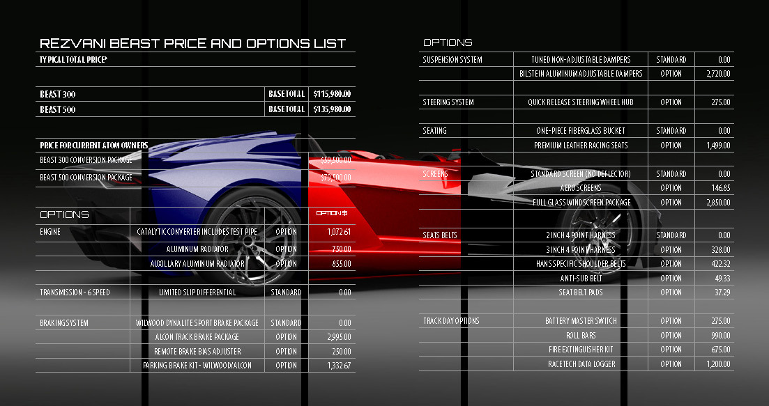 售價方面,Rezvani Beast 300目前開出$119,000美元的價格,而進階版本Beast 500則視選用配備之情況,從$139,000美元開始往上加。另外,Rezvani也開放Ariel Atom送進他們的工廠進行Beast 300或Beast 500套件的完整改裝,價格分別為$49,000與$69,000美元。
