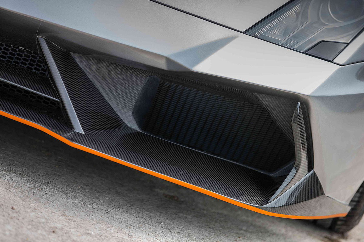外觀方面,ASPEC替這部V10超跑開發出前所未見的空力套件,包含全新設計的前保桿、開孔式樣前引擎蓋、前側定風翼、較寬的前葉子板、後下擾流板、後保桿護網與後上擾流小鴨尾翼,同時再將下緣施以橘色線條點綴,再加上造型突出的側裙組等部品,共計27件,全由碳纖維材質或合成纖維打造而成。另外,ASPEC選擇自家型號VF60的三片式鍛造20吋輪圈,造型有點類似Lamborghini Huracán LP610-4的標準款Giano,但是ASPEC聲稱這靈感是來自經典車款Lamborghini Diablo的環形輪圈。