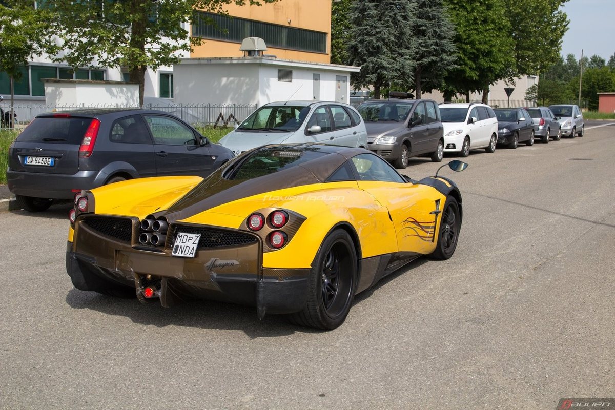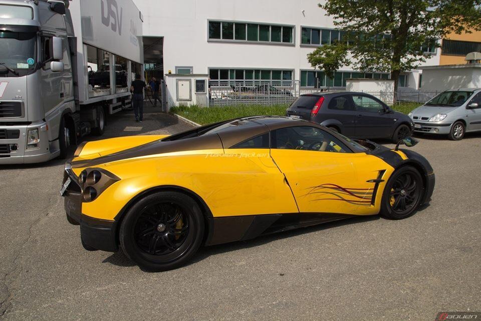 成立於1992年的義大利超級跑車廠Pagani算是圈內較新生代的品牌,然而,從初期僅10部的年產量成長至今,現在每年約可供應全球各地層峰玩家約60部車輛,而最近數個月公司將重心放在Pagani Huayra的生產上,以便在最短時間將車輛交到癡心等候的多金買家手中。隨著產能的持續擴充,Pagani已經陸續取得各國的車測標章,而Pagani Huayra在前陣子正式通國美國測試法規、能夠順利領牌上路,因此後續銷售數字與需求量持續看漲,Pagani勢必對此有所因應。另外,購買Pagani Huayra的車主當中,有不少都希望打造出獨一無二的版本,舉凡車身顏色、內裝皮革、動力與操控套件,選擇客製化打造的人們不在少數,而眼前這部由網友Flavien Jaouen所擄獲的Pagani Huayra便是其中之一。由照片判斷,這部Pagani Huayra採用特別的黃色車身塗裝,並將環繞全車的碳纖維板件施以少見的咖啡色塗裝,再加上局部車體彩繪的點綴,相當與眾不同。附帶一提,Pagani Huayra搭載代號M158、來自Mercedes Benz AMG的6.0升雙渦輪增壓V12引擎,由德國阿佛特巴(Affolterbach, Germany)最有經驗的工程師們調校,最大馬力可達720HP,扭力峰值可達102kgm,採用七速序列式變速箱與後輪驅動配置,百里加速由於後輪嚴重打滑而為看似沒有很出色的3.3秒,但極速高達370km/hr便是狂暴實力的最佳證明。